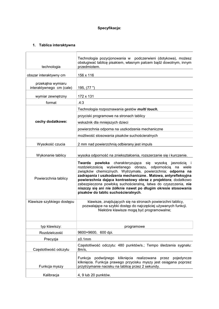 Specyfikacja: 1. Tablica interaktywna technologia obszar interaktywny cm Technologia pozycjonowania w podczerwieni (dotykowa), możesz obsługiwać tablicę pisakiem, własnym palcem bądź dowolnym, innym przedmiotem. 156 x 116 przekątna wymiaru interaktywnego cm (cale) 195, (77 ") wymiar zewnętrzny 172 x 131 format .4:3 Technologia rozpoznawania gestów multi touch, przyciski programowe na stronach tablicy cechy dodatkowe: wskaźnik dla mniejszych dzieci powierzchnia odporna na uszkodzenia mechaniczne możliwość stosowania pisaków suchościeralnych Wysokość czucia 2 mm nad powierzchnią odbierany jest impuls Wykonanie tablicy wysoka odporność na zniekształcenia, rozszerzanie się i kurczenie. Powierzchnia tablicy Twarda powłoka charakteryzująca się wysoką jasnością i rozdzielczością wyświetlanego obrazu, odpornością na wiele związków chemicznych. Wytrzymała, powierzchnia; odporna na zadrapania i uszkodzenia mechaniczne.. Matowa, antyrefleksyjna powierzchnia dająca kontrastowy obraz z projektora; dodatkowo zabezpieczona powłoką suchościeralną, łatwa do czyszczenia, nie niszczy się ani nie żółknie nawet po długim okresie stosowania pisaków do tablic suchościeralnych. Klawisze szybkiego dostępu klawisze, znajdujących się na stronach powierzchni tablicy, pozwalające na szybki dostęp do najczęściej używanych funkcji. Niektóre klawisze mogą być programowalne; typ klawiszy: programowe Rozdzielczość Precyzja 9600×9600,600 dpi. ±0.1mm Częstotliwość odczytu Częstotliwość odczytu: 480 punktów/s.; Tempo śledzenia sygnału: 8m/s, Funkcja myszy Funkcja podwójnego kliknięcia realizowana przez pojedyncze kliknięcia. Funkcja prawego przycisku myszy jest osiągana poprzez przytrzymanie nacisku na tablicę przez 2 sekundy. Kalibracja 4, 9 lub 20 punktów. Zasilanie Energia jest pobierana z komputera za pośrednictwem kabla USB. Pobór energii Połączenie z komputerem Wymagany system operacyjny ≤1 W. 10-metrowy kabel USB. Opcjonalnie przedłużacz USB pozwalający przyłączyć kabel USB do dodatkowych 15 metrów kabla sieciowego. Windows XP/2003/Vista/7 32 i 64 bit,, Linux, Mac 10.X Oprogramowanie Oprogramowanie ,biblioteka źródłowa , darmowy program dla nauczycieli Wyposażenie 2 bezkolorowe pióra interaktywne, wskaźnik o dł. 100 cm, 1 zestaw do montażu naściennego, płyta instalacyjna CD (zawierająca sterowniki, bibliotekę załączników oraz oprogramowanie) oraz 2 czarne pisaki dla powierzchni suchościeralnych oraz gumka. Certyfikaty produktu Gwarancja CE、FCC、ROHS. 3 lata na tablicę, 1 rok na pozostałe komponenty Uchwyt ścienny • • • • • Mocowanie ścienne Ramię do projektora z wysięgnikiem o maks. długości 120 cm Ramię do projektora obraca się o 90º wokół punktu osadzenia - Możliwość złożenia wysięgnika z projektorem do boku tablicy. płynna regulacja wysokości tablicy Wszystkie ruchome elementy statywu można regulować, Projektor multimedialny Wyświetlacz 3 x 1.6 cm (0.63") p-Si LCD Panel with MLA Rozdzielczość natywna 1024 x 768 (XGA) Aspect Ratio 4:3 Jasność 2600 ANSI Lumens (approx. 80% in Eco Mode ) Kontrast 2000:1 Moc lampy 185 W AC (145 W AC Eco Mode ) Żywotność lampy [godz] 5000 (6000 Tryb Eco ) Lens F= 2, f= 0 mm Współczynnik projekcji 0.47 : 1 Odległość projekcji [m] 0.6 – 1.1 Zoom Digital Zoom Ustawienie ostrości Ręczne Obsługiwane rozdzielczości 1920 x 1080 (HDTV 1080i/60; HDTV 1080i/50); 1680 x 1050 (WSXGA+); 1600 x 1200 (UXGA); 1600 x 900 (WXGA++); 1440 x 900 (WXGA+); 1400 x 1050 (SXGA+); 1366 x 768 (WXGA); 1360 x 768 (WXGA); 1280 x 1024 (SXGA); 1280 x 1024 (MAC 23"); 1280 x 960 (SXGA); 1280 x 800 (WXGA); 1280 x 768 (WXGA); 1280 x 720 (HDTV 720p); 1152 x 870 (MAC 21"); 1152 x 864 (XGA); 1024 x 768 (XGA); 832 x 624 (MAC 16"); 800 x 600 (SVGA); 720 x 576 SDTV 480p/480i; 720 x 480 SDTV 576p/576i; 640 x 480 (VGA/MAC 13") Częstotliwość Horizontal: 15–100 kHz (RGB: 24 kHz– 100 kHz); Pionowa: 50 – 120 Hz Wejścia/wyjścia: Wejście: 2 x Mini D-sub 15-pin, kompatybilne z component (YPbPr) HDMI™ Wejście: 1x HDMI® (głębia koloru, synchronizacja obrazu i dźwięku) Video Wejście: 1 x RCA S-Video Wejście: 1 x Mini DIN 4-pin Audio Wejście: 2 x 3.5 mm Stereo Mini Jack; 2 x RCA Stereo Wyjście: 1 x 3.5 mm Stereo Mini Jack (variable) PC Control Wejście: 1 x D-Sub 9 pin (RS-232) (męskie) LAN 1 x RJ45 USB 1 x Type B; 2 x Type A (USB 2.0 high speed) Video Signals PAL; PAL60; NTSC; SECAM; NTSC 4.43; PAL-M Pilot: Prezentacja i sterowanie myszką Głośniki [W] 1 x 10 (mono) Gwarancja – 3 lata Dwa głośniki + subwofer do instalacji do zestawu interaktywnego . Zestaw aktywny z 2-kanałowym wzmacniaczem, wejściem stereo (RCA), regulacją głośności oraz 2-punktowym korektorem Moc RMS 2 x 10 W Skuteczność 100 dB Głośnik wysokotonowy Kopułkowy Głośnik niskotonowy 4" Pasmo przenoszenia 70 Hz - 20 kHz Typ obudowy Wzmacniany plastik Wykończenie Obudowa z tworzywa sztucznego Złącza RCA/Terminale sprężynowe Dodatkowe dane Ruchomy uchwyt montażowy Wymiary Ok. 133 x 206 x 128mm Komputer stacjonarny z monitorem System operacyjny MS Windows 7 Professional 64 bit Płyta główna FOXCONN G41MXP G41 S775 mATX Procesor Intel Pentium Dual Core E5800 3.2GHz/2M LGA775 BOX Pamięć zainstalowana (pojemność) 2 GB Pamięć DDR3 2048MB Czytnik kart pamięci / FDD CZYTNIK KART I-BOX 62w1 + USB, CZARNY (wew) Napęd optyczny DVD-REC NEC AD-5260S SATA CZARNY BULK Dysk twardy (pojemność) 500 GB KLAW. I MYSZ OPT.USB Wyposażenie dodatkowe Filtr przepięciowy Wyposażenie dodatkowe ZASILACZ Gwarancja: 24 miesiące MONITOR: Typ matrycy TN Format obrazu 16:9 Przekątna ekranu 18,5 cale Nominalna rozdzielczość 1366 x 768 Jasność 250 cd/m2 Kontrast 30000 :1 Czas reakcji matrycy 5 ms Gniazdo D-Sub 1 szt. Wbudowany zasilacz Tak Możliwość zawieszenia na ścianie Tak Gwarancja: 24 miesiące W tym – montaż, uruchomienie, przeszkolenie użytkowników.