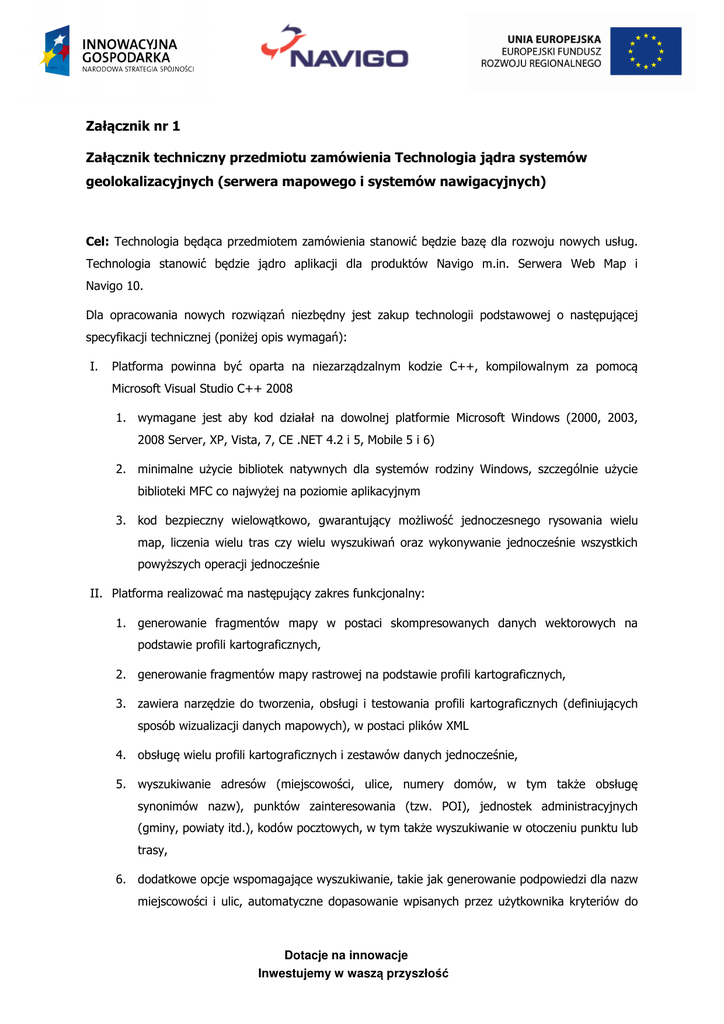 Załącznik nr 1 Załącznik techniczny przedmiotu zamówienia Technologia jądra systemów geolokalizacyjnych (serwera mapowego i systemów nawigacyjnych) Cel: Technologia będąca przedmiotem zamówienia stanowić będzie bazę dla rozwoju nowych usług. Technologia stanowić będzie jądro aplikacji dla produktów Navigo m.in. Serwera Web Map i Navigo 10. Dla opracowania nowych rozwiązań niezbędny jest zakup technologii podstawowej o następującej specyfikacji technicznej (poniżej opis wymagań): I. Platforma powinna być oparta na niezarządzalnym kodzie C++, kompilowalnym za pomocą Microsoft Visual Studio C++ 2008 1. wymagane jest aby kod działał na dowolnej platformie Microsoft Windows (2000, 2003, 2008 Server, XP, Vista, 7, CE .NET 4.2 i 5, Mobile 5 i 6) 2. minimalne użycie bibliotek natywnych dla systemów rodziny Windows, szczególnie użycie biblioteki MFC co najwyżej na poziomie aplikacyjnym 3. kod bezpieczny wielowątkowo, gwarantujący możliwość jednoczesnego rysowania wielu map, liczenia wielu tras czy wielu wyszukiwań oraz wykonywanie jednocześnie wszystkich powyższych operacji jednocześnie II. Platforma realizować ma następujący zakres funkcjonalny: 1. generowanie fragmentów mapy w postaci skompresowanych danych wektorowych na podstawie profili kartograficznych, 2. generowanie fragmentów mapy rastrowej na podstawie profili kartograficznych, 3. zawiera narzędzie do tworzenia, obsługi i testowania profili kartograficznych (definiujących sposób wizualizacji danych mapowych), w postaci plików XML 4. obsługę wielu profili kartograficznych i zestawów danych jednocześnie, 5. wyszukiwanie adresów (miejscowości, ulice, numery domów, w tym także obsługę synonimów nazw), punktów zainteresowania (tzw. POI), jednostek administracyjnych (gminy, powiaty itd.), kodów pocztowych, w tym także wyszukiwanie w otoczeniu punktu lub trasy, 6. dodatkowe opcje wspomagające wyszukiwanie, takie jak generowanie podpowiedzi dla nazw miejscowości i ulic, automatyczne dopasowanie wpisanych przez użytkownika kryteriów do Dotacje na innowacje Inwestujemy w waszą przyszłość różnych typów obiektów (np. adres lub POI) oraz intuicyjne sortowanie wyników wyszukiwania, 7. możliwość użycia tzw. "sprytnego wyszukiwania" - automatyczne poszerzanie kryteriów wyszukiwania, jeśli bardziej zawężone nie dają rezultatów, 8. możliwość włączenia w rezultatach wyszukiwania informacji o szczegółowości danych z danej miejscowości (czy dokładność jest na poziomie miejscowości, ulic czy punktów adresowych) 9. wyznaczanie tras samochodowych z możliwością modyfikowania parametrów trasy (np. prędkości na różnych kategoriach dróg, pomijanie kategorii), 10. wyznaczanie tras pieszych i rowerowych z możliwością modyfikowania parametrów trasy, 11. rozwiązywanie problemu komiwojażera z możliwością wyboru pomiędzy technikami pełnymi (wolne i dokładne) lub przybliżonymi (szybkie, mniej dokładne) 12. przeliczanie współrzędnych (np. piksela na mapie na długość i szerokość geograficzną), 13. geokodowanie adresów (przypisanie współrzędnych do adresu), 14. posiada system wprowadzania blokad i utrudnień na odcinkach dróg mający natychmiastowy wpływ na wyznaczane trasy 15. obsługa tras wycieczkowych. Do każdego punktu trasy ma istnieć możliwość dołożenia nazwy pełnej punktu trasy, nazwy skróconej i opisu punktu wycieczkowego. Algorytmy wyznaczania wskazówek i nawigowania 16. muszą być świadome użycia pliku trasy wycieczkowej, dzięki czemu wyzwalane są odpowiednie zdarzenia (np. inne komunikaty przy zbliżaniu się do punktu trasy wycieczkowej) III. Możliwość użycia powyższej technologii w postaci kontrolki ActiveX (wraz z dokumentacją) IV. Współpraca ze skompresowanym, dedykowanym formatem danych mapowych 1. kod konwerterów umożliwiających konwersję z otwartych formatów danych GIS ESRI: ArcView Shape File, ESRI Database, możliwość ustawienia wybranego formatu danych wyjściowych (WGS84, PUWG 1992, dowolne inne odwzorowanie Gaussa-Kriegera, parametryzowane wybranymi współczynnikami), obsługa danych formatu TeleAtlas, 2. szybkie liczenie tras na całej Europie, obsługa promów, obsługa znaków narodowych (cyrylica), 3. kompresja w stosunku do otwartych formatów co najmniej 1:15 4. wsparcie technologii umożliwiającej generację dodatkowych poligonów na podstawie danych ASCII Grid Dotacje na innowacje Inwestujemy w waszą przyszłość 5. silnik wczytywania danych ma umożliwiać podpinanie zewnętrznych źródeł danych (SQL, pliki tekstowe, etc), na zasadzie wtyczek DLL 6. odczyt bazy danych kartograficznych możliwy w dwóch trybach – jako odczyt plików lub mapowanie plików w pamięć 7. obsługa danych zawierających: a) poligony: podział administracyjny kraju, obszary miejscowości, pokrycie terenu (cmentarze, lasy, parki, wody, zabudowa, obszary chronione) b) linie: sieć drogowa, koleje, wody, treść turystyczna (szlaki, ścieżki piesze, ścieżki rowerowe, wyciągi linowe), elementy rzeźby terenu (warstwice, izobaty) c) punkty: punkty adresowe, manewry, centroidy miejscowości, POI (w tym multi POI), elementy krajobrazu (punkty widokowe, obiekty charakterystyczne), treść turystyczna (punkty osadzenia komunikatów krajoznawczych), elementy rzeźby terenu (punkty wysokościowe) V. Hybrydowy silnik wyświetlania danych mapowych zapewniający: 1. rendering mapy przy użyciu standardowych funkcji Windows GDI 2. rendering mapy przy użyciu biblioteki OpenGL dla platform PC z akceleratorem grafiki oraz urządzeń mobilnych. Na urządzeniach mobilnych (z systemem operacyjnym WCE 4.2 i wyżej, PocketPC, Windows Mobile 5.0 i wyżej) wymagana się obsługi OpenGL ES 1.1 w wersji software’owej dla urządzeń bez wsparcia GPU oraz w hardware’owej na urządzeniach z zainstalowanym GPU (np. urządzenie producenta HTC) 3. wykrywanie obecności hardware’owej obsługi rysowania powinn