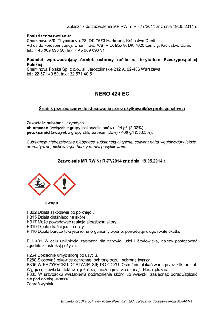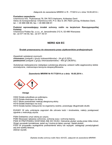 Załącznik do zezwolenia MRiRW nr R - 77/2014 zr z dnia 19.05.2014 r. Posiadacz zezwolenia: Cheminova A/S, Thyborønvej 78, DK-7673 Harboøre, Królestwo Danii Adres do korespondencji: Cheminova A/S, P.O. Box 9, DK-7620 Lemvig, Królestwo Danii, tel.: + 45 969 096 90, fax: + 45 969 096 91 Podmiot wprowadzający środek ochrony roślin na terytorium Rzeczypospolitej Polskiej: Cheminova Polska Sp. z o.o., al. Jerozolimskie 212 A, 02-486 Warszawa tel.: 22 571 40 50, fax.: 22 571 40 51 NERO 424 EC Środek przeznaczony do stosowania przez użytkowników profesjonalnych Zawartość substancji czynnych: chlomazon (związek z grupy izoksazolidionów) - 24 g/l (2,32%). petoksamid (związek z grupy chloroacetamidów) - 400 g/l (38,65%). Substancje niebezpieczne niebędące substancją aktywną: solwent nafta węglowodory lekkie aromatyczne, niskowrząca benzyna-niespecyfikowana. Zezwolenie MRiRW Nr R-77/2014 zr z dnia 19.05.2014 r. Uwaga H302 Działa szkodliwie po połknięciu. H315 Działa drażniąco na skórę. H317 Może powodować reakcję alergiczną skóry. H319 Działa drażniąco na oczy. H410 Działa bardzo toksycznie na organizmy wodne, powodując długotrwałe skutki. EUH401 W celu uniknięcia zagrożeń dla zdrowia ludzi i środowiska, należy postępować zgodnie z instrukcją użycia. P264 Dokładnie umyć skórę po użyciu. P280 Stosować rękawice ochronne, ochronę oczu i ochronę twarzy. P305 W PRZYPADKU DOSTANIA SIĘ DO OCZU: Ostrożnie płukać wodą przez kilka minut. Wyjąć soczewki kontaktowe, jeżeli są i można je łatwo usunąć. Nadal płukać. P333 W przypadku wystąpienia podrażnienia skóry lub wysypki: zasięgnąć porady/zgłosić się pod opiekę lekarza. Zebrać wyciek. Etykieta środka ochrony roślin Nero 424 EC, załącznik do zezwolenia MRiRW1 OPIS DZIAŁANIA Nero 424 EC jest środkiem chwastobójczym w formie koncentratu do sporządzania emulsji wodnej, stosowanym doglebowo, przeznaczonym do zwalczania niektórych jednorocznych chwastów dwuliściennych oraz jednoliściennych w rzepaku ozimym. Środek pobierany jest poprzez korzenie i hipokotyl kiełkujących chwastów, najskuteczniej zwalcza chwasty do fazy pierwszych liści. Substancja czynna petoksamid hamuje podział komórek i biosyntezę lipidów i zapobiega wschodom chwastów. Późniejsze wschody chwastów są opóźnione przez kilka tygodni dzięki obecności herbicydów w ziemi. Z kolei chlomazon hamuje w chwastach biosyntezę karotenoidów i biosyntezę chlorofilu. Dzięki działaniu herbicydu wschody chwastów są opóźnione lub zatrzymane. Jeśli chwasty wschodzą to ich liście wykazują objawy chlorozy i są podatne na zniszczenie. Środek przeznaczony do stosowania przy użyciu opryskiwaczy polowych. DZIAŁANIE NA CHWASTY Środek Nero 424 EC jest herbicydem doglebowym działającym na chwasty głównie w okresie ich kiełkowania. Chwasty wrażliwe: miotła zbożowa, wiechlina roczna, tasznik pospolity, przytulia czepna, jasnota biała, jasnota różowa, maruna bezwonna, rumianek pospolity, rumian polny, niezapominajka polna, gwiazdnica pospolita, tobołki polne, przetacznik perski. STOSOWANIE ŚRODKA Rzepak ozimy Maksymalna dawka dla jednorazowego zastosowania: 3,0 l/ha. Zalecana dawka dla jednorazowego zastosowania: 2,5 – 3,0 l/ha. Maksymalna liczba zabiegów w sezonie wegetacyjnym – 1. Termin stosowania środka: stosować bezpośrednio po siewie rzepaku (najpóźniej do 3 dni), na starannie uprawioną (bez grud) glebę. Zalecana ilość wody: 200-300 l/ha Zalecane opryskiwanie średniokropliste. NASTĘPSTWO ROŚLIN Środek rozkłada się glebie w okresie wegetacji do poziomu, który nie stwarza zagrożenia dla roślin uprawianych następczo. W przypadku konieczności zlikwidowania plantacji rzepaku ozimego traktowanego środkiem Nero 424 EC, na wiosnę przyszłego roku można uprawiać rzepak jary, kukurydzę, słonecznik, ziemniaki, fasolę, łubin, lucernę. Po wykonaniu dodatkowej orki na głębokość 15 cm można uprawiać jęczmień jary. ŚRODKI OSTROŻNOŚCI PRAKTYKĄ ROLNICZĄ I ZALECENIA STOSOWANIA ZWIĄZANE Z DOBRĄ 1. Nasiona rzepaku wysiewać na jednakową głębokość (około 2 cm), dokładnie 2. 3. 4. przykrywać glebą. Zabieg wykonany na glebach wilgotnych przyspiesza skuteczność działania środka. Na glebach z dużą ilością materii organicznej można się spodziewać obniżenia skuteczności działania środka. W przypadku niestarannego przygotowanie gleby pod siew nasion rzepaku ozimego lub wczesnych wschody chwastów, można spodziewać się obniżonego działania 2 środka. 5. Po zastosowaniu środka Nero 424 EC mogą występować krótkotrwałe symptomy fitotoksyczności na roślinach rzepaku ozimego. 6. W celu uniknięcia uszkodzenia roślin rzepaku ozimego należy przestrzegać zaleceń zapewniających właściwe przygotowanie roślin do przezimowania. 7. Silne opady deszczu występujące w okresie kiełkowania i wschodów, szczególnie w przypadku występowania w tym czasie niskich temperatur mogą prowadzić do uszkodzenia roślin rzepaku ozimego. 8. Na glebach lekkich, piaszczystych, przesuszonych z małą ilością materii organicznej może wystąpić wysokie ryzyko uszkodzenia roślin uprawnych. 9. Środka nie stosować na glebach silnie przepuszczających o małej absorpcji - ze względu na niską skuteczność działania środka oraz możliwość wystąpienia fitotoksycznych objawów na roślinach rzepaku ozimego. 10. Środka nie stosować w czasie wschodów ani po wschodach rzepaku ozimego ze względu na możliwość ich uszkodzenia. 11. Opryskiwanie wykonywać opryskiwaczem wyposażonym w rozpylacze średniokropliste w dolnym zakresie zalecanych ciśnień. 12. Belka polowa opryskiwacza winna być zawieszona na minimalnej wysokości zalecanej dla użytego typu rozpylacza. 13. Środka nie stosować podczas wiatru stwarzającego możliwość znoszenia cieczy użytkowej na sąsiednie rośliny uprawne oraz podczas ciszy sprzyjającej występowani