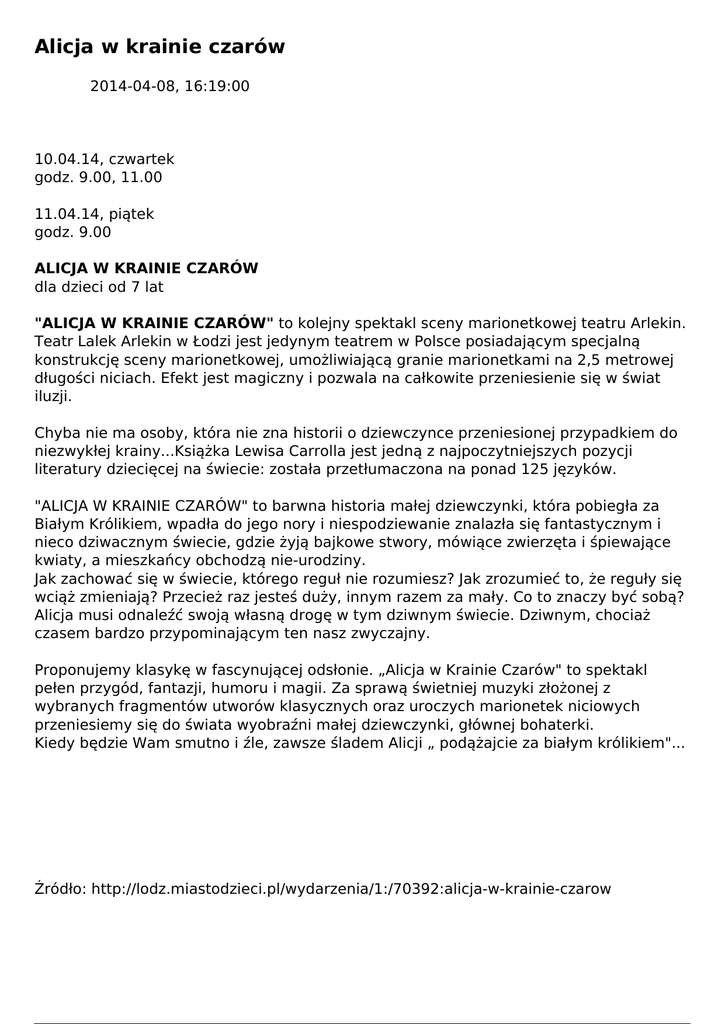Alicja w krainie czarów 2014-04-08, 16:19:00 10.04.14, czwartek godz. 9.00, 11.00 11.04.14, piątek godz. 9.00 ALICJA W KRAINIE CZARÓW dla dzieci od 7 lat "ALICJA W KRAINIE CZARÓW" to kolejny spektakl sceny marionetkowej teatru Arlekin. Teatr Lalek Arlekin w Łodzi jest jedynym teatrem w Polsce posiadającym specjalną konstrukcję sceny marionetkowej, umożliwiającą granie marionetkami na 2,5 metrowej długości niciach. Efekt jest magiczny i pozwala na całkowite przeniesienie się w świat iluzji. Chyba nie ma osoby, która nie zna historii o dziewczynce przeniesionej przypadkiem do niezwykłej krainy...Książka Lewisa Carrolla jest jedną z najpoczytniejszych pozycji literatury dziecięcej na świecie: została przetłumaczona na ponad 125 języków. "ALICJA W KRAINIE CZARÓW" to barwna historia małej dziewczynki, która pobiegła za Białym Królikiem, wpadła do jego nory i niespodziewanie znalazła się fantastycznym i nieco dziwacznym świecie, gdzie żyją bajkowe stwory, mówiące zwierzęta i śpiewające kwiaty, a mieszkańcy obchodzą nie-urodziny. Jak zachować się w świecie, którego reguł nie rozumiesz? Jak zrozumieć to, że reguły się wciąż zmieniają? Przecież raz jesteś duży, innym razem za mały. Co to znaczy być sobą? Alicja musi odnaleźć swoją własną drogę w tym dziwnym świecie. Dziwnym, chociaż czasem bardzo przypominającym ten nasz zwyczajny. Proponujemy klasykę w fascynującej odsłonie. „Alicja w Krainie Czarów" to spektakl pełen przygód, fantazji, humoru i magii. Za sprawą świetniej muzyki złożonej z wybranych fragmentów utworów klasycznych oraz uroczych marionetek niciowych przeniesiemy się do świata wyobraźni małej dziewczynki, głównej bohaterki. Kiedy będzie Wam smutno i źle, zawsze śladem Alicji „ podążajcie za białym królikiem"... Źródło: http://lodz.miastodzieci.pl/wydarzenia/1:/70392:alicja-w-krainie-czarow Powered by TCPDF (www.tcpdf.org)