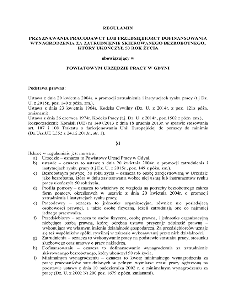 REGULAMIN PRZYZNAWANIA PRACODAWCY LUB PRZEDSIĘBIORCY DOFINANSOWANIA WYNAGRODZENIA ZA ZATRUDNIENIE SKIEROWANEGO BEZROBOTNEGO, KTÓRY UKOŃCZYŁ 50 ROK ŻYCIA obowiązujący w POWIATOWYM URZĘDZIE PRACY W GDYNI Podstawa prawna: Ustawa z dnia 20 kwietnia 2004r. o promocji zatrudnienia i instytucjach rynku pracy (t.j Dz. U. z 2015r., poz. 149 z późn. zm.), Ustawa z dnia 23 kwietnia 1964r. Kodeks Cywilny (Dz. U. z 2014r. z poz. 121z późn. zmianami), Ustawa z dnia 26 czerwca 1974r. Kodeks Pracy (t.j. Dz. U. z 2014r., poz.1502 z późn. zm.), Rozporządzenie Komisji (UE) nr 1407/2013 z dnia 18 grudnia 2013r. w sprawie stosowania art. 107 i 108 Traktatu o funkcjonowaniu Unii Europejskiej do pomocy de minimis (Dz.Urz.UE L352 z 24.12.2013r., str. 1). §1 Ilekroć w regulaminie jest mowa o: a) Urzędzie – oznacza to Powiatowy Urząd Pracy w Gdyni. b) ustawie – oznacza to ustawę z dnia 20 kwietnia 2004r. o promocji zatrudnienia i instytucjach rynku pracy (t.j Dz. U. z 2015r., poz. 149 z późn. zm.). c) Bezrobotnym powyżej 50 roku życia – oznacza to osobę zarejestrowaną w Urzędzie jako bezrobotna, która w dniu zastosowania wobec niej usług lub instrumentów rynku pracy ukończyła 50 rok życia, d) Profilu pomocy – oznacza to właściwy ze względu na potrzeby bezrobotnego zakres form pomocy, określonych w ustawie z dnia 20 kwietnia 2004r. o promocji zatrudnienia i instytucjach rynku pracy, e) Pracodawcy – oznacza to jednostkę organizacyjną, również nie posiadającą osobowości prawnej, a także osobę fizyczną, jeżeli zatrudniają one co najmniej jednego pracownika. f) Przedsiębiorcy – oznacza to osobę fizyczną, osobę prawną, i jednostkę organizacyjną niebędącą osobą prawną, której odrębna ustawa przyznaje zdolność prawną – wykonująca we własnym imieniu działalność gospodarczą. Za przedsiębiorców uznaje się też wspólników spółki cywilnej w zakresie wykonywanej przez nich działalności. g) Zatrudnieniu – oznacza to wykonywanie pracy na podstawie stosunku pracy, stosunku służbowego oraz umowy o pracę nakładczą. h) Dofinansowaniu – oznacza to dofinansowanie wynagrodzenia za zatrudnienie skierowanego bezrobotnego, który ukończył 50 rok życia, i) Minimalnym wynagrodzeniu – oznacza to kwotę minimalnego wynagrodzenia za pracę pracowników zatrudnionych w pełnym wymiarze czasu pracy ogłoszoną na podstawie ustawy z dnia 10 października 2002 r. o minimalnym wynagrodzeniu za pracę (Dz. U. z 2002 Nr 200 poz. 1679 z późn. zmianami). j) k) Dyrektorze – należy przez to rozumieć Dyrektora Powiatowego Urzędu Pracy w Gdyni działającego na podstawie upoważnienia Prezydenta Miasta Gdynia. Staroście - oznacza to Prezydenta Miasta Gdyni, sprawującego zwierzchnictwo nad Powiatowym Urzędem Pracy w Gdyni. §2 1. Starosta może na podstawie zawartej umowy, przyznać Pracodawcy lub Przedsiębiorcy dofinansowanie wynagrodzenia za zatrudnienie skierowanego bezrobotnego, który ukończył 50 rok życia. 2. Dofinansowanie wynagrodzenia przysługuje w kwocie określonej w umowie, nie wyższej jednak niż połowa minimalnego wynagrodzenia za pracę miesięcznie obowiązującego w dniu zawarcia umowy, za każdego zatrudnionego bezrobotnego. 3. Dofinansowanie wynagrodzenia przysługuje przez okres: a) 12 miesięcy – w przypadku zatrudnienia bezrobotnego, który ukończył 50 lat, a nie ukończył 60 lub b) 24 miesięcy - w przypadku zatrudnienia bezrobotnego, który ukończył 60 lat. 4. Pracodawca lub Przedsiębiorca jest zobowiązany do dalszego zatrudnienia skierowanego bezrobotnego po upływie okresu, o którym mowa: a) w ust. 3 lit. a - przez okres 6 miesięcy, b) w ust. 3 lit. b – przez okres 12 miesięcy. 5. Dofinansowanie stanowi pomoc de minimis spełniającą warunki określone w Rozporządzeniu Komisji (UE) Nr 1407/2013 z dnia 18 grudnia 2013r. w sprawie stosowania art. 107 i 108 Traktatu o funkcjonowaniu Unii Europejskiej do pomocy de minimis (Dz.Urz.UE L352 z 24.12.2013, str. 1). §3 1. W ramach powyższego dofinansowania może zostać skierowana osoba bezrobotna, która: a) ukończyła 50 rok życia, b) dla której Urząd ustalił II profil pomocy. 2. Wniosek o dofinansowanie do wynagrodzenia za zatrudnienie skierowanego bezrobotnego może złożyć Pracodawca lub Przedsiębiorca prowadzący działalność gospodarczą przez okres co najmniej 3 miesięcy; do okresu prowadzenia działalności nie wlicza się okresu zawieszenia działalności gospodarczej. 3. Wniosek należy składać w terminie ogłoszonym przez Urząd wyłącznie na obowiązującym w Urzędzie druku wraz ze wszystkimi załącznikami w siedzibie tut. Urzędu - pok. nr 101. 4. Wypełniony wniosek może zostać przesłany pocztą, dostarczony kurierem lub złożony osobiście. 5. Każdorazowo informacja o ogłoszeniu naboru wniosków zostanie opublikowana na stronie internetowej Urzędu: pupgdynia.pl oraz na tablicy ogłoszeń w siedzibie Urzędu. 6. Przez datę złożenia wniosku rozumie się datę jego wpływu do Urzędu. Rozpatrywanie wniosków następuje według kolejności wpływu do Urzędu. 7. Wnioski, które zostaną złożone poza terminem ogłoszonym przez Urząd nie będą rozpatrywane. 8. Wniosek powinien być kompletny i wypełniony w sposób czytelny. W przypadku wypełnienia wniosku komputerowo niedopuszczalne jest jakiekolwiek modyfikowanie i usuwanie elementów wniosku – dopuszcza się wyłącznie dodawanie stron w części dotyczącej stanowiska pracy. 9. Wniosek powinien w szczególności zawierać: a) dane wnioskodawcy, b) informacje dotyczące planowanego zatrudnienia, c) dane dotyczące stanowiska pracy, w tym nazwę stanowiska pracy zgodną ze strukturą klasyfikacji zawodów i specjalności (Rozporządzenie Ministra Pracy i Polityki Społecznej w sprawie klasyfikacji zawodów i specjalności na potrzeby rynku pracy oraz zakresu jej stosowania ( Dz. U. z 2014r., 1145 z poźn. zm). 10. Do wniosku Pracodawca lub Przedsiębiorca 