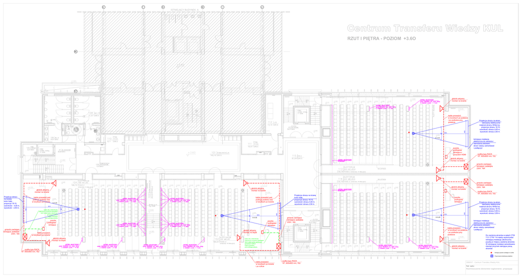 ISTNIEJĄCY BUDYNEK A Centrum Transferu Wiedzy KUL RZUT I PIĘTRA - POZIOM +3.6O ROLETA ELEKTRYCZNA ROLETA ELEKTRYCZNA ROLETA ELEKTRYCZNA głośnik aktywny montaż na ścianie kable prowadzić w korytkach po podeście i po podłodze przy podeście E Projekcja obrazu na ekran sterowany elektrycznie materiał ekranu White Ice, proporcje obrazu 16:10, szerokość obrazu 4,00 m, wysokość obrazu 2,50 m. Istniejąca instalacja elektryczna do zasilania i sterowania ekranem, ekran należy zamontować i podłączyć puszka podłogowa istniejąca z gniazdem HDMI szafka typu RACK 19", 600x800 mm, 15U głośnik aktywny montaż na ścianie gniazdo zasilające istniejące, podwójne 230V, 16A E Projekcja obrazu na ścianę kolor biały , proporcje 16:10, szerokość - 4,00 m, wysokość - 2,50 m. głośnik aktywny montaż na ścianie głośnik aktywny montaż na ścianie głośnik aktywny montaż na ścianie kable prowadzić pod podłogą podestu oraz w korytkach po ścianie kable prowadzić pod podłogą podestu oraz w korytkach po ścianie kable dla 2 mikrofonów zakończyć w puszce gniazdami XLR, kabel audio zakończyć gniazdami 2xRCA kable prowadzić pod podłogą podestu puszka podłogowa istniejąca gniazdo zasilające istniejące, podwójne 230V, 16A puszka podłogowa istniejąca głośnik aktywny montaż na słupie szafka typu RACK 19", 600x800 mm, 15U szafka typu RACK 19", 600x800 mm, 15U Projekcja obrazu na ścianę kolor biały , proporcje obrazu 16:10, szerokość obrazu 4,00 m, wysokość obrazu 2,50 m. puszka podłogowa istniejąca ROLETA ELEKTRYCZNA kable prowadzić w korytkach po podeście i po podłodze przy podeście kable dla 2 mikrofonów zakończyć w puszce gniazdami XLR, kabel audio zakończyć gniazdami 2xRCA kable prowadzić pod podłogą podestu ROLETA ELEKTRYCZNA ROLETA ELEKTRYCZNA ROLETA ELEKTRYCZNA ROLETA ELEKTRYCZNA ROLETA ELEKTRYCZNA ROLETA ELEKTRYCZNA ROLETA ELEKTRYCZNA Projekcja obrazu na ekran sterowany elektrycznie materiał ekranu White Ice, proporcje obrazu 16:10, szerokość obrazu 5,50 m, wysokość obrazu 3,09 m. gniazdo zasilające istniejące, podwójne 230V, 16A głośnik aktywny montaż na słupie kable prowadzić w korytkach po ścianie gniazdo zasilające istniejące, podwójne 230V, 16A głośnik aktywny montaż na ścianie ROLETA ELEKTRYCZNA ROLETA ELEKTRYCZNA ROLETA ELEKTRYCZNA Istniejąca instalacja elektryczna do zasilania i sterowania ekranem, ekran należy zamontować i podłączyć Do zasilenia ekranów w salach CTW 113 i CTW 114 należy wykorzystać istniejącą instalację zakończoną puszką w miejscu zasilenia ekranów. W istniejącej instalacji zamontowano również przyciski sterujące pracą ekranów ROLETA ELEKTRYCZNA Istniejące gniazdo zasilające na suficie Proponowana lokalizacja projektora kable prowadzić w korytkach po ścianie i po suficie szafka typu RACK 19", 600x800 mm, 15U OBIEKT - Centrum Transferu Wiedzy KUL Rozmieszczenie elementów nagłośnienia - propozycja