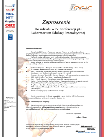 Zaproszenie Do udziału w IV Konferencji pt.: Laboratorium Edukacji Interaktywnej Szanowni Państwo ! Firma InfoLOGIC wraz z Partnerami zaprasza Państwa na konferencję, na której przybliżymy Państwu najnowsze rozwiązania techniczne i programowe przeznaczone dla sektora edukacji, zgodne z podstawą programową Ministerstwa Edukacji Narodowej. Na konferencji przedstawimy nowe możliwości edukacji z wykorzystaniem osiągnięć techniki w procesie nauczania. Wspólne spotkanie pozwoli na swobodną wymianę uwag, a nasi specjaliści udzielą odpowiedzi na drążące Państwa pytania. Mamy nadzieję, że wspólne spotkania i rozważania Państwa sugestii przyczynią się do rozwoju edukacji w Polsce. Partnerzy : F-Secure NEC Display Solutions NTT Helion OKI Printing Solution ProgMan Verx WSiP Lechosław Hojnacki - Kolegium Nauczycielskie w Bielsku-Białej - Nowe trendy w cyfrowym wspomaganiu uczenia się i komunikacji - wykład NEC - Przemysław Siemaszko, Wojciech Kosek - Monitory graficzne i projektory Edukacyjne - co? dla kogo? i do czego? - sprzęt AV w szkole F-secure - Krzysztof Brzeziński - Internet Security - ochrona ucznia i pracy nauczyciela OKI - Gabriel Seiler, Piotr Lipko - urządzenia drukujące OKI Verx - Tomek Mazurek - Interaktywne narzędzia w pracy nauczyciela Helion - Florian Gałuszka, Wacław Nalepka - Nauczanie hybrydowe w oparciu o serwis http//edukacja.helion.pl oraz podręczniki „Informatyka europejczyka” ProgMman - Od dziennika tradycyjnego do iDziennika NTT - Sebastian Kluczyk, Jarosław Paterek - Technologie mobilne-pracownie entete (Blue Dolphin) WSiP - nowe propozycje wydawnicze dla oświaty Konferencja odbędzie się dnia 4 marca 2010 o godz. 09:00 w Sali Konferencyjnej Uniwersytetu Śląskiego w Cieszynie przy ulicy Bielskiej 62. Udział w konferencji jest bezpłatny. Uprzejmie prosimy o potwierdzenie przybycia Waszych przedstawicieli pocztą elektroniczną na adres: [email protected], poprzez rejestrację online na www.infologic.com.pl lub telefonicznie pod numerem 33 8513640. Serdecznie zapraszam Adam Olszar Uczestnikom zapewniamy catering i liczne atrakcje, m.in. konkurs z atrakcyjnymi nagrodami! Organizator zastrzega sobie prawo do zmian w agendzie. Więcej informacji na www.infologic.com.pl