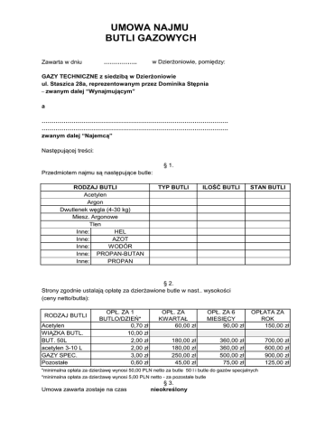 UMOWA NAJMU BUTLI GAZOWYCH Zawarta w dniu …………….. w Dzierżoniowie, pomiędzy: GAZY TECHNICZNE z siedzibą w Dzierżoniowie ul. Staszica 28a, reprezentowanym przez Dominika Stępnia – zwanym dalej “Wynajmującym” a …………………………………………………………………………………. …………………………………………………………………………………. zwanym dalej “Najemcą” Następującej treści: § 1. Przedmiotem najmu są następujące butle: RODZAJ BUTLI Acetylen Argon Dwutlenek węgla (4-30 kg) Miesz. Argonowe Tlen Inne: HEL Inne: AZOT Inne: WODÓR Inne: PROPAN-BUTAN Inne: PROPAN TYP BUTLI ILOŚĆ BUTLI STAN BUTLI § 2. Strony zgodnie ustalają opłatę za dzierżawione butle w nast.. wysokości (ceny netto/butla): RODZAJ BUTLI Acetylen WIĄZKA BUTL. BUT. 50L acetylen 3-10 L GAZY SPEC. Pozostałe OPŁ. ZA 1 BUTLO/DZIEŃ* 0,70 zł 10,00 zł 2,00 zł 2,00 zł 3,00 zł 0,60 zł OPŁ. ZA KWARTAŁ 60,00 zł OPŁ. ZA 6 MIESIĘCY 90,00 zł OPŁATA ZA ROK 150,00 zł 180,00 zł 180,00 zł 250,00 zł 45,00 zł 360,00 zł 360,00 zł 500,00 zł 75,00 zł 700,00 zł 600,00 zł 900,00 zł 125,00 zł *minimalna opłata za dzierżawę wynosi 50,00 PLN netto za butle 50 l i butle do gazów specjalnych *minimalna opłata za dzierżawę wynosi 5,00 PLN netto - za pozostałe butle Umowa zawarta zostaje na czas § 3. nieokreślony § 4. Czynsz płatny jest w terminie siedmiu dni od wystawienia faktury przez wynajmującego. W przypadku wystąpienia opóźnień w zapłacie czynszu Wynajmujący naliczy odsetki w wysokości 0,5 % dziennie. W przypadku zwłoki w zapłacie dłuższej niż 2 miesiące Wynajmujący obciąży Najemcę koszami wysłania “wezwania do zapłaty” w kwocie 30,00 PLN W przypadku konieczności przekazania należności do windykacji Najemca obciążony zostanie Kosztami windykacji i kosztami sądowymi. § 5. Obejmując przedmiot najmu Najemca nie podnosi zastrzeżeń co do jego stanu technicznego. Najemca zobowiązuje się zwrócić przedmiot najmu w stanie nie pogorszonym. § 6. Najemca zobowiązany jest do używania przedmiotu umowy zgodnie z zasadami eksploatacji. § 7. Przedmiot najmu nie może być bez zgody Wynajmującego przedmiotem użyczenia ani podnajmu § 8. Wynajmującemu przysługuje prawo do natychmiastowego wypowiedzenia umowy. W razie rozwiązania umowy Najemca zobowiązany jest do zwrotu przedmiotu umowy w terminie 7 dni. § 9. Wszelkie zmiany niniejszej umowy wymagają zachowania formy pisemnej pod rygorem nieważności. § 10. W sprawach spornych nie uregulowanych niniejszą umową zastosowanie mają przepisy Kodeksu Cywilnego. § 11. W przypadku uszkodzenia bądź zagubienia przedmiotu umowy Wynajmujący obciąży Najemcę następującymi kwotami netto: 1. 450,00 PLN – za butlęacetylenową 2. 250,00 PLN – za butlę do dwutlenku węgla (4-8 kg) 3. 350,00 PLN – za wszystkie pozostałe butle (4-40 l.) 4. 650,00 PLN - za butle 50l. 200 bar 5. 1000,00 PLN - za butle do gazów specjalnych 6. 20 000,00 PLN - za wiązkę butlową § 12. Umowę sporządzono w 2 jednobrzmiących egzemplarzach po 1 dla każdej ze stron. ........................................ (Wynajmujący) .............................. (Najemca)