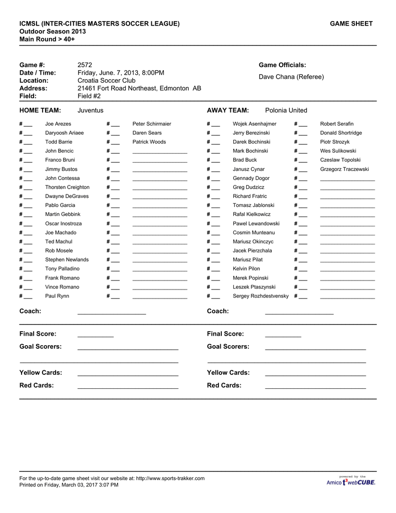 ICMSL (INTER-CITIES MASTERS SOCCER LEAGUE) GAME SHEET Outdoor Season 2013 Main Round > 40+ ____________________________________________________________________________________________ Game #: 2572 Game Officials: Date / Time: Friday, June. 7, 2013, 8:00PM Dave Chana (Referee) Location: Croatia Soccer Club Address: 21461 Fort Road Northeast, Edmonton AB Field: Field #2 ____________________________________________________________________________________________ HOME TEAM: Juventus AWAY TEAM: Polonia United # ___ Joe Arezes # ___ Peter Schirmaier # ___ Wojek Asenhajmer # ___ Robert Serafin # ___ Daryoosh Ariaee # ___ Daren Sears # ___ Jerry Berezinski # ___ Donald Shortridge # ___ Todd Barrie # ___ Patrick Woods # ___ Darek Bochinski # ___ Piotr Strozyk # ___ John Bencic # ___ ___________________ # ___ Mark Bochinski # ___ Wes Sulikowski # ___ Franco Bruni # ___ ___________________ # ___ Brad Buck # ___ Czeslaw Topolski # ___ Jimmy Bustos # ___ ___________________ # ___ Janusz Cynar # ___ Grzegorz Traczewski # ___ John Contessa # ___ ___________________ # ___ Gennady Dogor # ___ ___________________ # ___ Thorsten Creighton # ___ ___________________ # ___ Greg Dudzicz # ___ ___________________ # ___ Dwayne DeGraves # ___ ___________________ # ___ Richard Fratric # ___ ___________________ # ___ Pablo Garcia # ___ ___________________ # ___ Tomasz Jablonski # ___ ___________________ # ___ Martin Gebbink # ___ ___________________ # ___ Rafal Kielkowicz # ___ ___________________ # ___ Oscar Inostroza # ___ ___________________ # ___ Pawel Lewandowski # ___ ___________________ # ___ Joe Machado # ___ ___________________ # ___ Cosmin Munteanu # ___ ___________________ # ___ Ted Machul # ___ ___________________ # ___ Mariusz Okinczyc # ___ ___________________ # ___ Rob Mosele # ___ ___________________ # ___ Jacek Pierzchala # ___ ___________________ # ___ Stephen Newlands # ___ ___________________ # ___ Mariusz Pilat # ___ ___________________ # ___ Tony Palladino # ___ ___________________ # ___ Kelvin Pilon # ___ ___________________ # ___ Frank Romano # ___ ___________________ # ___ Merek Popinski # ___ ___________________ # ___ Vince Romano # ___ ___________________ # ___ Leszek Ptaszynski # ___ ___________________ # ___ Paul Rynn # ___ ___________________ # ___ Sergey Rozhdestvensky # ___ ___________________ Coach: ___________________ Coach: ___________________ ____________________________________________________________________________________________ Final Score: __________ Final Score: __________ Goal Scorers: ____________________________ Goal Scorers: ____________________________ ____________________________________________ ____________________________________________ Yellow Cards: Yellow Cards: ____________________________ ____________________________ Red Cards: ____________________________ Red Cards: ____________________________ ____________________________________________________________________________________________ ____________________________________________________________________________________________ For the up-to-date game sheet visit our website at: http://www.sports-trakker.com Printed on Friday, March 03, 2017 3:07 PM