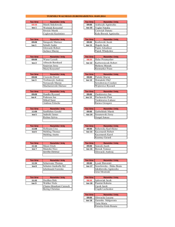 TURNIEJ WALNEGO ZGROMADZENIA 10.05.2014 Tee time 08:50 tee 1 Tee time 09:00 tee 1 Tee time 09:00 tee 2 Tee time 09:00 tee 3 Tee time 09:00 tee 4 Tee time 11:00 tee 5 Tee time 11:08 tee 6 Tee time 11:16 tee 7 Tee time 11:24 tee 8 Nazwisko i imię Marek Sokolowski Woźniak Krzysztof Siwicki Marek Ceglewski Kazimierz Nazwisko i imię Śniegocki Mariusz Schuhl Andre Głowacki Robert Juchacz Maciej Nazwisko i imię Wiater Leszek Albrecht Bernhard Szejwian Jerzy Mazij Krzysztof Nazwisko i imię Cisowski Paweł Trofimczyk Andrzej Nowaczyk Maciej Mucharzewski Dariusz Nazwisko i imię Handke Ryszard Pedersen Jan Mikail Sami Andreas Fritsche Nazwisko i imię Senftleben Gerald Judetzki James Richter Sylvia Nazwisko i imię Hofmann Uwe Mehling Thomas Mehling Anette Nazwisko i imię Meyer Erich Mantzke Nico Genilke Dietmar Nazwisko i imię Schurwanz Thomas Schutter-Janikulla Hel Scheikowski Franciska Tee time Nazwisko i imię 09:00 Arabczyk Agnieszka tee 10 Vogler Natalia Czewżyk Danuta Kula-Borsuk Agnieszka Tee time Nazwisko i imię 09:00 Kozłowski Jacek tee 11 Hupało Jacek Popin Arkadiusz Piątek Władysław Tee time Nazwisko i imię 08:50 Hałas Przemysław tee 12 Karbowniczek Robert Bieława Maraek Renmarker Frans Tee time Nazwisko i imię 09:00 Pieński Maciej tee 12 Domański Olaf Szwabowicz Czesław Wojtowicz Ryszard Tee time Nazwisko i imię 09:00 Zienkiewicz Jan tee 13 Piechowski Piotr Tomkiewicz Łukasz Ramos Grzegorz Tee time Nazwisko i imię 09:00 Garboliński Marek tee 14 Szramowski Jerzy Gurgul Janusz Tee time Nazwisko i imię 09:00 Rohowsky Karl-Heinz tee 15 Kaczmarek Robert Kaczmarek Karol Kearney Gerard Tee time Nazwisko i imię 09:00 Sanocki Jacek tee 16 Borsuk Tomasz Głowacki Andrzej Tee time Nazwisko i imię 09:00 Łysak Sławomir tee 17 Szawłowska - Hałas Beata Jakubowska Agnieszka Artur Mrozinski Tee time 11:32 tee 9 Nazwisko i imię DreiBen Dirk Walther Niels Chams-Mourkani Curosch Bering Christian Tee time Nazwisko i imię 08:50 Jędrowiak Jacek tee 18 Piantini Roberto Cęcek Jacek Ciupik Lechosław Tee time Nazwisko i imię 09:00 Głowacka Lucyna tee 18 Zaremba Małgorzata Torta Maria Potocka-Grala Renata