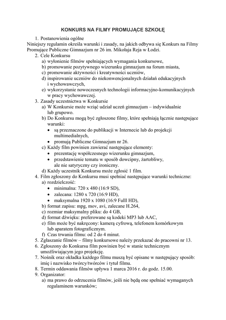 KONKURS NA FILMY PROMUJĄCE SZKOŁĘ 1. Postanowienia ogólne Niniejszy regulamin określa warunki i zasady, na jakich odbywa się Konkurs na Filmy Promujące Publiczne Gimnazjum nr 26 im. Mikołaja Reja w Łodzi. 2. Cele Konkursu a) wyłonienie filmów spełniających wymagania konkursowe, b) promowanie pozytywnego wizerunku gimnazjum na forum miasta, c) promowanie aktywności i kreatywności uczniów, d) inspirowanie uczniów do niekonwencjonalnych działań edukacyjnych i wychowawczych, e) wykorzystanie nowoczesnych technologii informacyjno-komunikacyjnych w pracy wychowawczej. 3. Zasady uczestnictwa w Konkursie a) W Konkursie może wziąć udział uczeń gimnazjum – indywidualnie lub grupowo. b) Do Konkursu mogą być zgłoszone filmy, które spełniają łącznie następujące warunki: są przeznaczone do publikacji w Internecie lub do projekcji multimedialnych, promują Publiczne Gimnazjum nr 26. c) Każdy film powinien zawierać następujące elementy: prezentację współczesnego wizerunku gimnazjum, przedstawienie tematu w sposób dowcipny, żartobliwy, ale nie satyryczny czy ironiczny. d) Każdy uczestnik Konkursu może zgłosić 1 film. 4. Film zgłoszony do Konkursu musi spełniać następujące warunki techniczne: a) rozdzielczość: minimalna: 720 x 480 (16:9 SD), zalecana: 1280 x 720 (16:9 HD), maksymalna 1920 x 1080 (16:9 Fulll HD), b) format zapisu: mpg, mov, avi, zalecane H.264, c) rozmiar maksymalny pliku: do 4 GB, d) format dźwięku: preferowane są kodeki MP3 lub AAC, e) film może być nakręcony: kamerą cyfrową, telefonem komórkowym lub aparatem fotograficznym. f) Czas trwania filmu: od 2 do 4 minut. 5. Zgłaszanie filmów – filmy konkursowe należy przekazać do pracowni nr 13. 6. Zgłoszony do Konkursu film powinien być w stanie technicznym umożliwiającym jego projekcję. 7. Nośnik oraz okładka każdego filmu muszą być opisane w następujący sposób: imię i nazwisko twórcy/twórców i tytuł filmu. 8. Termin oddawania filmów upływa 1 marca 2016 r. do godz. 15.00. 9. Organizator: a) ma prawo do odrzucenia filmów, jeśli nie będą one spełniać wymaganych regulaminem warunków; b) zastrzega sobie prawo do wykorzystania nadesłanych filmów lub ich fragmentów w celach promujących gimnazjum. 10.Zgłoszenie filmu do konkursu oznacza akceptację postanowień regulaminu.
