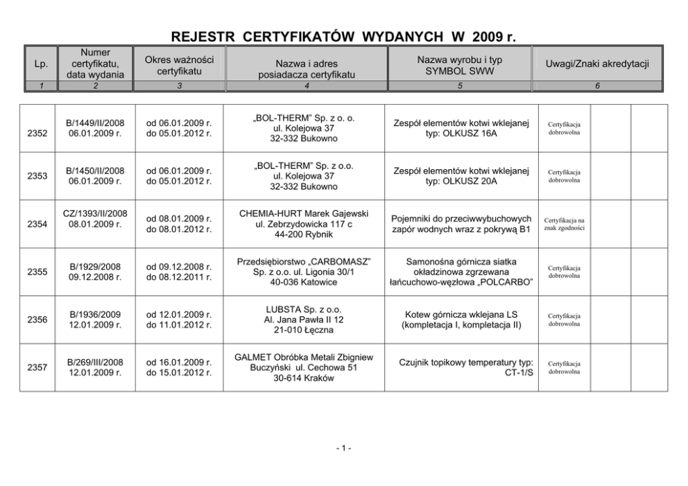 REJESTR CERTYFIKATÓW WYDANYCH W 2009 r.