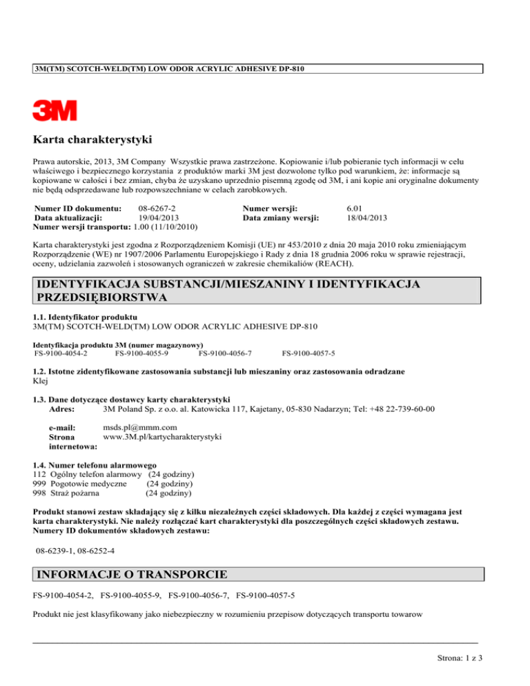 3M(TM) SCOTCH-WELD(TM) LOW ODOR ACRYLIC ADHESIVE DP-810 Karta charakterystyki Prawa autorskie, 2013, 3M Company Wszystkie prawa zastrzeżone. Kopiowanie i/lub pobieranie tych informacji w celu właściwego i bezpiecznego korzystania z produktów marki 3M jest dozwolone tylko pod warunkiem, że: informacje są kopiowane w całości i bez zmian, chyba że uzyskano uprzednio pisemną zgodę od 3M, i ani kopie ani oryginalne dokumenty nie będą odsprzedawane lub rozpowszechniane w celach zarobkowych. 08-6267-2 Numer ID dokumentu: 19/04/2013 Data aktualizacji: Numer wersji transportu: 1.00 (11/10/2010) Numer wersji: Data zmiany wersji: 6.01 18/04/2013 Karta charakterystyki jest zgodna z Rozporządzeniem Komisji (UE) nr 453/2010 z dnia 20 maja 2010 roku zmieniającym Rozporządzenie (WE) nr 1907/2006 Parlamentu Europejskiego i Rady z dnia 18 grudnia 2006 roku w sprawie rejestracji, oceny, udzielania zazwoleń i stosowanych ograniczeń w zakresie chemikaliów (REACH). IDENTYFIKACJA SUBSTANCJI/MIESZANINY I IDENTYFIKACJA PRZEDSIĘBIORSTWA 1.1. Identyfikator produktu 3M(TM) SCOTCH-WELD(TM) LOW ODOR ACRYLIC ADHESIVE DP-810 Identyfikacja produktu 3M (numer magazynowy) FS-9100-4054-2 FS-9100-4055-9 FS-9100-4056-7 FS-9100-4057-5 1.2. Istotne zidentyfikowane zastosowania substancji lub mieszaniny oraz zastosowania odradzane Klej 1.3. Dane dotyczące dostawcy karty charakterystyki 3M Poland Sp. z o.o. al. Katowicka 117, Kajetany, 05-830 Nadarzyn; Tel: +48 22-739-60-00 Adres: [email protected] e-mail: www.3M.pl/kartycharakterystyki Strona internetowa: 1.4. Numer telefonu alarmowego 112 Ogólny telefon alarmowy (24 godziny) 999 Pogotowie medyczne (24 godziny) 998 Straż pożarna (24 godziny) Produkt stanowi zestaw składający się z kilku niezależnych części składowych. Dla każdej z części wymagana jest karta charakterystyki. Nie należy rozłączać kart charakterystyki dla poszczególnych części składowych zestawu. Numery ID dokumentów składowych zestawu: 08-6239-1, 08-6252-4 INFORMACJE O TRANSPORCIE FS-9100-4054-2, FS-9100-4055-9, FS-9100-4056-7, FS-9100-4057-5 Produkt nie jest klasyfikowany jako niebezpieczny w rozumieniu przepisow dotyczących transportu towarow __________________________________________________________________________________________ Strona: 1 z 3 3M(TM) SCOTCH-WELD(TM) LOW ODOR ACRYLIC ADHESIVE DP-810 niebezpiecznych. OZNAKOWANIE ZESTAWU 2.2. Elementy oznakowania Rozporządzenie (WE) nr 1272/2008 (CLP) Hasło ostrzegawcze: Niebezpieczeństwo Symbole:: GHS05 (Działanie żrące) GHS07 (Wykrzyknik) GHS08 (Zagrożenie dla zdrowia) Piktogramy: Zwroty wskazujące rodzaj zagrożenia: H332 Działa szkodliwie w następstwie wdychania. H318 Powoduje poważne uszkodzenie oczu. H315 Działa drażniąco na skórę. H317 Może powodować reakcję alergiczną skóry. H373 Może powodować uszkodzenie narządów poprzez długotrwałe lub wielokrotne narażenie: system nerwowy | układ oddechowy H412 Działa szkodliwie na organizmy wodne, powodując długotrwałe skutki. Zwroty wskazujące środki ostrożności: Zapobieganie: P260 P280B Reagowanie: P305 + P351 + P338 P310 P333 + P313 Nie wdychać pyłu/dymu/gazu/mgły/par/rozpylonej cieczy. Stosować rękawice ochronne i ochronę oczu/ochronę twarzy. W PRZYPADKU DOSTANIA SIĘ DO OCZU: Ostrożnie płukać wodą przez kilka minut. Wyjąć soczewki kontaktowe, jeżeli są i można je łatwo usunąć. Nadal płukać. Natychmiast skontaktować się z OŚRODKIEM ZATRUĆ lub lekarzem. W przypadku wystąpienia podrażnienia skóry lub wysypki: Zasięgnąć porady/zgłosić się pod opiekę lekarza. Usuwanie: P501 Zawartość / pojemnik usuwać zgodnie z miejscowymi/ regionalnymi/ krajowymi/ międzynarodowymi przepisami. Dyrektywa 67/548/EWG i 1999/45/WE Symbole __________________________________________________________________________________________ Strona: 2 z 3 3M(TM) SCOTCH-WELD(TM) LOW ODOR ACRYLIC ADHESIVE DP-810 Szkodliwy Zawiera: Lista składników chemicznych dostępna przy odpowiednich składowych zestawu. Zwroty wskazujące rodzaj zagrożenia: R20 Działa szkodliwie przez drogi oddechowe. R41 Ryzyko poważnego uszkodzenia oczu. R37/38 Działa drażniąco na drogi oddechowe i skórę. R43 Może powodować uczulenie w kontakcie ze skórą. R52/53 Działa szkodliwie na organizmy wodne; może powodować długo utrzymujące się niekorzystne zmiany w środowisku wodnym. Zwroty określające warunki bezpiecznego stosowania: S23A Nie wdychać pary. S24 Unikać zanieczyszczenia skóry. S37/39A Nosić odpowiednie rękawice ochronne i okulary lub ochronę twarzy. S26 Zanieczyszczone oczy przemyć natychmiast dużą ilością wody i zasięgnąć porady lekarza. S61 Unikać zrzutów do środowiska. Postępować zgodnie z instrukcją lub kartą charakterystyki. Wskazówki dotyczące oznakowania: Lista składników chemicznych dostępna przy odpowiednich składowych zestawu - Część A (08-6252-4) i Część B (08-62391). Przyczyna aktualizacji: Aktualizacja: Sekcja 1: Numer identyfikacyjny produktu zmodyfikowano. Prawa autorskie zmodyfikowano. __________________________________________________________________________________________ Strona: 3 z 3 3M(TM) Scotch-Weld(TM) Low Odor Acrylic Adhesive 810 B/A (Part B) Karta charakterystyki Prawa autorskie, 2013, 3M Company Wszystkie prawa zastrzeżone. Kopiowanie i/lub pobieranie tych informacji w celu właściwego i bezpiecznego korzystania z produktów marki 3M jest dozwolone tylko pod warunkiem, że: informacje są kopiowane w całości i bez zmian, chyba że uzyskano uprzednio pisemną zgodę od 3M, i ani kopie ani oryginalne dokumenty nie będą odsprzedawane lub rozpowszechniane w celach zarobkowych. 08-6239-1 Numer ID dokumentu: 17/04/2013 Data aktualizacji: Numer wersji transportu: 1.00 (11/10/2010) Numer wersji: Data zmiany wersji: 5.02 10/10/2012 Karta charakterystyki jest zgodna z Rozporządzeniem Komisji (UE) nr 453/2010 z dnia 20 maja 2010 roku zmieniającym Rozporządzenie (WE) nr 190