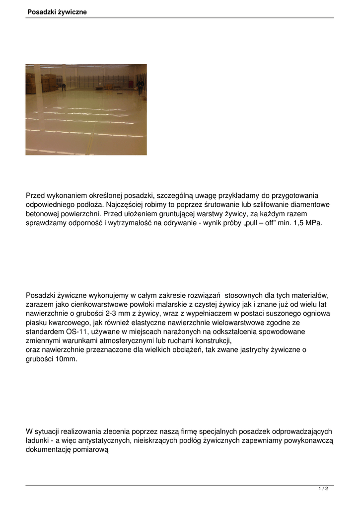 Posadzki żywiczne Przed wykonaniem określonej posadzki, szczególną uwagę przykładamy do przygotowania odpowiedniego podłoża. Najczęściej robimy to poprzez śrutowanie lub szlifowanie diamentowe betonowej powierzchni. Przed ułożeniem gruntującej warstwy żywicy, za każdym razem sprawdzamy odporność i wytrzymałość na odrywanie - wynik próby „pull – off” min. 1,5 MPa. Posadzki żywiczne wykonujemy w całym zakresie rozwiązań stosownych dla tych materiałów, zarazem jako cienkowarstwowe powłoki malarskie z czystej żywicy jak i znane już od wielu lat nawierzchnie o grubości 2-3 mm z żywicy, wraz z wypełniaczem w postaci suszonego ogniowa piasku kwarcowego, jak również elastyczne nawierzchnie wielowarstwowe zgodne ze standardem OS-11, używane w miejscach narażonych na odkształcenia spowodowane zmiennymi warunkami atmosferycznymi lub ruchami konstrukcji, oraz nawierzchnie przeznaczone dla wielkich obciążeń, tak zwane jastrychy żywiczne o grubości 10mm. W sytuacji realizowania zlecenia poprzez naszą firmę specjalnych posadzek odprowadzających ładunki - a więc antystatycznych, nieiskrzących podłóg żywicznych zapewniamy powykonawczą dokumentację pomiarową 1/2 Posadzki żywiczne 2/2