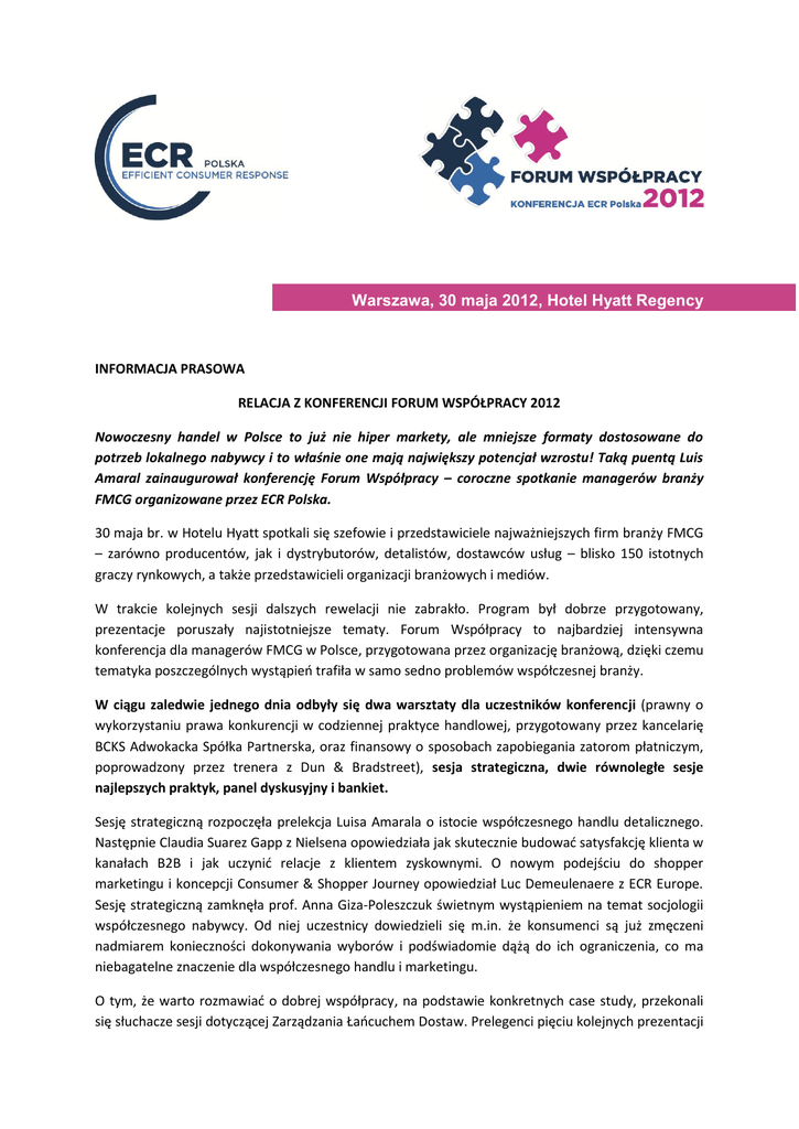Warszawa, 30 maja 2012, Hotel Hyatt Regency INFORMACJA PRASOWA RELACJA Z KONFERENCJI FORUM WSPÓŁPRACY 2012 Nowoczesny handel w Polsce to już nie hiper markety, ale mniejsze formaty dostosowane do potrzeb lokalnego nabywcy i to właśnie one mają największy potencjał wzrostu! Taką puentą Luis Amaral zainaugurował konferencję Forum Współpracy – coroczne spotkanie managerów branży FMCG organizowane przez ECR Polska. 30 maja br. w Hotelu Hyatt spotkali się szefowie i przedstawiciele najważniejszych firm branży FMCG – zarówno producentów, jak i dystrybutorów, detalistów, dostawców usług – blisko 150 istotnych graczy rynkowych, a także przedstawicieli organizacji branżowych i mediów. W trakcie kolejnych sesji dalszych rewelacji nie zabrakło. Program był dobrze przygotowany, prezentacje poruszały najistotniejsze tematy. Forum Współpracy to najbardziej intensywna konferencja dla managerów FMCG w Polsce, przygotowana przez organizację branżową, dzięki czemu tematyka poszczególnych wystąpień trafiła w samo sedno problemów współczesnej branży. W ciągu zaledwie jednego dnia odbyły się dwa warsztaty dla uczestników konferencji (prawny o wykorzystaniu prawa konkurencji w codziennej praktyce handlowej, przygotowany przez kancelarię BCKS Adwokacka Spółka Partnerska, oraz finansowy o sposobach zapobiegania zatorom płatniczym, poprowadzony przez trenera z Dun & Bradstreet), sesja strategiczna, dwie równoległe sesje najlepszych praktyk, panel dyskusyjny i bankiet. Sesję strategiczną rozpoczęła prelekcja Luisa Amarala o istocie współczesnego handlu detalicznego. Następnie Claudia Suarez Gapp z Nielsena opowiedziała jak skutecznie budować satysfakcję klienta w kanałach B2B i jak uczynić relacje z klientem zyskownymi. O nowym podejściu do shopper marketingu i koncepcji Consumer & Shopper Journey opowiedział Luc Demeulenaere z ECR Europe. Sesję strategiczną zamknęła prof. Anna Giza-Poleszczuk świetnym wystąpieniem na temat socjologii współczesnego nabywcy. Od niej uczestnicy dowiedzieli się m.in. że konsumenci są już zmęczeni nadmiarem konieczności dokonywania wyborów i podświadomie dążą do ich ograniczenia, co ma niebagatelne znaczenie dla współczesnego handlu i marketingu. O tym, że warto rozmawiać o dobrej współpracy, na podstawie konkretnych case study, przekonali się słuchacze sesji dotyczącej Zarządzania Łańcuchem Dostaw. Prelegenci pięciu kolejnych prezentacji wskazali rzeczywiste korzyści współpracy w zakresie współdzielenia transportu oraz elektronicznej wymiany danych i wdrażania GDSN. Jednocześnie uczestnicy równoległej sesji New Commerce zgłębili wiedzę dotyczącą wykorzystania technologii mobilnych w sprzedaży FMCG. Sześć krótkich prezentacji utwierdziło uczestników w przekonaniu, że już wkrótce telefonem komórkowym zapłacimy za codzienne zakupy a aplikacje mobilne będą w coraz większym stopniu wspierały sprzedaż, np. podpowiadając konsumentom przepis na obiad czy wpisując pozycje z gazetek sklepowych do mobilnej listy zakupów. Wspomniano również o znaczeniu jakości dany w kanałach B2C oraz o biznesowej wartości informacji zawartej w mediach społecznościowych. Tematyka panelu dyskusyjnego zamknęła się w 3 K – Konsument, Konsolidacja i Kolaboracja i była logicznym zwieńczeniem części oficjalnej konferencji (sesji strategicznej oraz sesji najlepszych praktyk). Uczestnikami debaty byli: Michał Mrowiec (Unilever Polska), Paweł ChodakowskiMalkiewicz, Małgorzata Piekarska (Auchan Direct), Adam Manikowski (Jeronimo Martins Dystrybucja), Krzysztof Gradecki (EKO Holding), Maciej Ptaszyński (Polska Izba Handlu), Pierre Detry (Nestle Polska) oraz Marek Wesołowski (Stokrotka). Po części oficjalnej konferencji uczestnicy mieli okazję kontynuować rozmowy biznesowe w mniej formalnej atmosferze. Organizatorzy wspólnie z Partnerami konferencji przygotowali degustację dobrego wina i whisky. Forum Współpracy po raz kolejny dowiodło, iż współpraca w myśl koncepcji ECR to praktyczne narzędzie redukcji kosztów - standaryzacji, upraszczania procesów, wzrostu wydajności komunikacji, a korzyści ze współpracy czerpią zarówno wielkie, międzynarodowe koncerny, jak i firmy mniejsze, regionalne, które dzięki wymianie doświadczeń prężnie się rozwijają. Managerowie uczestniczący w konferencji otrzymali sporą porcję solidnej, praktycznej, aktualnej wiedzy o rynku oraz praktyczne wskazówki jak współpracując, dostarczać trwałej wartości dla klientów – lepiej, szybciej i mniejszym kosztem. Kolejne Forum Współpracy za rok! Już dziś warto zarezerwować sobie termin 6 czerwca 2013! Polecamy i zapraszamy! Anna Jarzębowska-Kwiatek Manager ds. Komunikacji ECR Polska [email protected] Galeria zdjęć z konferencji dostępna jest tutaj: https://picasaweb.google.com/ECRPolskaFoto/FW2012