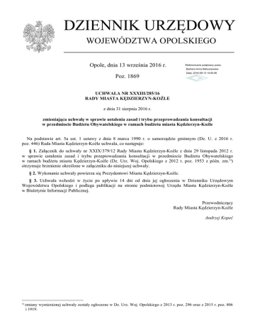 DZIENNIK URZĘDOWY WOJEWÓDZTWA OPOLSKIEGO Opole, dnia 13 września 2016 r. Elektronicznie podpisany przez: Barbara Anna Bieluszewska Data: 2016-09-13 14:05:46 Poz. 1869 UCHWAŁA NR XXXIII/285/16 RADY MIASTA KĘDZIERZYN-KOŹLE z dnia 31 sierpnia 2016 r. zmieniająca uchwałę w sprawie ustalenia zasad i trybu przeprowadzania konsultacji w przedmiocie Budżetu Obywatelskiego w ramach budżetu miasta Kędzierzyn-Koźle Na podstawie art. 5a ust. 1 ustawy z dnia 8 marca 1990 r. o samorządzie gminnym (Dz. U. z 2016 r. poz. 446) Rada Miasta Kędzierzyn-Koźle uchwala, co następuje: § 1. Załącznik do uchwały nr XXIX/379/12 Rady Miasta Kędzierzyn-Koźle z dnia 29 listopada 2012 r. w sprawie ustalenia zasad i trybu przeprowadzania konsultacji w przedmiocie Budżetu Obywatelskiego w ramach budżetu miasta Kędzierzyn-Koźle (Dz. Urz. Woj. Opolskiego z 2012 r. poz. 1953 z późn. zm.1)) otrzymuje brzmienie określone w załączniku do niniejszej uchwały. § 2. Wykonanie uchwały powierza się Prezydentowi Miasta Kędzierzyn-Koźle. § 3. Uchwała wchodzi w życie po upływie 14 dni od dnia jej ogłoszenia w Dzienniku Urzędowym Województwa Opolskiego i podlega publikacji na stronie podmiotowej Urzędu Miasta Kędzierzyn-Koźle w Biuletynie Informacji Publicznej. Przewodniczący Rady Miasta Kędzierzyn-Koźle Andrzej Kopeć 1) zmiany wymienionej uchwały zostały ogłoszone w Dz. Urz. Woj. Opolskiego z 2013 r. poz. 296 oraz z 2015 r. poz. 806 i 1919. Dziennik Urzędowy Województwa Opolskiego –2– Poz. 1869 Załącznik do uchwały nr XXXIII/285/16 Rady Miasta Kędzierzyn-Koźle z dnia 31 sierpnia 2016 r. Zasady i tryb przeprowadzania konsultacji w przedmiocie Budżetu Obywatelskiego w ramach budżetu miasta Kędzierzyn-Koźle Rozdział 1 Postanowienia ogólne § 1. Ilekroć w niniejszym akcie jest mowa o: 1) Budżecie Obywatelskim – należy przez to rozumieć wykaz zadań wprowadzonych do budżetu miasta Kędzierzyn-Koźle w wyniku konsultacji z mieszkańcami miasta Kędzierzyn-Koźle; 2) Gminie – należy przez to rozumieć Miasto Kędzierzyn-Koźle; 3) Radzie Miasta – należy przez to rozumieć Radę Miasta Kędzierzyn-Koźle; 4) Prezydencie Miasta – należy przez to rozumieć Prezydenta Miasta Kędzierzyn-Koźle; 5) Urzędzie Miasta – należy przez to rozumieć Urząd Miasta Kędzierzyn-Koźle; 6) Osiedlu – należy przez to rozumieć jednostki pomocnicze Gminy Kędzierzyn-Koźle w rozumieniu przepisów ustawy o samorządzie gminnym; 7) mieszkańcu Osiedla – należy przez to rozumieć posiadającego pełną lub ograniczoną zdolność do czynności prawnych mieszkańca miasta Kędzierzyn-Koźle, zamieszkującego na terenie danego Osiedla; 8) budżecie miasta – należy przez to rozumieć budżet miasta Kędzierzyn-Koźle; 9) zasadach – należy przez to rozumieć określone niniejszym aktem zasady przeprowadzania konsultacji w przedmiocie Budżetu Obywatelskiego; 10) konsultacjach – należy przez to rozumieć konsultacje z mieszkańcami Kędzierzyna-Koźla przeprowadzone na podstawie art. 5a ustawy z dnia 8 marca 1990 r. o samorządzie gminnym (Dz. U. z 2016 r. poz. 446); 11) rezerwie celowej – należy przez to rozumieć rezerwę celową na wydatki, których szczegółowy podział na pozycje klasyfikacji budżetowej nie może być dokonany w okresie opracowywania budżetu jednostki samorządu terytorialnego, określoną w art. 222 ust. 2 pkt 1 ustawy z dnia 27 sierpnia 2009 r. o finansach publicznych (Dz. U. z 2013 r. poz. 885 z późn. zm.). § 2.1. Konsultacje w przedmiocie Budżetu Obywatelskiego mogą być przeprowadzane każdorazowo w przypadku potrzeby wprowadzenia do budżetu miasta Kędzierzyn-Koźle zadań finansowanych ze środków rezerwy celowej, przewidzianej w projekcie budżetu miasta lub utworzonej w budżecie miasta dla wydatków objętych Budżetem Obywatelskim. 2. Rezerwa celowa podlega podziałowi na poszczególne Osiedla z uwzględnieniem kwot stałych przypadających w równej wysokości każdemu Osiedlu oraz kwot zmiennych uzależnionych od liczby mieszkańców danego Osiedla. Warunkiem przyznania kwot, o których mowa wyżej jest przedłożenie, w terminie wskazanym w statucie Osiedla, sprawozdania z wykonania rocznego planu rzeczowo-finansowego Osiedla w roku poprzedzającym przeprowadzenie konsultacji w przedmiocie Budżetu Obywatelskiego. 3. Łączna wartość zadań objętych Budżetem Obywatelskim w danym roku wynosi nie więcej niż kwota rezerwy celowej przewidzianej w projekcie budżetu miasta lub utworzonej w budżecie miasta dla wydatków objętych Budżetem Obywatelskim. § 3. Rozpoczęcie konsultacji w przedmiocie Budżetu Obywatelskiego następuje z datą zamieszczenia przez Prezydenta Miasta na stronie podmiotowej Urzędu Miasta w Biuletynie Informacji Publicznej ogłoszenia, zawierającego: 1) opis trybu i podmiotów uprawnionych do zgłaszania zadań do Budżetu Obywatelskiego; 2) wskazanie terminu zgłaszania zadań do Budżetu Obywatelskiego; Dziennik Urzędowy Województwa Opolskiego –3– Poz. 1869 3) określenie wartości kwoty podziału rezerwy celowej przewidzianej w projekcie budżetu miasta lub utworzonej w budżecie miasta na dany rok dla wydatków objętych Budżetem Obywatelskim na kwoty przypadające na poszczególne Osiedla. Rozdział 2 Tryb i podmioty uprawnione do zgłaszania zadań do Budżetu Obywatelskiego § 4.1. Zgłoszenia zadania do Budżetu Obywatelskiego może dokonać: 1) każdy mieszkaniec Osiedla; 2) organizacja pozarządowa, której siedziba, siedziba oddziału lub realizacja zadań publicznych, o których mowa w ustawie z dnia 24 kwietnia 2003 r. o działalności pożytku publicznego i wolontariacie (Dz. U. z 2016 r. poz. 395 z późn. zm.), zlokalizowana jest na terenie miasta Kędzierzyn-Koźle; 3) podmiot wymieniony w art. 3 ust. 3 ustawy z dnia 24 kwietnia 2003 r. o działalności pożytku publicznego i wolontariacie (Dz. U. z 2016 r. poz. 395 z późn. zm.), którego siedziba, siedziba oddzi