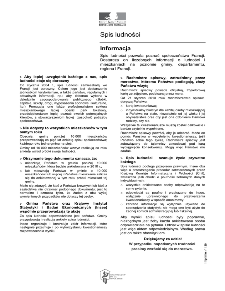 Spis ludności Informacja Spis ludności pozwala poznać społeczeństwo Francji. Dostarcza on liczebnych informacji o ludności i mieszkaniach na poziomie gminy, departamentu, regionu i Francji. Od stycznia 2004 r., spis ludności zamieszkałej we Francji jest coroczny. Celem jego jest dostarczenie jednostkom terytorialnym, a także państwu, regularnych i aktualnych informacji, np.: aby dokonać wyboru w dziedzinie zagospodarowania publicznego (żłobki, szpitale, szkoły, drogi, wyposażenia sportowe i kulturalne, itp.) Pomagają one także profesjonalistom sektora mieszkaniowego lepiej ocenić park lokalowy, przedsiębiorstwom lepiej poznać swoich potencjalnych klientów, a stowarzyszeniom lepiej zaspokoić potrzeby społeczeństwa. > Nie dotyczy to wszystkich mieszkańców w tym samym roku Obecnie, gminy poniżej 10 000 mieszkańców przeprowadzają co pięć lat ankietę spisu społeczeństwa; każdego roku jedna gmina na pięć. Gminy od 10 000 mieszkańców wzwyż realizują co roku ankietę wśród próbki swojej ludności. > Otrzymanie tego dokumentu oznacza, że: o mieszkają Państwo w gminie poniżej 10 000 mieszkańców, która będzie ankietowana w 2010 r.; o lub mieszkają Państwo w gminie o 10 000 mieszkańców lub więcej i Państwa mieszkanie zalicza się do ankietowanej w tym roku próbki mieszkań tej gminy. Może się zdarzyć, że ktoś z Państwa krewnych lub ktoś z sąsiedztwa nie otrzymał podobnego dokumentu; jest to normalne i oznacza tylko, że żaden z obu wyżej wymienionych przypadków nie dotyczy tej osoby. > Gmina Państwa oraz Krajowy Instytut Statystyki i Badań Ekonomicznych (Insee) wspólnie przeprowadzają tę akcję Za spis ludności odpowiedzialne jest państwo. Gminy przygotowują i realizują ankiety spisu ludności. Insee organizuje i kontroluje zbiór informacji, które następnie przejmuje i po wykorzystaniu kwestionariuszy rozpowszechnia wyniki. > Rachmistrz spisowy, zatrudniony przez merostwo, któremu Państwo podlegają, złoży Państwu wizytę Rachmistrz spisowy posiada oficjalną, trójkolorową kartę ze zdjęciem, podpisaną przez mera. Od 21 styczen 2010 roku rachmistrzowie spisowi doręczą Państwu: o kartę kwaterunkową; o indywidualny biuletyn dla każdej osoby mieszkającej u Państwa na stałe, niezależnie od jej wieku i jej obywatelstwa oraz czy jest ona członkiem Państwa rodziny, czy nie. Wszystkie te kwestionariusze muszą zostać całkowicie i bardzo czytelnie wypełnione. Rachmistrz spisowy powróci, aby je odebrać. Może on pomóc Państwu w wypełnieniu kwestionariuszy, jeśli Państwo sobie tego życzą. Rachmistrz spisowy jest zobowiązany do tajemnicy zawodowej pod karą wyciągnięcia konsekwencji. Mogą więc Państwo mu zaufać. > Spis ludności każdego szanuje życie prywatne Spis ludności podlega przepisom prawnym. Insee dba więc o przestrzeganie procedur zatwierdzonych przez Krajową Komisję Informatyczną i Wolności (Cnil), zwłaszcza jeśli chodzi o poufność zebranych danych indywidualnych: o wszystkie ankietowane osoby odpowiadają na te same pytania; o odpowiedzi są poufne i przekazane do Insee, wyłącznie uprawnionego do przetwarzania kwestionariuszy w sposób anonimowy; o zebrane informacje są wyłącznie używane do sporządzania statystyk; nie mogą one być użyte do żadnej kontroli administracyjnej lub fiskalnej. Aby wyniki spisu ludności były poprawne, niezbędnym jest żeby każda ankietowana osoba odpowiedziała na pytania. Udział w spisie ludności jest więc aktem odpowiedzialnym. Według prawa jest on także obowiązkiem. Dziękujemy za udział W przypadku napotkanych trudności prosimy zwrócić się do merostwa. Imprimé n° 139 > Aby lepiej uwzględnić każdego z nas, spis ludności staje się doroczny