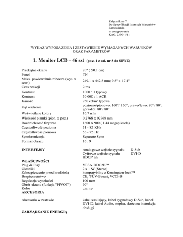 Załącznik nr 7 Do Specyfikacji Istotnych Warunków Zamówienia w postępowaniu KAG. 2390-1/11 WYKAZ WYPOSAśENIA I ZESTAWIENIE WYMAGANYCH WARUNKÓW ORAZ PARAMETRÓW 1. Monitor LCD – 46 szt Przekątna ekranu Panel Maks. powierzchnia robocza (wys. x szer.) Czas reakcji Kontrast Kontrast Jasność Kąt widzenia Wyświetlane kolory Wielkość plamki (pion. x poz.) Rozdzielczość fizyczna Częstotliwość pozioma Częstotliwość pionowa Synchronizacja Format obrazu INTERFEJSY WŁAŚCIWOŚCI Plug & Play Głośniki Zabezpieczenie przed kradzieŜą Bezpieczeństwo Regulacja wysokości Obrót ekranu (funkcja "PIVOT") Kolor AKCESORIA Akcesoria w zestawie ZARZĄDZANIE ENERGIĄ (poz. 1 z zał. nr 8 do SIWZ) 20" ( 50.1 cm) TN 249.1 x 442.8 mm; 9.8" x 17.4" 2 ms 1000 : 1 typowy 30 000 : 1 ACR 250 cd/m² typowa poziomo/pionowo: 160°/ 160°; prawo/lewo: 80°/ 80°; góra/dół: 80°/ 80° 16.7 mln 0.2768 x 02768 mm 1600 x 900 ( 1.44 megapiksela) 31 - 83 KHz 56 - 75 Hz Separate Sync 16 : 9 Analogowe wejście sygnału Cyfrowe wejście sygnału HDCP tak D-Sub DVI-D VESA DDC2B™ 2 x 1 W (Stereo) kompatybilny z Kensington-lock™ CE, TÜV-Bauart, VCCI-B 100 mm 90° czarny kabel zasilający, kabel sygnałowy D-Sub, kabel DVI-D, kabel Audio, stopka, skrócona instrukcja obsługi Zasilanie Zasilacz Zarządzanie energią AC 100 - 240 V, 50 / 60 Hz wewnętrzny VESA DPMS, Energy Star 2. Monitor LCD – 3 szt (poz. 2 z zał. nr 8 do SIWZ) Przekątna ekranu Panel 24" ( 60 cm) TN Czas reakcji Kontrast Kontrast Jasność Jasność 2 ms 1000 : 1 typowy 70000 : 1 ACR 300 cd/m² typowa 400 cd/m² maks. Wyświetlane kolory 16.7 mln Rozdzielczość fizycznaFull HD 1080p, 1920 x 1080 ( 2.1 megapiksela) Synchronizacja Separate Sync Format obrazu 16 : 9 INTERFEJSY Analogowe wejście sygnałuD-Sub Cyfrowe wejście sygnału DVI-D, HDMI HDCP tak D-Sub, DVI-D, HDMI WŁAŚCIWOŚCI Plug & Play VESA DDC 1/2B™ Głośniki 2 x 3 W (Stereo) Zabezpieczenie przed kradzieŜąkompatybilny z Kensington-lock™ CE, TUV/Baurt Bezpieczeństwo Kolor AKCESORIA czarny Akcesoria w kabel zasilający, kabel sygnałowy D-Sub, kabel DVI-D, kabel Audio, zestawie instrukcja obsługi, stopka ZARZĄDZANIE ENERGIĄ Zasilanie AC 100 - 240 V, 50 / 60 Hz Zasilacz wewnętrzny Zarządzanie energiąVESA DPMS 3. Komputer stacjonarny – 23 szt (poz. 3 z zał. nr 8 do SIWZ) Platforma Intel Q67 Procesor Intel® Core™ i5-2400 Processor (6M Cache, 3.10 GHz) Ilość rdzeni 4 Ilość pamięci operacyjnej 4 GB Rodzaj zastosowanej pamięci DDR3-1333 (PC3-10600) Karta graficzna Układ GPU NVIDIA Quadro Quadro 400 Format platformy 6,94 cm (2,731 cala) wys. x 14,17 cm (5,58 cala) dług., pojedynczy slot Liczba rdzeni CUDA 48 Wielkość bufora ramki 512 MB DDR3 Interfejs pamięci 64-bit Przepustowość pamięci (GB/s) 12.3 Złącze: DVI; D-Sub Maksymalna rozdzielczość w trybie cyfrowym przy 60 Hz 2560x1600 3D Vision/3D Vision Pro OpenGL 3.3 Microsoft Direct X 10.1 Shader Model 4.0 Architektura NVIDIA CUDA Technologia Mosaic Oprogramowanie do zarządzania wyświetlaniem NVIEW DualView CD-ROM (sterowniki systemowe, podręczniki, oprogramowanie dodatkowe), Pojemność dysku twardego 1000 GB Rodzaj zastosowanego dysku magnetyczny Interfejs dysku twardego Serial ATA/600 Napęd optyczny DVD+/-RW Karta dźwiękowa zintegrowana 5.1 HD Realtek Czytnik kart pamięci xD; SD; MS Pro; MS; MMC; CF Obudowa micro-ATX Złącza na przednim panelu audio;2x USB Złącza na tylnym panelu Audio;6x USB; 1x RJ45; 1x PS/2; 1x LPT; 1x DVI-I Zasilacz 350 W Zainstalowany 1 wentylator opcjonalne 2 wentylatory System operacyjny Windows 7 Professional (64bit) Akcesoria zestaw klawiatura i mysz Logitech (optyczna) 4. Komputer stacjonarny – 2 szt (poz. 4 z zał. nr 8 do SIWZ) Platforma Intel Q67 Procesor Intel® Core™ i5-2400 Processor (6M Cache, 3.10 GHz) Ilość rdzeni 4 Ilość pamięci operacyjnej 4 GB Rodzaj zastosowanej pamięci DDR3-1333 (PC3-10600) Karta graficzna zintegrowana Pojemność dysku twardego 500 GB Rodzaj zastosowanego dysku magnetyczny Interfejs dysku twardego Serial ATA/600 Napęd optyczny DVD+/-RW Karta dźwiękowa zintegrowana 5.1 HD Realtek Czytnik kart pamięci xD; SD; MS Pro; MS; MMC; CF Obudowa micro-ATX Złącza na przednim panelu audio;2x USB Złącza na tylnym panelu Audio;6x USB; 1x RJ45; 1x PS/2; 1x LPT; 1x DVI-I Zasilacz 350 W Zainstalowane 1 wentylator opcjonalne 2 wentylatory System operacyjny Windows 7 Professional (64bit) Akcesoria Zestaw klawiatura i mysz Logitech (optyczna) 5. Notebook - 2szt (poz. 5 z zał. nr 8 do SIWZ) przekątna ekranu LCD 15.6 cali podświetlany diodami LED nominalna rozdzielczość LCD 1600 x 900 pikseli typ ekranu matowy procesor Intel® Core™ i7 model procesora i7-2630QM (2.0 GHz, 6 MB cache) ilość rdzeni 4 szt. wielkość pamięci RAM 4 GB typ zastosowanej pamięci RAM DDR3 (1333 MHz) pamięci RAM rozszerzalna do 8 GB pojemność dysku twardego 500 GB interfejs dysku twardego Serial ATA napęd optyczny DVD+/-RW DL dedykowana grafika tak karta graficzna NVIDIA GeForce GT 540M (DirectX11, SM 5.0, PureVideoHD) pamięć karty graficznej 2048 MB wyjścia karty graficznej wyjście HDMI, wyjście D-Sub typ akumulatora litowo-jonowy 6-komorowy pojemność akumulatora 5200 mAh karta dźwiękowa wejście mikrofonu stereo czytnik kart pamięci SD, MS-Pro, MMC, Memory Stick komunikacja Bluetooth, LAN 1 Gbps,WiFi IEEE 802.11b/g/n interfejsy 3x USB dodatkowe wyposaŜenie/funkcjonalność Kamera, wbudowany mikrofon, mysz (optyczna; komunikacja z myszą: bezprzewodowa; rozdzielczość pracy: 1600 dpi; interfejs: USB; zastosowane technologie: Nanoodbiornik) zainstalowany system operacyjny Windows 7 Professional 64 waga do 2.6 kg inne Plecak (przedział na notebooka 15”16” amortyzowany pianką HDF; komora z przeznaczeniem na dokumenty oraz akcesoria; przednia kieszeń z przestrzenią roboczą; oddzielna kieszeń na zasilacz oraz kable; ergonomiczne ukształtowanie tyłu plecaka; wygodne i regulowane szelki 6. Projektor -1szt (poz. 6 z 