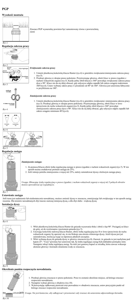 PGP Wysokość montażu Zraszacz PGP wynurzalny powinien być zamontowany równo z powierzchnią ziemi Rys 1. Regulacja zakresu pracy Rys 2. Zwiększanie zakresu pracy 1. Umieść plastikową końcówkę klucza Hunter (rys.4) w gnieżdzie zwiększania/zmniejszania zakresu pracy (rys.5). 2. Przekręć głowicę w skrajne prawe położenie. Przytrzymując głowicę, obróć klucz w prawo (zgodnie z ruchem wskazówek zegara) (rys.5). Każdy pełny obrót klucza o 360° powoduje zwiększenie zakresu pracy dysz o 90°. Klucz nie da się dalej obracać, gdy usłyszysz odgłos zapadki lub zakres osiągnie maksimum 360°(rys.6). Ustaw wybrany zakres pracy w przedziale od 40° do 360°. Głowica jest ustawiona fabrycznie w przybliżeniu na 180°. Rys 3. Zmniejszenie zakresu pracy 1. Umieść plastikową końcówkę klucza Hunter (rys.4) w gnieżdzie zwiększania/ zmniejszania zakresu pracy (rys.5). Przekręć głowicę w skrajne prawe położenie. Przytrzymując głowicę, obróć klucz w lewo (przeciwnie do ruchu wskazówek zegara) (rys.5). Każdy pełny obrót klucza o 360° powoduje zmniejszeenie zakresu pracy dysz o 90°. Klucz nie da się dalej obracać, gdy usłyszysz odgłos zapadki lub zakres osiągnie minimum 40°(rys.6). Rys 4. Rys 6. Rys 5. Regulacja zasięgu Zmniejszenie zasięgu: 1. Za pomoca Klucza obróć śrubę regulacyjną zasięgu w prawo (zgodnie z ruchem wskazówek zegara) (rys.7). W ten sposób można zredukować promień zasięgu do 25%. 2. Jeśli istnieje potreba zmniejszenia o więcej niż 25%, należy zainstalować dyszę o krótszym zasięgu pracy. Uwaga. Obracając śrubę regulacyjną w prawo (zgodnie z ruchem wskazówek zegara) o więcej niż 5 pełnych obrotów możesz spowodować jej wypadnięcie. Rys 7. Ustawienie zasięgu Jeśli teren jest nadmiernie lub niedostatecznie nawadniany, możesz zmienić dyszę w zraszaczu, zmniejszając lub zwiększając w ten sposób zasięg roszenia. Dla terenów nawadnianych zbyt mocno zastosuj mniejszą dyszę, a dla zbyt słabo - większą dyszę. Instalacja dyszy Rys 8. 1. Włóż plastikową końcówkę klucza Hunter do gniazda wysuwania tłoka i obróć o kąt 90°. Pociągnij za klucz do góry, aż do wyrównania z poziomem gniazda (rys.7). 2. Używając końcówki stalowej klucza Hunter, obróć śrubę regulacyjną (rys.9) w lewo (przeciwnie do ruchu wskazówek zegara), by upewnić się, że nie blokuje ona otworu wlotowego dyszy. Jeżeli dysza jest już zainstalowana, można ją wyjąć za mpomoca płaskich szczypiec. 3. Włóż wybraną dyszę do gniazda dyszy w głowicy zraszacza (rys.8). Zauważ, że gniazdo to jest nachylone pod kątem 25°. "Uszy" powinny być ustawione tak, by śruba regulująca zasięg była dokładnie pomiędzy nimi. Następnie wkręć śrubę regulującą zasięg. Na tulei jest gumowy kapsel ze strzałką, która zawsze wskazuje ułożenie głowicy i kierunek strumienia wody ze zraszacza. Rys 9. Określenie punktu rozpoczęcia nawadniania. 1. Przekręć głowicę zraszacza w prawe położenie. Przez to zostanie określone miejsce, od którego zraszacz rozpocznie nawadnianie. 2. Następnie wykręć głowicę z obudowy (rys.10). 3. Wykorzystując ząbkowany pierścień oraz prowadnice w obudowie zraszacza, ustaw precyzyjnie punkt od którego zraszacz rozpocznie nawadnianie. Uwaga. Nie jest konieczne, aby odkopywać i przestawiać cały zraszacz do ustawienia odpowiedniego kierunku. Rys 10.