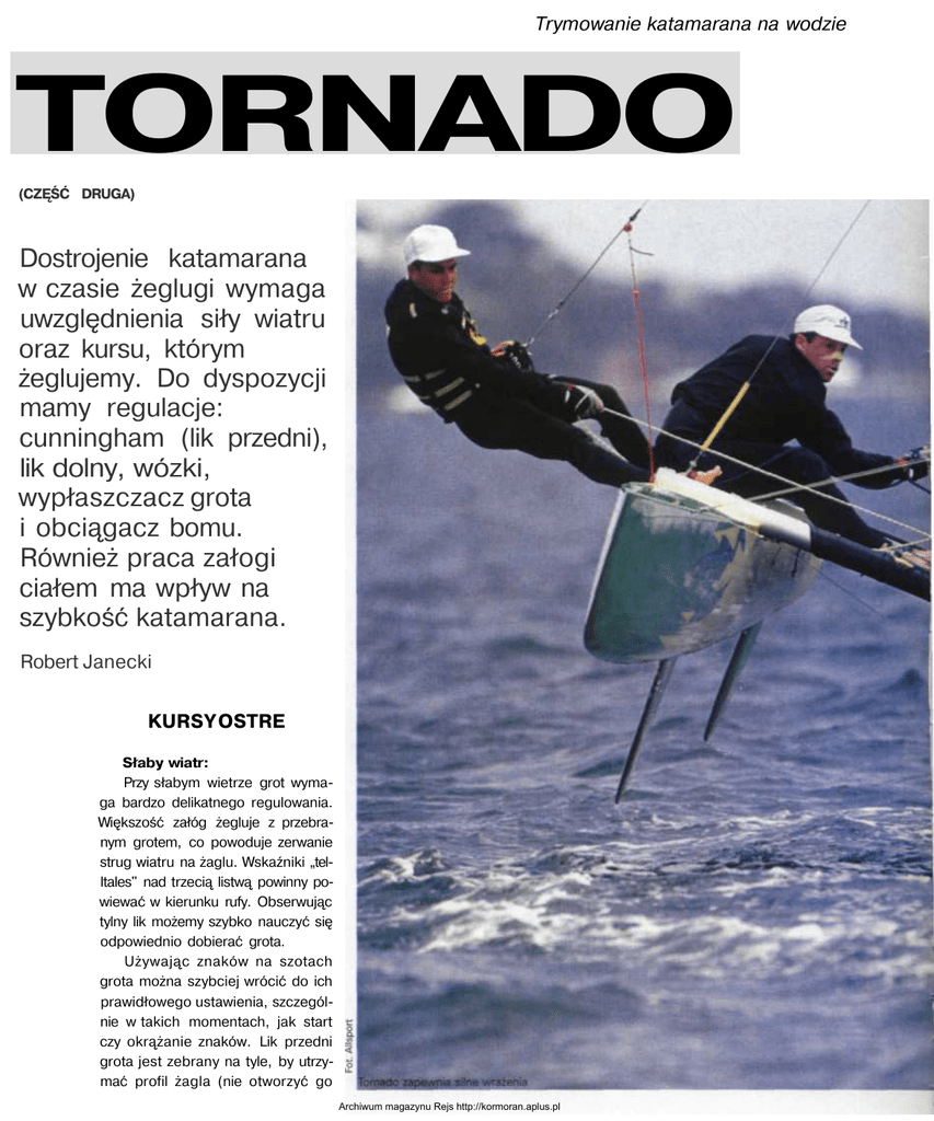 Trymowanie katamarana na wodzie TORNADO (CZĘŚĆ DRUGA) Dostrojenie katamarana w czasie żeglugi wymaga uwzględnienia siły wiatru oraz kursu, którym żeglujemy. Do dyspozycji mamy regulacje: cunningham (lik przedni), lik dolny, wózki, wypłaszczacz grota i obciągacz bomu. Również praca załogi ciałem ma wpływ na szybkość katamarana. Robert Janecki KURSY OSTRE Słaby wiatr: Przy słabym wietrze grot wymaga bardzo delikatnego regulowania. Większość załóg żegluje z przebranym grotem, co powoduje zerwanie strug wiatru na żaglu. Wskaźniki „telItales" nad trzecią listwą powinny powiewać w kierunku rufy. Obserwując tylny lik możemy szybko nauczyć się odpowiednio dobierać grota. Używając znaków na szotach grota można szybciej wrócić do ich prawidłowego ustawienia, szczególnie w takich momentach, jak start czy okrążanie znaków. Lik przedni grota jest zebrany na tyle, by utrzymać profil żagla (nie otworzyć go Archiwum magazynu Rejs http://kormoran.aplus.pl Balastujący na trapezie powinien mieć stopy utożone prostopadle do siebie zbytnio na górze). Wózek umieszczony jest pośrodku, a lik dolny lekko otwarty (2 do 5 cm, licząc od środka bomu). Gdy tylko załogant będzie mógł użyć trapezu, powinien zaknagować foka i przejąć kontrolę nad grotem. Przy wietrze porywistym i falach doświadczeni zatoganci powinni w taki sposób pracować szotem, aby pływak byt minimalnie w powietrzu. Do ustawienia foka przy żegludze na wiatr korzystam z dwóch pomiarów. Pierwszy to odległość od tylnej krawędzi przedniej belki do osi obrotu bloczka (A), a drugi to odległość od wewnętrznej krawędzi pływaka do osi obrotu bloczka (B). W słabym wietrze najczęściej spotykanym ustawieniem foka jest: A = 130-1359, B =40 cm. Przepływ laminarny strugi w przedniej części grota, w dalszej jego części przechodzi w przepływ turbulentny. Jest to optymalne ustawienie żagla. Aby je uzyskać, maszt musi mieć odpowiednią „rotację" - kąt natarcia. W słabym wietrze rotacja masztu wynosi około 80-90 stopni (jest to kąt zawarty między diametralną łodzi a diametralną masztu), a maszt skierowany jest likszparą miedzy wantę zawietrzną a belkę. Gdy tylko załogant użyje trapezu, natychmiast rotacja masztu musi być lekko puszczona do środka. W słabym wietrze załoga znajduje się na nawietrznym pływaku na wysokości przedniej belki (załogant przed belką, sternik za belką (jak najbliżej załoganta). Uniesienie ruf pływaków spowoduje, że będą one „ciągnęły" za sobą mniej wody. Skróci się linia wodna pływaków, a co za tym idzie, zmniejszą się ich opory w wodzie. Gdy wiatr zaczyna wzrastać, a nawietrzny pływak momentami zaczyna wychodzić z wody, cała załoga przenosi się do tyłu. Gdy załogant zaczyna wychodzić na trapez, sternik siada bezpośrednio za wantą i zaczyna balastować. Średni i silny wiatr: W sytuacji, gdy zawietrzny pływak zaczyna wchodzić pod wodę, a katamaran gwałtownie wyhamowuje, załogant powinien odpowiednio wyluzować szot grota, aby chronić katamaran przed wywrotką przez dziób. Kiedy katamaran znowu przyspieszy, zatogant musi bardzo szybko dobrać grota - to jedyny sposób, aby utrzymać optymalną prędkość w żegludze na wiatr. Cunningham liku przedniego może pozostawać luźny tak długo, jak dtugo sternik nie musi mocno balastować. Wraz ze wzrostem siły wiatru należy dobrać lik przedni, aby utrzymać nawietrzny pływak nisko nad wodą i optymalnie szybką żeglugę na wiatr. Gdy wiatr słabnie, lik przedni należy odpowiednio poluzować. W bardzo silnym wietrze, cunningham wybieramy maksymalnie, czasami niezbędna jest tu pomoc zatoganta. W żegludze na wiatr jest to płynna regulacja, która powinna być na bieżąco kontrolowana przez sternika. Wózek grota przy silnym wietrze na halsówce pozostaje zawsze na środku tylnej belki, ale szot grota na- Archiwum magazynu Rejs http://kormoran.aplus.pl leży luzować, momentami bardzo mocno. Jedynym odstępstwem od tej reguły jest sytuacja, gdy musimy nagle ominąć inną łódkę. Należy wtedy, podczas odpadania, odpuścić nieznacznie wózek na zewnątrz (10-15 cm), gdyż samo wyluzowanie szota może nie wystarczyć. Przy silniejszym wietrze, najczęściej spotyka- Prowadzenie nawietrznego pływaka minimalnie nad powierzchnią wody przy optymalnej prędkości wymaga synchronizacji pracy sterem i szotem grota nym ustawieniem foka jest: 145-150 cm (A) i 15-20 cm (B). W średnim wietrze „rotacja" masztu powinna wynosić około 45 stopni. Przy bardzo silnym wietrze należy uważać, aby nie skręcić masztu za bardzo do środka. Zawietrzny saling nie powinien wysunąć się poza lik tylny foka. Przy porywistym wietrze, linka trapezowa musi być maksymalnie skrócona. Gdy sita wiatru wzrośnie i ustali się, załogant maksymalnie opuszcza się na trapezie. Stopy powinien mieć ułożone pod kątem prostym do siebie. Takie ustawienie stóp zapewni mu utrzymanie równowagi, gdy pływak zderzy się z falą, a katamaran gwałtownie wyhamuje. Stopy oparte są całkowicie o burtę, mogą jednak czubkami pal- Prawidłowe rozmieszczenie ciężaru załogi na nawietrznym pływaku przy kursie na wiatr ców zahaczać o górną krawędź pokładu. Załogant stoi na trapezie przed wantą. Sternik balastuje, trzymając się jedną ręką wanty. KURSY PEŁNE Na kursach pełnych ważną rolę odgrywają takie regulacje jak: barber hauler, rotacja masztu, praca szotami foka oraz praca ciałem, która jest równie ważna jak na kursie ostrym. W kursie z wiatrem wózek szotów grota zostaje puszczony na zewnątrz (znajduje się około 10 cm od wewnętrznej krawędzi zawietrznego ptywaka). Lik dolny grota zostaje zupełnie poluzowany, a odległość grota od bomu w jego środkowej części wynosi około 15-20 cm. Cunningham jest zupełnie poluzowany. Góra grota powinna zdecydowanie otwierać się przy podmuchach wiatru. Na kursie z wiatrem w prawidłowym 