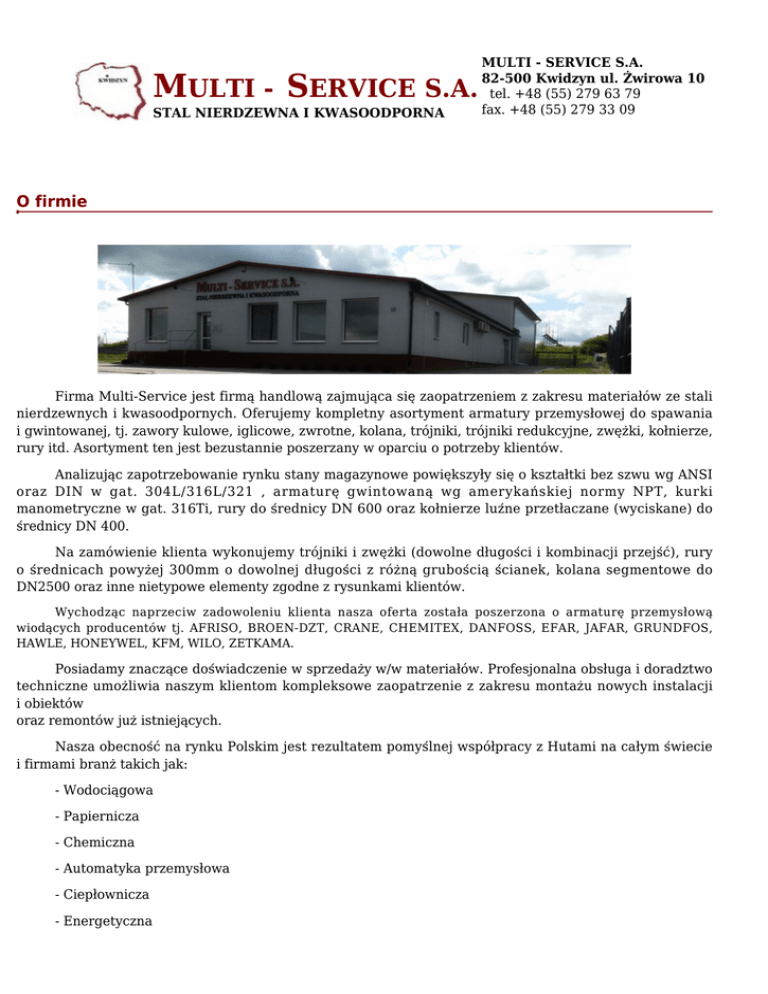 MULTI - SERVICE S.A. STAL NIERDZEWNA I KWASOODPORNA MULTI - SERVICE S.A. 82-500 Kwidzyn ul. Żwirowa 10 tel. +48 (55) 279 63 79 fax. +48 (55) 279 33 09 O firmie Firma Multi-Service jest firmą handlową zajmująca się zaopatrzeniem z zakresu materiałów ze stali nierdzewnych i kwasoodpornych. Oferujemy kompletny asortyment armatury przemysłowej do spawania i gwintowanej, tj. zawory kulowe, iglicowe, zwrotne, kolana, trójniki, trójniki redukcyjne, zwężki, kołnierze, rury itd. Asortyment ten jest bezustannie poszerzany w oparciu o potrzeby klientów. Analizując zapotrzebowanie rynku stany magazynowe powiększyły się o kształtki bez szwu wg ANSI oraz DIN w gat. 304L/316L/321 , armaturę gwintowaną wg amerykańskiej normy NPT, kurki manometryczne w gat. 316Ti, rury do średnicy DN 600 oraz kołnierze luźne przetłaczane (wyciskane) do średnicy DN 400. Na zamówienie klienta wykonujemy trójniki i zwężki (dowolne długości i kombinacji przejść), rury o średnicach powyżej 300mm o dowolnej długości z różną grubością ścianek, kolana segmentowe do DN2500 oraz inne nietypowe elementy zgodne z rysunkami klientów. Wychodząc naprzeciw zadowoleniu klienta nasza oferta została poszerzona o armaturę przemysłową wiodących producentów tj. AFRISO, BROEN-DZT, CRANE, CHEMITEX, DANFOSS, EFAR, JAFAR, GRUNDFOS, HAWLE, HONEYWEL, KFM, WILO, ZETKAMA. Posiadamy znaczące doświadczenie w sprzedaży w/w materiałów. Profesjonalna obsługa i doradztwo techniczne umożliwia naszym klientom kompleksowe zaopatrzenie z zakresu montażu nowych instalacji i obiektów oraz remontów już istniejących. Nasza obecność na rynku Polskim jest rezultatem pomyślnej współpracy z Hutami na całym świecie i firmami branż takich jak: - Wodociągowa - Papiernicza - Chemiczna - Automatyka przemysłowa - Ciepłownicza - Energetyczna - Oczyszczalnie ścieków Na nasze wyroby posiadamy atest PZH. www.multiservice.com.pl e-mail: [email protected]