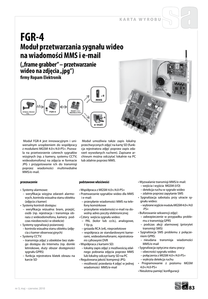 k a r ta w y r o b u FGR-4 Moduł przetwarzania sygnału wideo na wiadomości MMS i e-mail („frame grabber” – przetwarzanie wideo na zdjęcia „jpg”) firmy Ropam Elektronik Moduł FGR-4 jest innowacyjnym i uniwersalnym urządzeniem do współpracy z modułami MGSM 4.0+/4.0-PS+. Pozwala na przetworzenie czterech sygnałów wizyjnych (np. z kamery, systemu CCTV, wideodomofonu) na zdjęcia w formacie JPG i przygotowanie ich do transmisji poprzez wiadomości multimedialne MMS/e-mail. Moduł umożliwia także zapis lokalny przechwyconych zdjęć na kartę SD (funkcja rejestratora zdjęć poprzez zapis zdarzeń wywołanych ruchem). Zapisane archiwum można odczytać lokalnie na PC lub zdalnie poprzez MMS. przeznaczenie podstawowe właściwości • Systemy alarmowe: – weryfikacja wizyjna zdarzeń alarmowych, kontrola wizualna stanu obiektu (zdjęcia z kamer) • Systemy kontroli dostępu: – weryfikacja wizualna: bram, przejść, osób (np. rejestracja i transmisja obrazu z wideodomofonu, kamery podczas nieobecności w obiekcie) • Systemy sygnalizacji pożarowej: – kontrola wizualna stanu obiektu (zdjęcia z kamer obserwacyjnych) • Systemy CCTV: – transmisja zdjęć z obiektów bez stałego dostępu do Internetu (np. domki letniskowe, duży obszar dostępności sygnału GPRS) – funkcja rejestratora klatek obrazu na karcie SD • Współpraca z MGSM 4.0+/4.0-PS+ • Przetwarzanie sygnałów wideo dla MMS i e-mail: – przesyłanie wiadomości MMS na telefony komórkowe – przesyłanie wiadomości e-mail na dowolny adres poczty elektronicznej • Cztery wejścia sygnału wideo: – PAL (kolor lub cz.b.), analogowe, 1 Vp-p, – gniazda RCA (x4), nieprzelotowe – współpraca ze standardowymi kamerami, wideodomofonami, rejestratorami cyfrowymi DVR • Współpraca z kartami SD: – lokalny zapis zdjęć z możliwością zdalnego pobrania zdjęcia poprzez MMS lub lokalny odczyt karty SD na PC • Regulowana jakość kompresji JPG: – możliwość przesłania 4 zdjęć w jednej wiadomości MMS/e-mail nr 3, maj – czerwiec 2010 • Wyzwalanie transmisji MMS/e-mail: – wejścia i wyjścia MGSM (I/O) – detekcja ruchu w sygnale wideo – zdalnie poprzez zapytanie SMS • Sygnalizacja sabotażu przy utracie sygnału wideo: – wybrane wyjście modułu MGSM 4.0+/4.0 -PS+ • Buforowanie sekwencji zdjęć: – zabezpieczenie w przypadku problemu z transmisją GPRS – podczas akcji alarmowej (priorytet transmisji SMS) • Sygnalizacja SMS problemu z połączeniem GPRS: – nieudana transmisja wiadomości MMS/e-mail • Sygnalizacja optyczna stanu pracy: – obecności sygnału wideo – połączenia z MGSM 4.0+/4.0-PS+ – wykryta detekcja ruchu • Programowanie z poziomu MGSM 4.0+/4.0-PS+ • Nieulotna pamięć konfiguracji 83