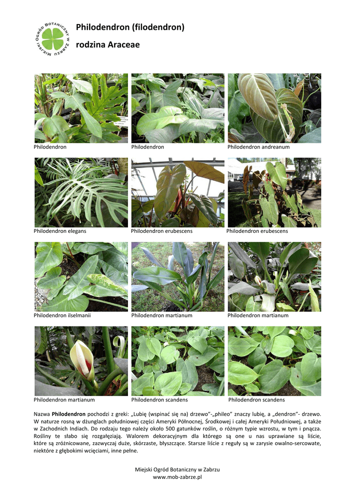 Philodendron (filodendron) rodzina Araceae Philodendron Philodendron Philodendron andreanum Philodendron elegans Philodendron erubescens Philodendron erubescens Philodendron ilselmanii Philodendron martianum Philodendron martianum Philodendron martianum Philodendron scandens Philodendron scandens Nazwa Philodendron pochodzi z greki: „Lubię (wspinać się na) drzewo”-„phileo” znaczy lubię, a „dendron”- drzewo. W naturze rosną w dżunglach południowej części Ameryki Północnej, Środkowej i całej Ameryki Południowej, a także w Zachodnich Indiach. Do rodzaju tego należy około 500 gatunków roślin, o różnym typie wzrostu, w tym i pnącza. Rośliny te słabo się rozgałęziają. Walorem dekoracyjnym dla którego są one u nas uprawiane są liście, które są zróżnicowane, zazwyczaj duże, skórzaste, błyszczące. Starsze liście z reguły są w zarysie owalno-sercowate, niektóre z głębokimi wcięciami, inne pełne. Miejski Ogród Botaniczny w Zabrzu www.mob-zabrze.pl Philodendron (filodendron) rodzina Araceae Gatunkami o liściach najbardziej zbliżonych do sercowatego są Philogendrony: scandens, andreanum, surinamense, domesticum czy też odmiany Ph. erubescens - ich liście są pełne, nie mają wcięć ani mocno pofalowanych brzegów. Filodendrony o głęboko wcinanych liściach to przede wszystkim Philodendrony: elegans, i bipinnatifidum. Nowe liście są wiotkie, jasnozielone, brązowawe lub różowawe, w zależności od gatunku. Twardnienie tkanki liścia trwa do dwóch miesięcy czasu. Im większy liść tym oczywiście proces rozprostowywania i twardnienia trwa dłużej. Łodyżka liściowa, jest z reguły sztywna, twarda, w przekroju owalna. Pod jej nasadą, na głównym pędzie wytwarzają się korzenie powietrzne, które są sztywne i łatwo łamliwe. U małych filodendronów są cienkie i łatwo przysychają w suchym klimacie. U dużych egzemplarzy są grube, nie zasychają zbyt szybko, ale po wrośnięciu w ziemię łatwiej gniją, gdy gleba jest zalana. Rozmiary, wysokość i szybkość przyrostu roślin zależy od odmiany i środowiska hodowli. Gdy jest cieplej, wilgotniej a rośliny są często nawożone, to rosną szybciej i są większe. Korzenie powietrzne (czepne) spełniają dużą rolę - owijają się wokół podpórek, pobierają wilgoć i składniki mineralne z podpory (np. wilgotnego mchu). Należy naginać je w stronę gleby i w żadnym wypadku nie należy ich obcinać, bowiem roślina przez taki zabieg spowalnia swój rozwój, a nawet choruje. Kwiaty rzadko pojawiają się w uprawie domowej. Okrywa kwiatu może być w różnych odcieniach purpury, różu, czerwieni lub zielonkawo - biała. Na centralnym słupku znajdują się małe kwiaty w kolorach: żółtym, kremowym lub białym. Rośliny te w naturalnym środowisku przebywają w najniższych partiach dżungli, dlatego większość gatunków wymaga stanowiska półcienistego jednak, jeśli rośliny mają za mało światła to wyciągają się i tworzą drobne, jaśniejsze liście. Światło powinno być jasne, rozproszone do umiarkowanego, należy je chronić przed bezpośrednim słońcem (cieniować). Gatunki należące do rodzaju filodendronów są roślinami ciepłolubnymi, temperatura powinna być w zakresie od średniej do wysokiej (od 14-27°C). Najmniej odporne na niższe temperatury są filodendrony, których liście pokryte są „meszkiem” (np. Ph. surinamense, andreanum i inne). Podobnie jak i wysoka wilgotność tak i wysoka temperatura jest korzystna dla całkowitego rozwoju tych roślin. Podłoże dla tych roślin powinno być średnio zasobne, lekkie, przepuszczalne najlepiej torfowe umożliwiające dobre korzenienie się rośliny. Ziemia powinna mieć odczyn kwaśny (pH 4,5-5,5). Ważny i niezbędny jest dobry, drenaż na dnie doniczki i dobrze jak doniczki są ażurowe, mają otwory nie tylko na dnie ale i po bokach. Wymagają sporo wody przez cały rok ale należy bardzo uważać gdyż w wyniku przelania rośliny niszczeją. Ich korzenie są wrażliwe na nadmiar wody w glebie i zbyt małą porowatość ziemi. Woda do podlewania musi być miękka. Wymagają również wilgotnego powietrza, można to zapewnić przez zraszanie liści wodą, która również powinna być miękka i odstała. W zimie nie zraszamy ich zbyt często, lepiej jest wtedy wycierać liście wilgotną gąbką. Powinno się zraszać także korzenie powietrzne. Nie spryskiwać roślin gdy temperatura w pomieszczeniu wynosi mniej niż 14°C . W okresie wegetacji stosujemy nawożenie. Do dokarmiania roślin wybieramy raczej nawozy z dużą zawartością azotu i potasu, oraz zwracamy uwagę na mikroelementy, których filodendrony wymagają. Mimo iż filodendrony nie przechodzą okresu spoczynku, zimą nie potrzebują nawożenia, dlatego nie nawozimy roślin od początku listopada do końca lutego. Dobrze reagują na nawozy organiczne, rośliny nawożone w ten sposób mają piękną zieleń liści, a ich przyrost jest bardzo szybki. Rozmnażanie tych roślin jest dosyć łatwe i można to robić na kilka sposobów. Rozmnażamy je z początkiem wiosny i w lecie, kiedy rozpoczyna się sezon wzmożonego wzrostu. Najszybszym sposobem jest rozmnażanie przez sadzonki wierzchołkowe (do tego typu rozmnażania nie nadają się bardzo młode sadzonki wierzchołkowe, z jednym młodym liściem i małymi, wiotkimi korzonkami, gdyż najczęściej gniją). Następny sposób to odkłady powietrzne – stosujemy je dla gatunków drzewiastych. Można również rozmnażać filodendrony przez wysiew nasion – muszą to być świeże nasiona. Kolejny sposób to podział roślin, (gdy więcej sztuk posadzono w jednej donicy). Filodendrony przesadzamy od marca do października, robimy to wtedy gdy korzenie zaczną przerastać doniczkę, także jest to niezbędne roślina zostanie zalana, wtedy należy przesadzać natychmiast do świeżej ziemi, bez względu na porę roku. Filodendrony rosną najlepiej gdy mają cia
