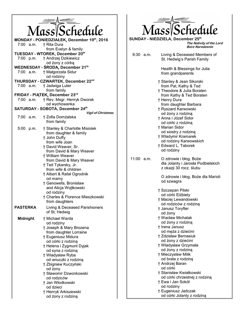 MONDAY - PONIEDZIAŁEK, December 19th, 2016 7:00 a.m. † Rita Dura from Evelyn & family TUESDAY - WTOREK, December 20th 7:00 p.m. † Andrzej Dzikiewicz od żony z córką WEDNESDAY - ŚRODA, December 21th 7:00 a.m. † Małgorzata Sidur od rodziny THURSDAY - CZWARTEK, December 22nd 7:00 a.m. † Jadwiga Luter from family FRIDAY - PIĄTEK, December 23rd 7:00 a.m. † Rev. Msgr. Henryk Dworak od wychowanka SATURDAY - SOBOTA, December 24th SUNDAY - NIEDZIELA, December 25th The Nativity of the Lord Boże Narodzenie 9:30 a.m. Health & Blessings for Julia from grandparents † Stanley & Jean Sikorski from Pat, Kathy & Ted † Theodore & Julia Boraten from Kathy & Ted Boraten † Henry Dura from daughter Barbara † Ryszard Karwowski od żony z rodziną † Anna i Józef Sidor od córki z rodziną † Marian Sidor od siostry z rodziną † Władymir Kramarek od rodziny Karwowskich † Edward L. Taborek od rodziny Vigil of Christmas 7:00 a.m. † Zofia Domżalska from family 5:00 p.m. † Stanley & Charlotte Misiolek from daughter & family † John Duffy from wife Joan † David Weaver, Sr. from David & Mary Weaver † William Weaver from David & Mary Weaver † Ted Tykarsky, Jr. from wife & children † Albert & Rafał Ogrodnik od mamy † Genowefa, Bronisław and Alicja Wojtkowski od rodziny † Charles & Florence Mieszkowski from daughters PASTERKA Midnight Living & Deceased Parishioners of St. Hedwig † Michael Warda od rodziny † Joseph & Mary Brozena from daughter Lorraine † Eugeniusz Midura od córki z rodziną † Helena i Zygmunt Dyjak od syna z rodziną † Władysław Ryba od wnuczki z rodziną † Zbigniew Kuczyński od żony † Sławomir Dzwonkowski od rodziców † Jan Włodkowski od dzieci † Henryk Arkiszewski od żony z rodziną Living & Deceased Members of St. Hedwig’s Parish Family 11:00 a.m. O zdrowie i błog. Boże dla Jolanty i Jarosła Podbielskich z okazji 30 rocz. ślubu O zdrowie i błog. Boże dla Marioli od szwagra † Szczepan Pilski od córki Elżbiety † Maciej Lewandowski od rodziców z rodziną † Janusz Toryfter od żony † Wacław Michalak od żony z rodziną † Irena Janusz od męża z dziećmi † Zdzisław Bernasiuk od żony z dziećmi † Władysław Grzymała od żony z rodziną † Mieczysław Milik od brata z rodziną † Andrzej Baran od córki † Stanisław Kwiatkowski od córki chrzestnej z rodziną † Ewa i Jan Sokół od rodziny † Eugeniusz Jadczak od córki Jolanty z rodziną IV NIEDZIELA ADWENTU – Mt 1,18-24: Z narodzeniem Jezusa Chrystusa było tak. Po zaślubinach Matki Jego, Maryi, z Józefem, wpierw nim zamieszkali razem, znalazła się brzemienną za sprawą Ducha Świętego. Mąż Jej, Józef, który był człowiekiem sprawiedliwym i nie chciał narazić Jej na zniesławienie, zamierzał oddalić Ją potajemnie. Gdy powziął tę myśl, oto anioł Pański ukazał mu się we śnie i rzekł: Józefie, synu Dawida, nie bój się wziąć do siebie Maryi, twej Małżonki; albowiem z Ducha Świętego jest to, co się w Niej poczęło. Porodzi Syna, któremu nadasz imię Jezus, On bowiem zbawi swój lud od jego grzechów . A stało się to wszystko, aby się wypełniło słowo Pańskie powiedziane przez Proroka: Oto Dziewica pocznie i porodzi Syna, któremu nadadzą imię Emmanuel, to znaczy: Bóg z nami. Zbudziwszy się ze snu, Józef uczynił tak, jak mu polecił anioł Pański: wziął swoją Małżonkę do siebie. Cała liturgia ostatniej niedzieli Adwentu opiewa narodzenie Zbawiciela. Na pierwszym planie stoi słynne proroctwo o Emanuelu, wygłoszone w chwili szczególnie trudnej dla królestwa Judy. Bezbożnemu królowi Achazowi, który nie chce uwierzyć, że Bóg może go wybawić z ciężkiej sytuacji, Izajasz odpowiada, karcąc go surowo, i aby mu udowodnić, że Bóg może uczynić rzeczy o wiele większe, dodaje: „Pan sam da wam znak: Oto Panna pocznie i porodzi Syna i nazwie Go imieniem Emanuel” (Iz 7, 14). Gdyby nawet proroctwo odnosiło się do urodzin następcy tronu, w pełni miało się urzeczywistnić dopiero siedem wieków później przez cudowne narodzenie Jezusa. On jedynie wypełnia całe znaczenie proroctwa. Ewangelia św. Mateusza potwierdza to tłumaczenie. Ewangelista, kończąc swoje opowiadanie o dziewiczym poczęciu Jezusa, mówi: „Stało się to wszystko, aby się wypełniło słowo Pańskie powiedziane przez Proroka: «Oto Dziewica pocznie i porodzi Syna, któremu nadadzą imię Emanuel», to znaczy Bóg z nami” (1, 22–23). Św. Mateusz pisząc genealogię Jezusa wykazuje, że On jest prawdziwym człowiekiem, „Synem Dawida, synem Abrahama” (w. 1); opisując Jego narodzenie z Maryi Dziewicy, która stalą się Matką „za sprawą Ducha Świętego” (w. 18), twierdzi, że jest prawdziwym Bogiem; na końcu zaś przytaczając proroctwo Izajasza oświadcza, że jest Zbawicielem obiecanym przez proroków, Emanuelem, „Bogiem z nami”. W tym obrazie, tak istotnym, Mateusz odsłania jedną z najbardziej ludzkich i delikatnych okoliczności narodzenia Jezusa: wątpliwości Józefa oraz jego zachowanie się w przyjęciu zadania, jakie mu Bóg powierzył. Wobec tajemniczego macierzyństwa Maryi Józef waha się mocno i zamierza Ją opuścić w tajemnicy. Lecz kiedy anioł Pański upewnia go i poleca wziąć Ją do siebie, „albowiem z Ducha Świętego jest to, co sio. w Niej poczęło” (w. 20), Józef — człowiek sprawiedliwy, żyjący z wiary — jest posłuszny i przyjmuje z pokorną prostotą obowiązek niesłychanie ważny — oblubieńca Dziewicy–Matki i dziewiczego ojca Syna Bożego. Oto tak rozpoczęło się życie Zbawiciela związane z wiarą, posłuszeństwem, pokorą, oddaniem cieśli z Nazaretu. To są cnoty, z jakimi należy przyjąć Pana, który ma przyjść. W drugim czytaniu św. Paweł staje na równi z prorokami i z Mateuszem, głosząc Jezusa „pochodzącego według ciała z rodu Dawida” (Rz 1, 4), a z Mateuszem oświadcza, że On jest „Synem Bożym” (w. 1)