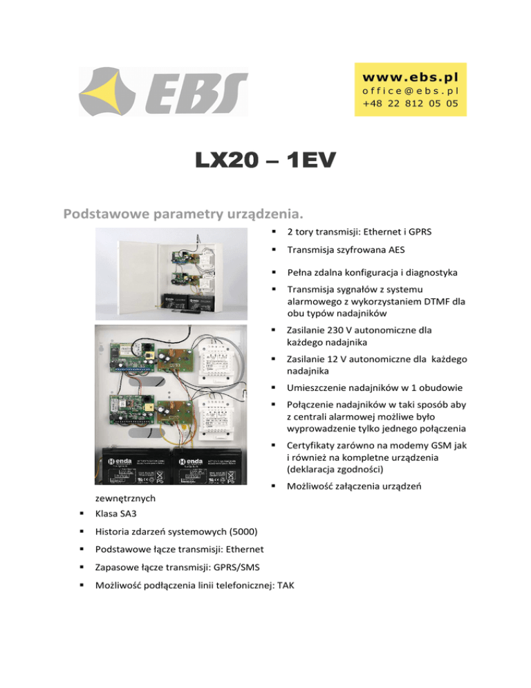LX20 – 1EV Podstawowe parametry urządzenia. 2 tory transmisji: Ethernet i GPRS Transmisja szyfrowana AES Pełna zdalna konfiguracja i diagnostyka Transmisja sygnałów z systemu alarmowego z wykorzystaniem DTMF dla obu typów nadajników Zasilanie 230 V autonomiczne dla każdego nadajnika Zasilanie 12 V autonomiczne dla każdego nadajnika Umieszczenie nadajników w 1 obudowie Połączenie nadajników w taki sposób aby z centrali alarmowej możliwe było wyprowadzenie tylko jednego połączenia Certyfikaty zarówno na modemy GSM jak i również na kompletne urządzenia (deklaracja zgodności) Możliwość załączenia urządzeń zewnętrznych Klasa SA3 Historia zdarzeń systemowych (5000) Podstawowe łącze transmisji: Ethernet Zapasowe łącze transmisji: GPRS/SMS Możliwość podłączenia linii telefonicznej: TAK Parametry transmitera GPRS. Kanały transmisji GPRS, SMS Wejścia 4 (NO/NC) + 1 SAB (NO/NC) Wejście telefoniczne w standardzie DTMF TAK Wyjścia 2 (OC, obciążalność max. 100mA) Funkcje wyjść (sposoby sterowania) - brak sygnału GSM - z poziomu serwera lub poprzez SMS - przychodzący CLIP - w reakcji na aktywację wybranych wejść RS232 / RS485 (linie: RxD, TxD, RTS, CTS) szybkość transmisji do 115200bps Interfejs szeregowy Ilość zdarzeń systemowych przechowywana w historii 5000 Zabezpieczenie transmisji GPRS/SMS do serwera szyfrowanie AES Interfejs użytkownika 4 diody LED (sygnalizacja poziomu sygnału, stan urządzenia, komunikacja DTMF) Konfiguracja Zdalna: GPRS, SMS, CSD Lokalna: z PC poprzez łącze RS232 (wymagany przewód: LX-PROG) Zdalna aktualizacja firmware TAK Obsługiwane modemy - Siemens MC55, MC55i, MC56 - Wavecom Q55 - Simcom SIM300C, SIM340C Parametry zasilania Napięcie zasilające 230VAC (dopuszczalne: 190-250VAC) Pobór mocy (średni / maksymalny) 3W/20W@230VAC Funkcje układu zasilającego Możliwość podłączenia akumulatora - tryb szybkiego ładowania akumulatora - zabezpieczenie przed nadmiernym rozładowaniem akumulatora - zabezpieczenie przed odwrotnym podłączeniem akumulatora - sygnalizacja zaniku zasilania sieciowego - sygnalizacja braku/niskiego stanu naładowania akumulatora - zabezpieczenie przed zwarciem wyjścia akumulatorowego - bezobsługowy bezpiecznik TAK , kwasowo-ołowiowy 12V Prąd ładowania akumulatora max. 200mA lub max. 1A Próg sygnalizowania zbyt niskiego zasilania sieciowego (za transformatorem / przed transformatorem) Próg sygnalizowania zbyt niskiego napięcia akumulatora 13.5VAC / 160VAC Napięcie odłączenia akumulatora (zabezpieczenie przed nadmiernym rozładowaniem) 11VDC 9,5VDC Parametry transmitera Ethernet. Kanały transmisji ETHERNET (IEE 802.3; 10Mbps; DHCP/Statyczne IP; LAN/WAN) Wejścia 4 (NO/NC) + 1 SAB (NO/NC) Wejście telefoniczne w standardzie DTMF TAK Wyjścia 2 (OC, obciążalność max. 100mA) Funkcje wyjść (sposoby sterowania) - brak połączenia TCP/IP - w reakcji na aktywację wybranych wejść Interfejs szeregowy RS232 / RS485 (linie: RxD, TxD, RTS, CTS) szybkość transmisji do 115200bps Ilość zdarzeń systemowych przechowywana w historii 5000 Zabezpieczenie transmisji GPRS/SMS do serwera szyfrowanie AES Interfejs użytkownika 4 diody LED (status połączenia, stan urządzenia, komunikacja DTMF) Konfiguracja Zdalna: ethernet Lokalna: z PC poprzez łącze RS232 (wymagany przewód: LX-PROG) Zdalna aktualizacja firmware TAK Parametry zasilania Napięcie zasilające 230VAC (dopuszczalne: 190-250VAC) Pobór mocy (średni / maksymalny) 3W/20W@230VAC Funkcje układu zasilającego Możliwość podłączenia akumulatora - tryb szybkiego ładowania akumulatora - zabezpieczenie przed nadmiernym rozładowaniem akumulatora - zabezpieczenie przed odwrotnym podłączeniem akumulatora - sygnalizacja zaniku zasilania sieciowego - sygnalizacja braku/niskiego stanu naładowania akumulatora - zabezpieczenie przed zwarciem wyjścia akumulatorowego - bezobsługowy bezpiecznik TAK, kwasowo-ołowiowy 12V Prąd ładowania akumulatora max. 200mA lub max. 1A Próg sygnalizowania zbyt niskiego zasilania sieciowego (za transformatorem / przed transformatorem) Próg sygnalizowania zbyt niskiego napięcia akumulatora 13.5VAC / 160VAC Napięcie odłączenia akumulatora (zabezpieczenie przed nadmiernym rozładowaniem) 11VDC 9,5VDC