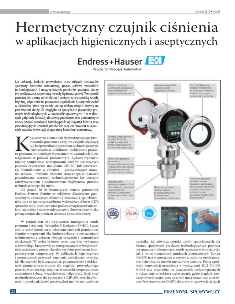 Artykuł promocyjny czerwiec 2010 l tom 64 Hermetyczny czujnik ciśnienia w aplikacjach higienicznych i aseptycznych Jak pokazują badania prowadzone przez różnych dostawców aparatury kontrolno-pomiarowej, ponad połowa wszystkich technologicznych i magazynowych pomiarów poziomu cieczy jest realizowana za pomocą metody hydrostatycznej. Ten sposób pomiaru jest znany od wielu lat i ceniony za zrozumiałą zasadę fizyczną, odporność na parowanie, zapienienie i pracę mieszadeł w zbiorniku, która wywołuje szereg niekorzystnych zjawisk na powierzchni cieczy. Ze względu na specyficzne parametry procesów technologicznych w przemyśle spożywczym i w wybranych gałęziach farmacji, dostawcy przetworników pomiarowych muszą szukać rozwiązań spełniających wymagania klienta oraz gwarantujących pewność pomiarów przy zachowaniu racjonalnych kosztów inwestycji w aparaturę kontrolno-pomiarową. K rytycznym elementem hydrostatycznego przetwornika poziomu cieczy jest czujnik, stykający się bezpośrednio z procesem technologicznym. Powtarzalność, stabilność i dokładność pomiaru poziomu jest trudnym wyzwaniem w warunkach dużej wilgotności w punkcie pomiarowym, będącej wynikiem różnicy temperatur, występowania szoków termicznych podczas czyszczenia metodami CIP/SIP lub pasteryzacji. Nieuniknione są również – przyspieszające starzenie sensora – wahania ciśnienia statycznego w instalacji powodowane szarżami technologicznymi lub częstym zatrzymywaniem i podnoszeniem fragmentów procesu technologicznego do ruchu. Od ponad 10 lat hermetyczny czujnik pomiarowy Endress+Hauser Contite ze szklanym dławieniem gazoszczelnym, chroniącym element pomiarowy i jego elektronikę oraz ze spawaną membraną wykonaną z Alloy’u C276 sprawdza się w produkcji oraz podczas magazynowania soków i napojów, a także w mleczarstwie i browarnictwie jako pewny czujnik do pomiaru ciśnienia i poziomu cieczy. W czujnik ten jest wyposażona inteligentna sonda poziomu i ciśnienia Deltapilot S Evolution FMB70. Łączy ona w sobie kombinację udoskonalonej celi pomiarowej Contite z typowymi dla Endress+Hauser rozwiązaniami technicznymi z zakresu obsługi urządzeń i komunikacji obiektowej. W pełni cyfrowe serce czujnika wykonano w technologii krzemowej ze zintegrowanym w bezpośrednim sąsiedztwie procesu bardzo szybkim pomiarem kompensacyjnym temperatury. W aplikacjach higienicznych i aseptycznych przyrząd zapewnia zaskakująco wysoką, jak dla metody hydrostatycznej, powtarzalność i dokładność pomiaru oraz istotne dla ciągłości prowadzonego procesu wytwórczego odporność na szoki temperaturowe, ciśnieniowe i dużą, wszechobecną wilgotność. Brak stref trudnodostępnych do czyszczenia CIP/SIP, sterylizowalność i wysoka gładkość powierzchni membrany czołowej 22 czujnika, jak również szeroki wybór specyficznych dla branży spożywczej przyłączy technologicznych pozwala na sprawną implementację sondy zarówno w istniejących, jak i nowo tworzonych punktach pomiarowych. Sonda FMB70 jest wyposażona w sztywną, odporną mechanicznie i chemicznie membranę czołową sensora. Pełna zgodność konstrukcji urządzenia z wytycznymi SIL2 PN-EN 61508 jest niezbędna na instalacjach technologicznych o relatywnie wysokim ryzyku awarii, gdzie ciągłość procesu wytwórczego i aseptyczność mają zasadnicze znaczenie. Przystosowanie FMB70 do pracy w typowych sieciach PRZEMYSŁ SPOZYWCZY tom 64 l czerwiec 2010 Artykuł promocyjny su nawet, gdy rejestracja danych w systemie nadrzędnym zawiodła. Pozwala ona również na ograniczenie kosztów uruchomienia kilku przetworników o podobnych nastawach – wystarczy skopiować nastawy jednego i przenieść je w pamięci HistoROM do pozostałych przetworników. Zharmonizowana konstrukcja przetwornika, od czujnika pomiarowego przez przyłącze technologiczne na korpusie obudowy przetwornika kończąc, została dokładnie przemyślana pod kątem bezpieczeństwa procesu. Sonda hydrostatyczna Deltapilot S Evolution FMB70 jest wyposażona w dwukomorową, szczelną obudowę ze stali kwa- błąd [w % zakresu] zestawienie błędów i limitów podczas testu laboratoryjnego 0,40 0,20 0,00 - 0,20 - 0,40 0 20 40 60 80 100 120 140 liczba próbek weryfikacyjnych sensor CONTITE 1200mbar — górne limity błędów — dolne limity błędów 100 1000 80 500 60 0 40 - 500 20 -1000 0 -1500 0 20 40 60 80 100 120 temperatura [°C] ciśnienie[mbar wzgl] profil testowy temperatury i ciśnienia 1500 - 20 140 liczba próbek weryfikacyjnych ciśnienie — temperatura Badanie odporności czujnika Contite na szoki termiczne i ciśnieniowe komunikacji obiektowej HART, PROFIBUS PA i FOUNDATION Fieldbus z pewnością znajdzie uznanie w nowych i modernizowanych obiektach przemysłowych. Nieulotna pamięć wewnętrzna przetwornika daje możliwość wglądu w parametry procesu technologicznego z ostatniego okreSondy Deltapilot S w pomiarach poziomu w tankach magazynowych syropów przeciwkaszlowych Hermetyczny czujnik Contite soodpornej, z wygrawerowaną laserowo tabliczką znamionową. Duży wyświetlacz lokalny, tworzywowy (nie tłukący się) wziernik i osłonięty panel przycisków lokalnych gwarantują najwyższą funkcjonalność, która jest standardem w przyrządach pomiarowych Endress+Hauser. Graficzny wyświetlacz z trzema przyciskami pozwala na pełną obsługę lokalną przyrządu – nawet strefach zagrożenia wybuchem – bez dodatkowych kosztów związanych z zakupem programatora ręcznego lub oprogramowania diagnostycznego. Przyjazne menu użytkownika z funkcją szybkiego uruchomienia przetwornika, z łatwym wyborem i ustawieniem aplikacji pomiarowej (poziom, ciśnienie), z wszelkimi komunikatami pomocy i ostrzeżeń otwartym tekstem (bez kodowanych komunikatów) oraz z alternatywnym wyświetlaniem wartości mierzonej i temperatury uzupełniają pakiet cech przyrządu, przydatnych użytkownikowi w jego codziennej eksploatacji. Endress+H