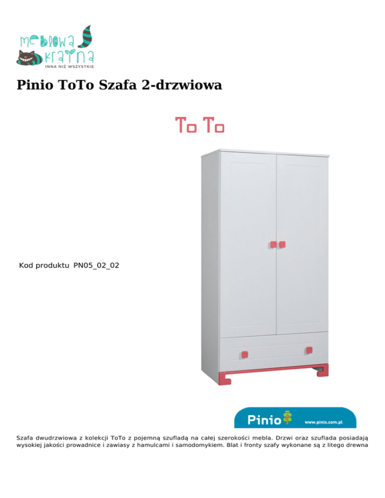 Pinio ToTo Szafa 2-drzwiowa Kod produktu PN05_02_02 Szafa dwudrzwiowa z kolekcji ToTo z pojemną szufladą na całej szerokości mebla. Drzwi oraz szuflada posiadają wysokiej jakości prowadnice i zawiasy z hamulcami i samodomykiem. Blat i fronty szafy wykonane są z litego drewna sosnowego pochodzącego z polskich lasów. Boki oraz elementy wewnętrzne z płyty laminowanej. Elementy wykończeniowe - uchwyty i nóżki - występują w kolorze turkusowym i różowym. Wewnątrz znajdują się dwie półki oraz drążek na ubrania. Czas oczekiwania: 4-6 tygodni. Wymiary: 99 cm x 53,3 cm x 184 cm (długość x szerokość x wysokość) Konstrukcja: front i blat-lite drewno sosnowe, boki i elementy wewnętrzne - płyta laminowana. Kolorystyka: biały+turkusowy, biały+różowy. Gwarancja: 24 miesiące. Mebel do samodzielnego montażu.