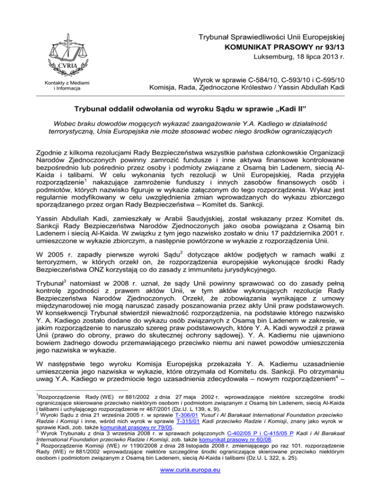 Trybunał Sprawiedliwości Unii Europejskiej KOMUNIKAT PRASOWY nr 93/13 Luksemburg, 18 lipca 2013 r. Kontakty z Mediami i Informacja Wyrok w sprawie C-584/10, C-593/10 i C-595/10 Komisja, Rada, Zjednoczone Królestwo / Yassin Abdullah Kadi Trybunał oddalił odwołania od wyroku Sądu w sprawie „Kadi II” Wobec braku dowodów mogących wykazać zaangażowanie Y.A. Kadiego w działalność terrorystyczną, Unia Europejska nie może stosować wobec niego środków ograniczających Zgodnie z kilkoma rezolucjami Rady Bezpieczeństwa wszystkie państwa członkowskie Organizacji Narodów Zjednoczonych powinny zamrozić fundusze i inne aktywa finansowe kontrolowane bezpośrednio lub pośrednio przez osoby i podmioty związane z Osamą bin Ladenem, siecią AlKaida i talibami. W celu wykonania tych rezolucji w Unii Europejskiej, Rada przyjęła rozporządzenie1 nakazujące zamrożenie funduszy i innych zasobów finansowych osób i podmiotów, których nazwisko figuruje w wykazie załączonym do tego rozporządzenia. Wykaz jest regularnie modyfikowany w celu uwzględnienia zmian wprowadzanych do wykazu zbiorczego sporządzanego przez organ Rady Bezpieczeństwa – Komitet ds. Sankcji. Yassin Abdullah Kadi, zamieszkały w Arabii Saudyjskiej, został wskazany przez Komitet ds. Sankcji Rady Bezpieczeństwa Narodów Zjednoczonych jako osoba powiązana z Osamą bin Ladenem i siecią Al-Kaida. W związku z tym jego nazwisko zostało w dniu 17 października 2001 r. umieszczone w wykazie zbiorczym, a następnie powtórzone w wykazie z rozporządzenia Unii. W 2005 r. zapadły pierwsze wyroki Sądu2 dotyczące aktów podjętych w ramach walki z terroryzmem, w których orzekł on, że rozporządzenia europejskie wykonujące środki Rady Bezpieczeństwa ONZ korzystają co do zasady z immunitetu jurysdykcyjnego. Trybunał3 natomiast w 2008 r. uznał, że sądy Unii powinny sprawować co do zasady pełną kontrolę zgodności z prawem aktów Unii, w tym aktów wykonujących rezolucje Rady Bezpieczeństwa Narodów Zjednoczonych. Orzekł, że zobowiązania wynikające z umowy międzynarodowej nie mogą naruszać zasady poszanowania przez akty Unii praw podstawowych. W konsekwencji Trybunał stwierdził nieważność rozporządzenia, na podstawie którego nazwisko Y. A. Kadiego zostało dodane do wykazu osób związanych z Osamą bin Ladenem w zakresie, w jakim rozporządzenie to naruszało szereg praw podstawowych, które Y. A. Kadi wywodził z prawa Unii (prawo do obrony, prawo do skutecznej ochrony sądowej). Y. A. Kadiemu nie ujawniono bowiem żadnego dowodu przemawiającego przeciwko niemu ani nawet powodów umieszczenia jego nazwiska w wykazie. W następstwie tego wyroku Komisja Europejska przekazała Y. A. Kadiemu uzasadnienie umieszczenia jego nazwiska w wykazie, które otrzymała od Komitetu ds. Sankcji. Po otrzymaniu uwag Y.A. Kadiego w przedmiocie tego uzasadnienia zdecydowała – nowym rozporządzeniem4 – 1 Rozporządzenie Rady (WE) nr 881/2002 z dnia 27 maja 2002 r. wprowadzające niektóre szczególne środki ograniczające skierowane przeciwko niektórym osobom i podmiotom związanym z Osamą bin Ladenem, siecią Al-Kaida i talibami i uchylającego rozporządzenie nr 467/2001 (Dz.U. L 139, s. 9). 2 Wyroki Sądu z dnia 21 września 2005 r. w sprawie T-306/01 Yusuf i Al Barakaat International Foundation przeciwko Radzie i Komisji i inne, wśród nich wyrok w sprawie T-315/01 Kadi przeciwko Radzie i Komisji, znany jako wyrok w sprawie Kadi, zob. także komunikat prasowy nr 79/05. 3 Wyrok Trybunału z dnia 3 września 2008 r. w sprawach połączonych C-402/05 P i C-415/05 P Kadi i Al Barakaat International Foundation przeciwko Radzie i Komisji, zob. także komunikat prasowy nr 60/08. 4 Rozporządzenie Komisji (WE) nr 1190/2008 z dnia 28 listopada 2008 r. zmieniającego po raz 101. rozporządzenie Rady (WE) nr 881/2002 wprowadzające niektóre szczególne środki ograniczające skierowane przeciwko niektórym osobom i podmiotom związanym z Osamą bin Ladenem, siecią Al-Kaida i talibami (Dz.U. L 322, s. 25). www.curia.europa.eu o pozostawieniu jego nazwiska w wykazie Unii dotyczącym osób objętych środkami ograniczającymi. Interpretując wyrok Trybunału w sprawie Kadi, Sąd stwierdził nieważność5 nowego rozporządzenia Komisji. Sąd uznał, że ciążył na nim obowiązek zapewnienia pełnej i rygorystycznej kontroli zgodności z prawem tego aktu, obejmującej też informacje i dowody nierozdzielnie związane z powodami leżącymi u jego podstaw. Z uwagi na to, że informacje te i dowody nie zostały przekazane, a wskazówki zawarte w uzasadnieniu przekazanym przez Komitet ds. Sankcji były, ogólnie rzecz biorąc, zbyt niejasne, Sąd orzekł, że doszło do naruszenia prawa do obrony Y. A. Kadiego, jak również jego prawa do skutecznej ochrony sądowej. Komisja, Rada i Zjednoczone Królestwo zaskarżyły ten wyrok w drodze rozpatrywanych obecnie odwołań. W ogłoszonym dzisiaj wyroku Trybunał wskazał przede wszystkim, że w ramach postępowania zmierzającego do umieszczenia lub pozostawienia nazwiska osoby w wykazie osób podejrzewanych o związki z terroryzmem, właściwy organ Unii powinien poinformować zainteresowanego o materiałach leżących u podstaw takiej decyzji. I tak zainteresowany powinien otrzymać przynajmniej uzasadnienie przedstawione przez Komitet ds. Sankcji w celu wskazania przyczyn decyzji o zastosowaniu wobec niego środków ograniczających. Ponadto organ ten powinien umożliwić zainteresowanej osobie odpowiednie przedstawienie jej stanowiska w odniesieniu do wysuniętych przeciw niej powodów oraz powinien zbadać, w świetle uwag zainteresowanego, zasadność tego uzasadnienia. W tym kontekście na organie tym ciąży obowiązek zwrócenia się o współdziałanie do Komitetu ds. Sankcji, a za jego pośrednictwem do członka ONZ, który zaproponował umieszczenie zainteresowanej osoby w wykazie zbiorczym wspomnianego komitetu, w celu uzyskania informacji i