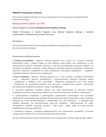 INNOLOT Innowacyjne Lotnictwo Finansowanie badań naukowych oraz prac rozwojowych nad innowacyjnymi rozwiązaniami dla przemysłu lotniczego Planowany termin 2 naboru: I kw. 2014 Miejsce składania wniosków: Narodowe Centrum Badań i Rozwoju Projekt finansowany w ramach Programu musi dotyczyć wyłącznie jednego z tematów wymienionych w Zakresie merytorycznym konkursu. Beneficjenci Konsorcja naukowe, których liderami będą przedsiębiorcy odpowiedzialni za uzyskanie demonstratorów technologii. Przeznaczenie dofinansowania: 1) Badania przemysłowe – zgodnie z definicją zawartą w art. 2 pkt 3 lit. c ustawy o zasadach finansowania nauki – badania mające na celu zdobycie nowej wiedzy oraz umiejętności w celu opracowywania nowych produktów, procesów i usług lub wprowadzania znaczących ulepszeń do istniejących produktów, procesów i usług; badania te obejmują tworzenie elementów składowych systemów złożonych, szczególnie do oceny przydatności technologii rodzajowych, z wyjątkiem prototypów objętych zakresem prac rozwojowych. 2) Prace rozwojowe – zgodnie z definicją zawartą w art. 2 pkt 4 ustawy o zasadach finansowania nauki – nabywanie, łączenie, kształtowanie i wykorzystywanie dostępnej aktualnie wiedzy i umiejętności z dziedziny nauki, technologii i działalności gospodarczej oraz innej wiedzy i umiejętności do planowania produkcji oraz tworzenia i projektowania nowych, zmienionych lub ulepszonych produktów, procesów i usług, w szczególności: a. tworzenie projektów, rysunków, planów oraz innej dokumentacji do tworzenia nowych produktów, procesów i usług, pod warunkiem że nie są one przeznaczone do celów komercyjnych, b. opracowywanie prototypów o potencjalnym wykorzystaniu komercyjnym oraz projektów pilotażowych, w przypadkach gdy prototyp stanowi końcowy produkt komercyjny, a jego produkcja wyłącznie do celów demonstracyjnych i walidacyjnych jest zbyt kosztowna; w przypadku gdy projekty pilotażowe lub demonstracyjne mają być następnie wykorzystywane do celów komercyjnych, wszelkie przychody uzyskane z tego tytułu należy odjąć od kwoty kosztów kwalifikowanych pomocy publicznej, c. działalność związana z produkcją eksperymentalną oraz testowaniem produktów, i usług, pod warunkiem że nie są one wykorzystywane komercyjnie. procesów Nie jest możliwe łączenie badań przemysłowych i prac rozwojowych w ramach tego samego zadania. Poziom dofinansowania - Minimalna i maksymalna wartość dofinansowania w Grupie A: od 10 mln PLN do 50 mln PLN, przy czym całkowita wartość dofinansowania realizacji Projektu przez Centrum, stanowi nie więcej niż 60% kosztów kwalifikowanych, w Grupie B: od 1 mln PLN do 7.5 mln PLN, przy czym całkowita wartość dofinansowania realizacji Projektu przez Centrum, stanowi nie więcej niż 60% kosztów kwalifikowanych - Intensywność dofinansowania W przypadku jednostki naukowej – do 100% W przypadku przedsiębiorcy – Podstawowa intensywność pomocy publicznej brutto w przypadku badań przemysłowych nie może przekraczać 50% kosztów kwalifikowanych Podstawowa intensywność pomocy publicznej brutto w przypadku prac rozwojowych nie może przekraczać 25 % kosztów kwalifikowanych Maksymalna intensywność pomocy publicznej brutto dla badań przemysłowych: 80 % kosztów kwalifikowanych dla mikro- lub małych przedsiębiorców, 75 % kosztów kwalifikowanych dla średnich przedsiębiorców, 65 % kosztów kwalifikowanych dla dużych przedsiębiorców. Maksymalna intensywność pomocy publicznej brutto dla prac rozwojowych: 60 % kosztów kwalifikowanych dla mikro- lub małych przedsiębiorców, 50 % kosztów kwalifikowanych dla średnich przedsiębiorców, 40 % kosztów kwalifikowanych dla dużych przedsiębiorców. Koszty kwalifikowane - Wynagrodzenia osób zatrudnionych w projekcie wraz z pozapłacowymi kosztami pracy, w tym składkami na ubezpieczenia społeczne i zdrowotne, osób zatrudnionych przy prowadzeniu badań przemysłowych lub prac rozwojowych (pracowników badawczych, pracowników technicznych, pozostałych pracowników pomocniczych i kierownika projektu), w części, w jakiej wynagrodzenia te są bezpośrednio związane z realizacją projektu objętego dofinansowaniem. - Koszty aparatury naukowo-badawczej i in. urządzeń służących celom badawczym Zakup w uzasadnionych przypadkach finansowany w 100% Amortyzacja Odpłatne korzystanie z aparatury naukowo-badawczej i in. urządzeń - Koszty budynków i gruntów kwalifikowane są w zakresie i przez okres niezbędny do realizacji projektu - Koszty usług badawczych, wiedzy technicznej oraz usług doradczych i równorzędnych zakupione od osób trzecich - Inne koszty operacyjne materiały - środki nietrwałe niezbędne do realizacji projektu np. surowce, półprodukty, odczynniki, sprzęt laboratoryjny (co do zasady wszystkie zakupy nie spełniające wymogu środka trwałego zgodnie z ustawą o rachunkowości oraz z przyjęta polityką rachunkowości), elementy służące do budowy i na stałe zainstalowane w prototypie, instalacji pilotażowej lub demonstracyjnej usługi obce – usługi serwisowe, koszty napraw, usługi transportowe koszty uczestnictwa w konferencjach koszty szkoleń pracowników realizujących zadania badawcze (koszt szkoleń powinien być zaplanowany we wniosku na wykonanie projektu oraz wynikać z uzasadnionych przesłanek (np. pojawienie się na rynku nowych, innowacyjnych rozwiązań - nowe materiały, nowe technologie, nowe techniki wykonania określonego zadania itp. - dzięki którym zadanie można będzie wykonać bardziej efektywnie, nadać mu nowe dodatkowe cechy ) koszty szkoleń związanych z obsługą zakupionej aparatury naukowo-badawczej koszty prowadzenia wyodrębnionego rachunku bankowego (prowizje i inne opłaty) koszty promocji projektu (publikacje, koszt strony internetowej itp.) koszt audytu zewnętrznego, jeżeli rozpoczął się on po zrealizowaniu 50% planowych wydat
