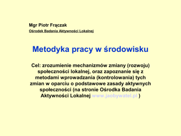 Mgr Piotr Frączak Ośrodek Badania Aktywności Lokalnej Metodyka pracy w środowisku Cel: zrozumienie mechanizmów zmiany (rozwoju) społeczności lokalnej, oraz zapoznanie się z metodami wprowadzania (kontrolowania) tych zmian w oparciu o podstawowe zasady aktywnych społeczności (na stronie Ośrodka Badania Aktywności Lokalnej www.jaobywatel.pl ) Organizacje pozarządowe – Przypomnienie głównych pojęć – Kwestie definicyjne – Jak założyć organizacje pozarzadową – Istota zmiany – Inicjatorzy i realizatorzy zmiany PRZYKŁADY DZIAŁAŃ – Wsparcie liderów – Centra wspomagania – Poradnictwo obywatelskie – Lokalne organizacje grantodawcze – Mapa środków Organizacje pozarządowe Kwestie definicyjne Podstawowe pojęcia - podstawowe wartości • Pomocniczość • Dialog społeczny (obywatelski) • Rozwój zrównoważony • Spójność społeczna Z jednej strony chodzi o cele, z drugiej o sposoby działania Organizacje pozarządowe „specyficzne, współczesne formy samoorganizacji społecznej, struktury integrujące grupy obywateli, charakteryzujące się •względnie dojrzałą tożsamością społeczną, •określonym stopniem zorganizowania, •prywatnym charakterem inicjatywy, •dobrowolnościa uczestnictwa, •niezależnościa i •niekomercyjnością, •a także na ogół - znacznym udziałem wolontariatu i • istotną rolą w kształtowaniu postaw ludzkich” prof. Piotr Gliński Organizacje pozarządowe O czym mówimy? Na przykładzie Wielkiej Brytanii! •„Zatrudnienie w brytyjskim sektorze organizacji wolontarystycznych znacznie wzrosło (6,3% ogólnej liczby zatrudnionych - przyp. PF) w drugiej połowie lat dziewięćdziesiątych, a tempo tego wzrostu było wyższe niż w innych sektorach” •„Według szacunków z 1995 r. wartość dóbr wytworzonych w sektorze non-profit wynosiła 47,5 mld funtów, co stanowiło około 6,6% PKB. (Szacunek ten nie uwzgledniał pracy wolontariuszy - przyp. PF)”. Mike Aiken w „III sektor” nr 2/2005 Organizacje pozarządowe O czym mówimy? Sytuacja w Polsce! • Przyjmując szeroką definicje możemy mówić o ok. 100 000 zarejestrowanych podmiotów • Pod koniec III kwartału 2006 roku w rejestrze REGON zarejestrowanych było (węższa definicja): – 55 016 stowarzyszeń – 8 212 fundacji • Łączną liczbę członków można szacować na ok. 7,5 mln. a liczbę wolontariuszy na ok. 1 mln. Dane KLON/JAWOR 2004 Organizacje pozarządowe historia: • Społeczeństwo stanowe cechy, fundacje religijne, zakony, sekty, wolnomularstwo • Tworzenie się społeczeństwa obywatelskiego między rewolucją francuską a amerykańską: kluby polityczne, organizacje samopomocowe, ruch związkowy, ruch spółdzielczy, volontary associations • Czas nowych ruchów społecznych powstanie trzeciego sektora: rewolta studentów, demokracja uczestnicząca, wolontariat, odejście od idei państwa opiekuńczego, odnowa idei społeczeństwa obywatelskiego Organizacje pozarządowe Inne pojęcia: • stosunek do sektora I (rządowego) np. organizacje pozarządowe (NGO), niezależne, obywatelskie, użyteczności publicznej, pożytku publicznego • stosunek do sektora II (biznesu) np. organizacje niekomercyjne, nie nastawione na zysk (“non-profit” czy “not-for-profit”), przedsiebiorstwa społeczne • określające tożsamość sektora III np. organizacje społeczne, ochotnicze, dobroczynne, wolontarystyczne, pośredniczące, trzeciego sektora, instytucje społeczeństwa obywatelskiego Trzeci sektor Próba definicji: • zbiór wszystkich organizacji pozarządowych • sfera działań obywateli poza strukturami administracji publicznej (sektora I) i działalnością gospodarczą (sektorem II), • nową jakość, której cechami konstytutywnymi są: - poczucie przynależności, czyli "świadomość udziału we wspólnej misji na rzecz podnoszenia jakości życie poszczególnych ludzi i społeczeństwa jako całości” Zbigniew Lasocik - istnienie infrastruktury "trzeciego sektora", czyli systemu instytucji umożliwiających reprezentowanie, przepływ informacji oraz definiowanie potrzeb. Trzeci sektor Inne pojęcia: • sektor organizacji pozarządowych, pozarządowy • społeczeństwo obywatelskie, sektor niezależny • sektor gospodarki społecznej Rozumienie relacji: Administracja prawo trzeci sektor wartości Biznes zysk Rozumienie relacji: Społeczeństwo obywatelskie trzeci sektor organizacje pozarządowe Organizacje pozarządowe podziały: •z uwagi na formę prawną grupy nieformalne, stowarzyszenia zwykłe, stowarzyszenia zarejestrowane, fundacje, inne podmioty • z uwagi na pole działania sport, edukacja, zdrowie, pomoc spoleczna, ekologia itp. • z uwagi na formy działania charytatywne, samopomocowe, kontrolne, rzecznicze, świadczące usługi • z uwagi na filozofię działania służebne, obywatelskie, pożytku wzajemnego (mobilizacyjne) Organizacje pozarządowe filozofia (motywacje) działania: • Organizacje służebne “Organizacje służebne to takie, w których najważniejszy jest klient, ten któremu się służy. Wszystko jest jemu podporządkowane. Oczywiście jak długo jego dobro nie jest sprzeczne z dobrem ogółu” Ryszard Stocki • Organizacje obywatelskie “zbiorowa aktywność jednostek, zorientowanych na realizacje wspólnego dobra” Jan Herbst • Organizacje pożytku wzajemnego “Które w większym stopniu działają na rzez swoich własnych członków” Piotr Gliński Organizacje pozarządowe Zależne NGO, czyli QANGOS (quasi nongovermental organisations): • Gongos (government organized nongovermental organisations) • Dongos (donor organized nongovermental organisations) • Bongos(biznes organized nongovermental organisations) • Pongos(politics organized nongovermental organisations) Organizacje pozarządowe „robią coś zasadniczo odmiennego od tego, czym zajmują się firmy i władze. […] Organizacja pozarządowa nie dostarcza rynkowi towarów i usł