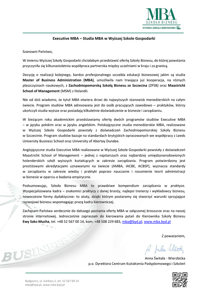 Executive MBA – Studia MBA w Wyższej Szkole Gospodarki Szanowni Państwo, W imieniu Wyższej Szkoły Gospodarki chciałabym przedstawić ofertę Szkoły Biznesu, do której powstania przyczyniła się kilkunastoletnia współpraca partnerska między uczelniami w kraju i za granicą. Decyzję o realizacji kolejnego, bardzo profesjonalnego szczebla edukacji biznesowej jakim są studia Master of Business Administration (MBA), umożliwiła nam trwająca już kooperacja, na różnych płaszczyznach naukowych, z Zachodniopomorską Szkołą Biznesu ze Szczecina (ZPSB) oraz Maastricht School of Management (MSM) z Holandii. Nie od dziś wiadomo, że tytuł MBA otwiera drzwi do najwyższych stanowisk menedżerskich na całym świecie. Program studiów MBA adresowany jest do osób pracujących zawodowo – praktyków, którzy ukończyli studia wyższe oraz posiadają kilkuletnie doświadczenie w biznesie i zarządzaniu. W bieżącym roku akademickim przedstawiamy ofertę dwóch programów studiów Executive MBA – w języku polskim oraz w języku angielskim. Polskojęzyczne studia menedżerskie MBA, realizowane w Wyższej Szkole Gospodarki powstały z doświadczeń Zachodniopomorskiej Szkoły Biznesu w Szczecinie. Program studiów bazuje na standardach brytyjskich opracowanych we współpracy z Leeds University Business School oraz University of Abertay Dundee. Anglojęzyczne studia Executive MBA realizowane w Wyższej Szkole Gospodarki powstały z doświadczeń Maastricht School of Management – jednej z najstarszych oraz najbardziej umiędzynarodowionych holenderskich szkół wyższych kształcących w zakresie zarządzania. Program potwierdzony jest prestiżowymi akredytacjami uznawanymi na świecie (AMBA, IACBE, ACBSP), wyznacza standardy w zarządzaniu w zakresie wiedzy i praktyki poprzez nauczanie i rozumienie teorii administracji w biznesie w oparciu o badania empiryczne. Podsumowując, Szkoła Biznesu MBA to prawdziwe kompendium zarządzania w praktyce. Wyspecjalizowana kadra – znakomici praktycy z danej branży, najlepsi trenerzy i wykładowcy biznesu, nowoczesne formy dydaktyczne: to atuty, dzięki którym postaramy się stworzyć warunki sprzyjające rozwojowi biznesu wspomagając pracę kadry kierowniczej. Zachęcam Państwa serdecznie do dalszego poznania oferty MBA w załączonej broszurze oraz na naszej stronie internetowej. Jednocześnie zapraszam do kierowania pytań do Kierownika Szkoły Biznesu Ewy Saks-Mucha, tel. +48 52 567 00 14, kom. +48 508 229 683, [email protected], www.mba.byd.pl Z poważaniem, Anna Świtała - Wierzbicka p.o. Dyrektora Centrum Kształcenia Podyplomowego i Szkoleń Bydgoszcz, ul. Garbary 2, tel. 52 567 00 14 [email protected], www.mba.byd.pl