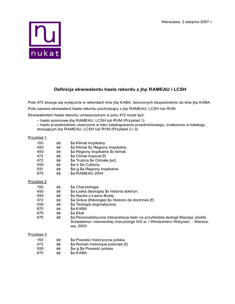Warszawa, 2 sierpnia 2007 r. Definicja ekwiwalentu hasła rekordu z jhp RAMEAU i LCSH Pole 472 stosuje się wyłącznie w rekordach khw jhp KABA, tworzonych bezpośrednio do khw jhp KABA. Pole zawiera ekwiwalent hasła rekordu pochodzący z jhp RAMEAU, LCSH lub RVM. Ekwiwalentem hasła rekordu umieszczanym w polu 472 może być: – hasło wzorcowe jhp RAMEAU, LCSH lub RVM (Przykład 1) – hasło przedmiotowe utworzone w toku katalogowania przedmiotowego, znalezione w katalogu stosującym jhp RAMEAU, LCSH lub RVM (Przykład 2 i 3) Przykład 1 150 450 450 472 472 550 551 670 @@ @@ @@ @@ @@ @@ @@ @@ $a Klimat tropikalny. $a Klimat $z Regiony tropikalne. $a Regiony tropikalne $x klimat. $a Climat tropical [f] $a Tropics $x Climate [ac] $w h $a Cyklony. $w g $a Regiony tropikalne. $a RAMEAU 2004 Przykład 2 150 @@ 450 @@ 450 @@ 472 @@ 550 @@ 670 @@ 670 @@ 670 @@ $a Charytologia. $a Łaska (teologia) $x historia doktryn. $a Nauka o Łasce Bożej. $a Grâce (théologie) $x Histoire de doctrines [f] $a Teologia dogmatyczna. $a KABA $a Ekat $a Personalistyczna interpretacja łaski na przykładzie teologii Macieja Józefa Scheebena i niemieckiej charytologii XIX w. / Włodzimierz Wołyniec. - Warsza- wa, 2003 Przykład 3 150 472 550 670 $a Powieść historyczna polska. $a Roman historique polonais [f] $w g $a Powieść polska. $a KABA @@ @@ @@ @@