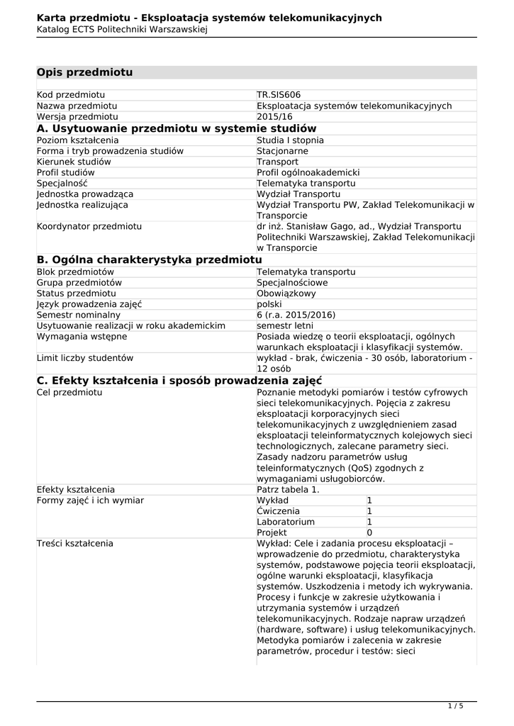 Karta przedmiotu - Eksploatacja systemów telekomunikacyjnych Katalog ECTS Politechniki Warszawskiej Opis przedmiotu Kod przedmiotu Nazwa przedmiotu Wersja przedmiotu TR.SIS606 Eksploatacja systemów telekomunikacyjnych 2015/16 A. Usytuowanie przedmiotu w systemie studiów Poziom kształcenia Forma i tryb prowadzenia studiów Kierunek studiów Profil studiów Specjalność Jednostka prowadząca Jednostka realizująca Koordynator przedmiotu Studia I stopnia Stacjonarne Transport Profil ogólnoakademicki Telematyka transportu Wydział Transportu Wydział Transportu PW, Zakład Telekomunikacji w Transporcie dr inż. Stanisław Gago, ad., Wydział Transportu Politechniki Warszawskiej, Zakład Telekomunikacji w Transporcie B. Ogólna charakterystyka przedmiotu Blok przedmiotów Grupa przedmiotów Status przedmiotu Język prowadzenia zajęć Semestr nominalny Usytuowanie realizacji w roku akademickim Wymagania wstępne Limit liczby studentów Telematyka transportu Specjalnościowe Obowiązkowy polski 6 (r.a. 2015/2016) semestr letni Posiada wiedzę o teorii eksploatacji, ogólnych warunkach eksploatacji i klasyfikacji systemów. wykład - brak, ćwiczenia - 30 osób, laboratorium 12 osób C. Efekty kształcenia i sposób prowadzenia zajęć Cel przedmiotu Efekty kształcenia Formy zajęć i ich wymiar Treści kształcenia Poznanie metodyki pomiarów i testów cyfrowych sieci telekomunikacyjnych. Pojęcia z zakresu eksploatacji korporacyjnych sieci telekomunikacyjnych z uwzględnieniem zasad eksploatacji teleinformatycznych kolejowych sieci technologicznych, zalecane parametry sieci. Zasady nadzoru parametrów usług teleinformatycznych (QoS) zgodnych z wymaganiami usługobiorców. Patrz tabela 1. Wykład 1 Ćwiczenia 1 Laboratorium 1 Projekt 0 Wykład: Cele i zadania procesu eksploatacji – wprowadzenie do przedmiotu, charakterystyka systemów, podstawowe pojęcia teorii eksploatacji, ogólne warunki eksploatacji, klasyfikacja systemów. Uszkodzenia i metody ich wykrywania. Procesy i funkcje w zakresie użytkowania i utrzymania systemów i urządzeń telekomunikacyjnych. Rodzaje napraw urządzeń (hardware, software) i usług telekomunikacyjnych. Metodyka pomiarów i zalecenia w zakresie parametrów, procedur i testów: sieci 1/5 Karta przedmiotu - Eksploatacja systemów telekomunikacyjnych Katalog ECTS Politechniki Warszawskiej Opis przedmiotu Metody oceny Metody sprawdzania efektów kształcenia Egzamin Literatura światłowodowych, sieci teletransmisyjnych (PDH, SDH), sieci DWDM, sieci komutacyjnych, sieci TCP/IP, sieci komputerowych. Pomiary parametrów kabli miedzianych pod katem zastosowania ich w sieciach dostępowych (Access Network). Zagadnienia związane z pomiarami sieci radiowych stosowanych w transporcie kolejowym (GSM-R). Rola systemu GSM-R w systemie ERTMS/ETCS. Problematyka zasilania urządzeń telekomunikacyjnych. Zasady uziemień w kolejowych obiektach telekomunikacyjnych. Organizacja służb eksploatacyjnych urządzeń telekomunikacyjnych. Ćwiczenia audytoryjne: Uszczegółowienie wiedzy podanej na wykładach a w szczególności omówienie metodyki pomiarów łączy dużej przepustowości w kolejowych sieciach telekomunikacyjnych (systemy SDH, GbEth, DWDM). Metody redundancji systemu GSM-R dla potrzeb systemu ERTMS/ETCS. Metodyka zapewnienia bezpieczeństwa telekomunikacyjnego sieci w zakresie systemów zasilania, klimatyzacji synchronizacji. Praktyczne rozwiązania w zakresie utrzymania: sieci światłowodowych, sieci teletransmisyjnych, węzłów komutacyjnych i sieci IP (zajęcia terenowe). Ćwiczenia laboratoryjne: Sprawdzanie poprawności funkcjonowania łączy wewnętrznych centrali cyfrowej. Badanie analogowych łączy abonenckich z wykorzystaniem robota pomiarowego centrali cyfrowej. Pomiary światłowodowych torów transmisyjnych. Badanie możliwości transmisyjnych systemów ADSL. Monitorowanie stanu sieci informatycznej. Badanie możliwości funkcjonalnych stanowiska dyspozytorskiego. Wykład: ocena podsumowująca: kolokwium zawierające od 6 do 8 pytań oraz ew. zaliczenie ustne. Ćwiczenia: ocena formująca: wykonanie sprawozdań z każdego z ćwiczeń, ocena podsumowująca: kolokwium zawierające od 8 do 12 pytań oraz ew. zaliczenie ustne. Patrz tabela 1. nie 1) Jajszczyk A.: Wstęp do telekomutacji. WNT, Warszawa, 2009; 2) Kaźmierczak J.: Eksploatacja systemów technicznych. Wydawnictwo Pol. Śląskiej, Gliwice, 2000; 3) Komar B.: Administracja sieci TCP/IP : dla każdego. Wydawnictwo Helion, Gliwice, 2000; 4) Kula S.: Systemy teletransmisyjne. WKiŁ, Warszawa, 2004; 5) Niziński S.: Eksploatacja obiektów technicznych. Wydaw. i Zakł. Poligrafii Inst. Technologii Eksploatacji, Radom, 2002. 2/5 Karta przedmiotu - Eksploatacja systemów telekomunikacyjnych Katalog ECTS Politechniki Warszawskiej Opis przedmiotu Witryna www przedmiotu www.twt.wt.pw.edu.pl D. Nakład pracy studenta Liczba punktów ECTS Liczba godzin pracy studenta związanych z osiągnięciem efektów kształcenia 4 120 godz., w tym: praca na wykładach - 15 godz., praca na ćwiczeniach - 15 godz., praca na zajęciach laboratoryjnych - 15 godz., zapoznanie się ze wskazaną literaturą w zakresie wykładu oraz ćwiczeń - 10 godz., zapoznanie się ze wskazaną literaturą w zakresie zajęć laboratoryjnych - 12 godz., konsultacje - 3 godz. (w tym 1 godz. w zakresie laboratoriów), przygotowanie się do ćwiczeń laboratoryjnych 20, wykonanie sprawozdań z ćwiczeń laboratoryjnych - 14 godz., przygotowanie się do kolokwium zaliczającego ćwiczenia audytoryjne - 8 godz., przygotowanie się do kolokwium zaliczającego wykład - 8 godz. Liczba punktów ECTS na zajęciach wymagających 2,0 pkt ECTS (48 godz., w tym: praca na bezpośredniego udziału nauczycieli akademickich: wykładach - 15 godz., praca na ćwiczeniach - 15 godz., praca na zajęciach laboratoryjnych - 15 godz., konsultacje - 3 godz.) Liczba punktów ECTS, którą student uzyskuje w 2,5 pkt ECTS (62 godz., w tym: praca na zajęci