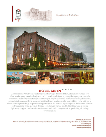 HOTEL MŁYN Zapraszamy Państwa do czterogwiazdkowego Hotelu Młyn, zlokalizowanego we Włocławku przy drodze krajowej nr 1. Hotel, spełniając wymogi kategoryzacyjne dla obiektów hotelowych czterogwiazdkowych w połączeniu z niepowtarzalną atmosferą ponad stuletniego młyna solnego jest idealnym miejscem dla wszystkich tych, którzy w danej chwili poszukują odpowiedniego miejsca do pracy i wypoczynku. PołoŜenie Hotelu jednocześnie przy głównej drodze i pięknym parku im. H. Sienkiewicza z rzeką Zgłowiączką jest doskonałym miejscem na krótki przystanek w podróŜy jak i długi wypoczynek. HOTEL Hotel Młyn oferuje gościom 76 luksusowo wyposaŜonych pokoi. rodzaj DBM DBS DBE DBME TRP STD APA ilość 5 46 4 1 8 3 9 opis Pokój dwuosobowy ze wspólnym łoŜem Pokój dwuosobowy z osobnymi łóŜkami Pokój dwuosobowy z osobnymi łóŜkami podwyŜszony standard Pokój trzyosobowy z podwójnym łoŜem i dostawką Pokój trzyosobowy Pokój z podwójnym łoŜem i dostawką Apartament dwupokojowy z podwójnym łoŜem i dostawką CENNIK POKOI (ceny brutto) rodzaj DBM DBS DBE DBME TRP STD APA Cena dla 1 osoby 199 190 209 209 209 209 350 Cena dla 2 osób 229 229 249 249 249 250 350 Cena zawiera śniadanie DODATKOWO PŁATNE: PARKING 10 zł ZWIERZĘ 50 zł WYPOSAśENIE POKOI ŁAZIENKA TV TV SAT TELEFON LODÓWKA MINIBAREK Cena dla 3 osób 289 289 250 350 KONFERENCJE Hotel posiada 5 nowocześnie wyposaŜonych sal konferencyjnych SALA VIP ROOM OWSIANA GRYCZANA POWIERZ CHNIA 30m2 70m2 60m2 JĘCZMIENNA 60m2 PSZENICZNA 450m2 WYPOSAśENIE TV 52”, wieŜa stereo ekran Projektor multimedialny, tablica multimedialna, Komputer, nagłośnienie, flipchart Projektor multimedialny, tablica multimedialna, Komputer, nagłośnienie, flipchart Projektor multimedialny, ekran, nagłośnienie CENNIK SAL (ceny brutto) SALA VIP ROOM OWSIANA GRYCZANA JĘCZMIENNA PSZENICZNA cena 450zł 799zł 799zł 799zł 1299zł UKŁAD SAL SALA VIP ROOM OWSIANA GRYCZANA JĘCZMIENNA PSZENICZNA TEATRALNIE 22 60 50 50 300 SZKOLNIE 10 30 26 26 150 PODKOWA 14 35 30 30 130 CENNIK DODATKOWEGO WYPOSAśENIA (ceny brutto) sprzęt Projektor multimedialny Flipchart mikrofon TV Cena na dzień 200zł 50zł 50zł 200zł CATERING (ceny brutto) sprzęt Serwis kawowy obiad kolacja Cena na dzień Od 10 zł Od 52zł Od 50zł Kolacje uroczyste Od 100zł RESTAURACJA Restauracja Miodowa Hotelu Młyn **** oferuje Państwu kartę menu pełną smakołyków z wielu narodowych kuchni Europy. W eleganckim i nastrojowym wnętrzu mogą Państwo degustować dania kuchni Śródziemnomorskiej, wyśmienite polskie potrawy przygotowywane według autorskich receptur Szefa Kuchni, jak równieŜ specjały kuchni francuskiej dla najbardziej wymagających smakoszy. Kuchnia Restauracji zadziwia bogactwem i róŜnorodnością potraw, od wyszukanych dań z dziczyzny po delikatne przysmaki owoców morza. Restauracja Miodowa jest idealnym miejscem do organizowania zarówno spotkań towarzyskich jak i słuŜbowych, a takŜe bankietów i przyjęć okolicznościowych. Niepowtarzalny klimat muzyki na Ŝywo zapewni wyjątkowo miłą atmosferę spotkań z rodziną, przyjaciółmi czy romantycznej kolacji we dwoje i sprawi, Ŝe pozostaną w pamięci na długo SALA MIODOWA To główna sala restauracyjna MoŜemy tu zaprosić do 80 gości. Doskonała zarówno na spotkania indywidualne jak i przyjęcia weselne. SALA OWSIANA Sala do 30 osób. Doskonała na spotkania biznesowe jak i mniejsze uroczystości. Tu często organizujemy przyjęcia imieninowe, komunie i inne… SALA VIP Sala do 12 osób. Doskonała na biznes lunch jak i inne mniejsze spotkania. GOSPODA U MŁYNARZA To integralna część hotelu, gdzie króluje kuchnia staropolska. To zjesz dania z grilla i nasze własne wyroby: pasztety, pierogi, wędliny. Od wiosny do jesieni zapraszamy do ogródka letniego. Gospoda moŜe pomieścić do 120 osób. To równieŜ doskonałe miejsce na Imprezy integracyjne. W kaŜdy wtorek i czwartek zapraszamy na gorące KARAOKE! KLUB PIEKARNIA To przede wszystkim miejsce dobrej muzyko i zabawy. Do Klubu moŜemy zaprosić 500 osób. Tu odbywają się niezapomniane dyskoteki oraz Imprezy zorganizowane dla firm. Klub składa się z dwóch poziomów, na kaŜdym jest osobny bar. W kaŜdy piątek i sobotę zapraszamy na energetyczne dyskoteki! SPA • • • • • • • Wkrótce zapraszamy do SPA. Pełen zakres usług: Kosmetyka Fryzjer MasaŜe Sauna Basen Jacuzzi siłownia