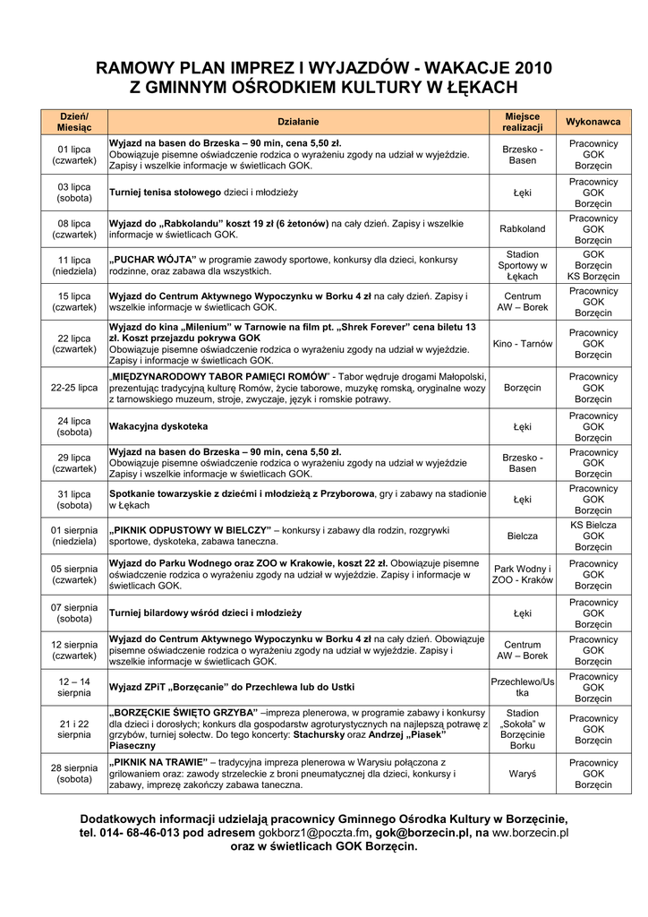RAMOWY PLAN IMPREZ I WYJAZDÓW - WAKACJE 2010 Z GMINNYM OŚRODKIEM KULTURY W ŁĘKACH Dzień/ Miesiąc 01 lipca (czwartek) 03 lipca (sobota) Działanie Wyjazd na basen do Brzeska – 90 min, cena 5,50 zł. Obowiązuje pisemne oświadczenie rodzica o wyraŜeniu zgody na udział w wyjeździe. Zapisy i wszelkie informacje w świetlicach GOK. Turniej tenisa stołowego dzieci i młodzieŜy Miejsce realizacji Wykonawca Brzesko Basen Pracownicy GOK Borzęcin Łęki Pracownicy GOK Borzęcin 08 lipca (czwartek) Wyjazd do „Rabkolandu” koszt 19 zł (6 Ŝetonów) na cały dzień. Zapisy i wszelkie informacje w świetlicach GOK. Rabkoland Pracownicy GOK Borzęcin 11 lipca (niedziela) „PUCHAR WÓJTA” w programie zawody sportowe, konkursy dla dzieci, konkursy rodzinne, oraz zabawa dla wszystkich. Stadion Sportowy w Łękach GOK Borzęcin KS Borzęcin 15 lipca (czwartek) Wyjazd do Centrum Aktywnego Wypoczynku w Borku 4 zł na cały dzień. Zapisy i wszelkie informacje w świetlicach GOK. Centrum AW – Borek Pracownicy GOK Borzęcin 22 lipca (czwartek) Wyjazd do kina „Milenium” w Tarnowie na film pt. „Shrek Forever” cena biletu 13 zł. Koszt przejazdu pokrywa GOK Obowiązuje pisemne oświadczenie rodzica o wyraŜeniu zgody na udział w wyjeździe. Zapisy i informacje w świetlicach GOK. Kino - Tarnów Pracownicy GOK Borzęcin 22-25 lipca „MIĘDZYNARODOWY TABOR PAMIĘCI ROMÓW” - Tabor wędruje drogami Małopolski, prezentując tradycyjną kulturę Romów, Ŝycie taborowe, muzykę romską, oryginalne wozy z tarnowskiego muzeum, stroje, zwyczaje, język i romskie potrawy. Borzęcin Pracownicy GOK Borzęcin Łęki Pracownicy GOK Borzęcin Brzesko Basen Pracownicy GOK Borzęcin Łęki Pracownicy GOK Borzęcin Bielcza KS Bielcza GOK Borzęcin Park Wodny i ZOO - Kraków Pracownicy GOK Borzęcin Łęki Pracownicy GOK Borzęcin Centrum AW – Borek Pracownicy GOK Borzęcin Przechlewo/Us tka Pracownicy GOK Borzęcin Stadion „Sokoła” w Borzęcinie Borku Pracownicy GOK Borzęcin Waryś Pracownicy GOK Borzęcin 24 lipca (sobota) 29 lipca (czwartek) 31 lipca (sobota) Wakacyjna dyskoteka Wyjazd na basen do Brzeska – 90 min, cena 5,50 zł. Obowiązuje pisemne oświadczenie rodzica o wyraŜeniu zgody na udział w wyjeździe Zapisy i wszelkie informacje w świetlicach GOK. Spotkanie towarzyskie z dziećmi i młodzieŜą z Przyborowa, gry i zabawy na stadionie w Łękach 01 sierpnia (niedziela) „PIKNIK ODPUSTOWY W BIELCZY” – konkursy i zabawy dla rodzin, rozgrywki sportowe, dyskoteka, zabawa taneczna. 05 sierpnia (czwartek) Wyjazd do Parku Wodnego oraz ZOO w Krakowie, koszt 22 zł. Obowiązuje pisemne oświadczenie rodzica o wyraŜeniu zgody na udział w wyjeździe. Zapisy i informacje w świetlicach GOK. 07 sierpnia (sobota) Turniej bilardowy wśród dzieci i młodzieŜy 12 sierpnia (czwartek) Wyjazd do Centrum Aktywnego Wypoczynku w Borku 4 zł na cały dzień. Obowiązuje pisemne oświadczenie rodzica o wyraŜeniu zgody na udział w wyjeździe. Zapisy i wszelkie informacje w świetlicach GOK. 12 – 14 sierpnia Wyjazd ZPiT „Borzęcanie” do Przechlewa lub do Ustki 21 i 22 sierpnia „BORZĘCKIE ŚWIĘTO GRZYBA” –impreza plenerowa, w programie zabawy i konkursy dla dzieci i dorosłych; konkurs dla gospodarstw agroturystycznych na najlepszą potrawę z grzybów, turniej sołectw. Do tego koncerty: Stachursky oraz Andrzej „Piasek” Piaseczny 28 sierpnia (sobota) „PIKNIK NA TRAWIE” – tradycyjna impreza plenerowa w Warysiu połączona z grilowaniem oraz: zawody strzeleckie z broni pneumatycznej dla dzieci, konkursy i zabawy, imprezę zakończy zabawa taneczna. Dodatkowych informacji udzielają pracownicy Gminnego Ośrodka Kultury w Borzęcinie, tel. 014- 68-46-013 pod adresem [email protected], [email protected], na ww.borzecin.pl oraz w świetlicach GOK Borzęcin.