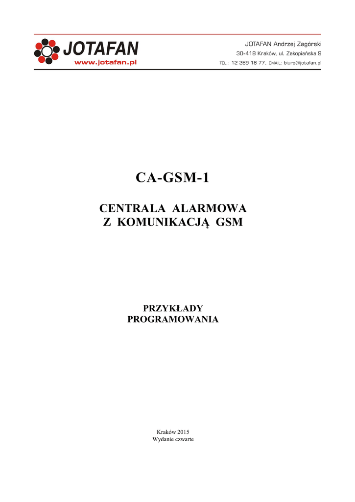 CA-GSM-1 CENTRALA ALARMOWA Z KOMUNIKACJĄ GSM PRZYKŁADY PROGRAMOWANIA Kraków 2015 Wydanie czwarte Centrala CA-GSM-1 PRZYKŁADOWE SCENARIUSZE KONFIGURACJI PARAMETRÓW CENTRALI KROK PO KROKU..................................................................................................................... 3 1.1. Konfiguracja hasła dostępu ...................................................................... 5 1.2. Konfiguracja własnego numeru jako zaufanego ...................................... 6 1.3. Dołączenie czujnika temperatury TEMP-201 i konfiguracja powiadomień, test powiadomienia ..................................................................... 8 1.4. Zliczanie alarmów od temperatury przy pomocy licznika impulsowego 13 1.5. Ustawienia dotyczące monitorowania stanu zasilacza i akumulatora ... 16 1.6. Konfiguracja do współpracy z czujnikiem analogowym ....................... 18 1.7. Współpraca z czujnikiem wilgotności RHT-01 ..................................... 21 1.8. Monitorowanie stanu krańcówki i sygnalizator alarmowy .................... 24 1.9. Współpraca z czujnikiem ruchu PIR ...................................................... 30 2 JOTAFAN Centrala CA-GSM-1 Przykładowe scenariusze konfiguracji parametrów centrali krok po kroku. Zostanie tutaj przedstawiony przykładowy proces konfiguracji Centrali do wykonywania różnych zadań wraz z dokładnym opisem ustawienia parametrów konfiguracyjnych. Zapoznanie się z przedstawionym opisem umożliwi poznanie części możliwości Centrali, budowy i sposobu obsługi programu konfiguracyjnego oraz terminologii związanej z system. Ilekroć w poniższej instrukcji mowa o nawiązaniu połączenia, odczycie lub zapisie parametrów postępuj zgodnie z instrukcjami podanymi w Tab. 1. Tab. 1. Podstawowe operacje w trakcie pracy z programem w trybie Online Polecenie Sposób wykonania Nawiązanie połączenia Upewnij się, że zestawione jest pewne połączenie kablowe pomiędzy komputerem i płytą Centrali. Kliknij w czerwoną ikonę nieaktywnego połączenia. W oknie, które się pojawi wprowadź prawidłowe hasło dostępu. Jeśli nie zmieniłeś hasła domyślnego (fabrycznego) to należy wprowadzić „A1B2”. Znaki są zamaskowane w celu ochrony Twojego hasła dostępu. Po wpisaniu wybierz OK. Jeśli hasło zostało zaakceptowane, czerwona ikona braku połączenia zmieni swój kolor na jaskrawo zielony. Odczyt parametrów JOTAFAN Oznacza to, że połączenie zostało nawiązane. Połączenie musi być nawiązane. Kliknij parametrów z Centrali. ikonę odczytu 3 Centrala CA-GSM-1 Zapis Parametrów Parametry zostaną odczytane. Proces może zająć kilkanaście sekund. W tym czasie będą się pojawiać okna z paskiem postępu operacji. Połączenie musi być nawiązane. Kliknij ikonę zapisu parametrów do Centrali. Zostanie otwarte okno zawierające ostrzeżenie o zamiarze wprowadzenia nieodwracalnych zmian w ustawieniach Centrali. UWAGA: zapis bez przeprowadzenia uprzednio odczytu z Centrali lub z pliku spowoduje zapis startowych wartości z programu. Wybierz opcję „TAK”, jeśli masz pewność co do wprowadzanych wartości. Parametry zostaną zapisane. Proces może zająć kilkanaście sekund. W tym czasie będą się pojawiać okna z paskiem postępu operacji. Zakończenie operacji zostanie potwierdzone stosownym komunikatem. Potwierdź „OK”. 4 JOTAFAN Centrala CA-GSM-1 1.1. Konfiguracja hasła dostępu Hasło dostępu zabezpiecza ustawienia Centrali przed niepowołanym dostępem. Jest to jednocześnie hasło umożliwiające dostęp do parametrów i zmianę ustawień urządzenia przy Pomocy telefonu komórkowego. Informacja: fabryczne hasło dostępu to A1B2. Po ustanowieniu połączenia z Centralą i wczytaniu jej parametrów wykonuj kolejno następujące kroki: 1. Z menu głównego programu wybierz pozycję „Okna”, a następnie „Dostęp/SIM”. 2. Wybierz drugą zakładkę okna, które się otworzyło. Zakładka nazywa się „Hasło i usługi” 3. W polu HASŁO widoczne jest aktualne hasło dostępu. Jeśli zamiast znaków widzisz kropki, możesz odsłonić treść hasła zaznaczając opcję „Pokaż”. 4. Wprowadź własne, 4-znakowe hasło. Możesz także użyć cyfr. Chroń swoje hasło. Pamiętaj też, że to samo hasło będzie używane do konfiguracji i odpytywania Centrali przez SMS. 5. Upewnij się, że hasło wprowadziłeś prawidłowo oraz że zapamiętałeś je dokładnie (i/lub zapisałeś je w sposób uniemożliwiający dostęp osobom niepowołanym). Od momentu, kiedy zapiszesz ustawienia, będzie obowiązywać nowe, wprowadzone właśnie hasło. 6. Zapisz parametry do Centrali. JOTAFAN 5 Centrala CA-GSM-1 1.2. Konfiguracja własnego numeru jako zaufanego Aby uzyskać dostęp do funkcji Centrali w sposób zdalny (używając telefonu) należy wprowadzić numer telefonu, którego będziesz używał do pamięci urządzenia jako numer zaufany. Po ustanowieniu połączenia z Centralą i wczytaniu jej parametrów wykonuj kolejno nastęPujące kroki: 1. Z menu głównego programu wybierz pozycję „Okna”, a następnie „Dostęp/SIM”. W oknie, które się otworzyło, na pierwszej zakładce widoczna jest lista ośmiu numerów zaufanych w formie tabeli z kolumnami: Numer oraz Nazwa. 2. Potwierdź, że chcesz ustawić pierwszy numer telefonu klikając lewym klawiszem myszy w pierwszym wierszu tabeli w polu Numer. 6 JOTAFAN Centrala CA-GSM-1 3. Przytrzymując lewy przycisk myszy zaznacz treść pola edycyjnego NUMER w grupie Parametry. 4. Wprowadź numer własnego telefonu zaczynając od „48” jako cyfr kierunkowych do Polski. Przykładowo, jeśli Twój numer telefonu to: 404 555 666, wprowadź „48404555666”. 5. W polu NAZWA wprowadź nazwę, która podpowie Tobie lub innym użytkownikom systemu, do kogo należy ten numer. 6. Zaznacz wybrane przywileje. Jeśli jesteś właścicielem/administratorem systemu, zapewne zechcesz przydzielić sobie wszystkie dostępne praw