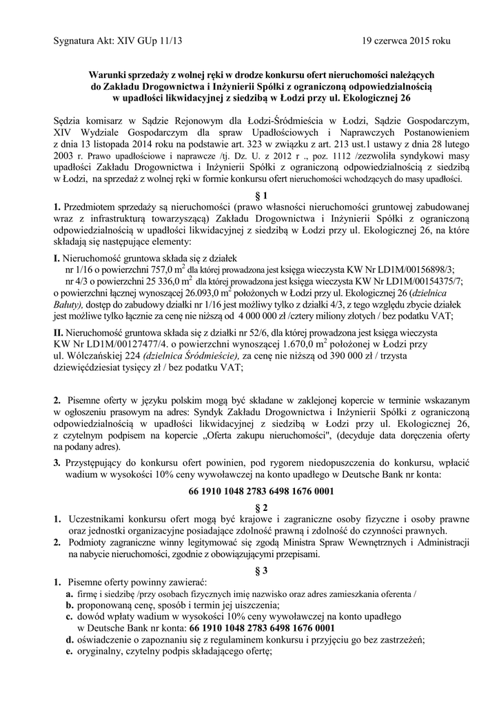 Sygnatura Akt: XIV GUp 11/13 19 czerwca 2015 roku Warunki sprzedaży z wolnej ręki w drodze konkursu ofert nieruchomości należących do Zakładu Drogownictwa i Inżynierii Spółki z ograniczoną odpowiedzialnością w upadłości likwidacyjnej z siedzibą w Łodzi przy ul. Ekologicznej 26 Sędzia komisarz w Sądzie Rejonowym dla Łodzi-Śródmieścia w Łodzi, Sądzie Gospodarczym, XIV Wydziale Gospodarczym dla spraw Upadłościowych i Naprawczych Postanowieniem z dnia 13 listopada 2014 roku na podstawie art. 323 w związku z art. 213 ust.1 ustawy z dnia 28 lutego 2003 r. Prawo upadłościowe i naprawcze /tj. Dz. U. z 2012 r ., poz. 1112 /zezwoliła syndykowi masy upadłości Zakładu Drogownictwa i Inżynierii Spółki z ograniczoną odpowiedzialnością z siedzibą w Łodzi, na sprzedaż z wolnej ręki w formie konkursu ofert nieruchomości wchodzących do masy upadłości. §1 1. Przedmiotem sprzedaży są nieruchomości (prawo własności nieruchomości gruntowej zabudowanej wraz z infrastrukturą towarzyszącą) Zakładu Drogownictwa i Inżynierii Spółki z ograniczoną odpowiedzialnością w upadłości likwidacyjnej z siedzibą w Łodzi przy ul. Ekologicznej 26, na które składają się następujące elementy: I. Nieruchomość gruntowa składa się z działek nr 1/16 o powierzchni 757,0 m2 dla której prowadzona jest księga wieczysta KW Nr LD1M/00156898/3; nr 4/3 o powierzchni 25 336,0 m2 dla której prowadzona jest księga wieczysta KW Nr LD1M/00154375/7; o powierzchni łącznej wynoszącej 26.093,0 m2 położonych w Łodzi przy ul. Ekologicznej 26 (dzielnica Bałuty), dostęp do zabudowy działki nr 1/16 jest możliwy tylko z działki 4/3, z tego względu zbycie działek jest możliwe tylko łącznie za cenę nie niższą od 4 000 000 zł /cztery miliony złotych / bez podatku VAT; II. Nieruchomość gruntowa składa się z działki nr 52/6, dla której prowadzona jest księga wieczysta KW Nr LD1M/00127477/4. o powierzchni wynoszącej 1.670,0 m2 położonej w Łodzi przy ul. Wólczańskiej 224 (dzielnica Śródmieście), za cenę nie niższą od 390 000 zł / trzysta dziewięćdziesiat tysięcy zł / bez podatku VAT; 2. Pisemne oferty w języku polskim mogą być składane w zaklejonej kopercie w terminie wskazanym w ogłoszeniu prasowym na adres: Syndyk Zakładu Drogownictwa i Inżynierii Spółki z ograniczoną odpowiedzialnością w upadłości likwidacyjnej z siedzibą w Łodzi przy ul. Ekologicznej 26, z czytelnym podpisem na kopercie „Oferta zakupu nieruchomości", (decyduje data doręczenia oferty na podany adres). 3. Przystępujący do konkursu ofert powinien, pod rygorem niedopuszczenia do konkursu, wpłacić wadium w wysokości 10% ceny wywoławczej na konto upadłego w Deutsche Bank nr konta: 66 1910 1048 2783 6498 1676 0001 §2 1. Uczestnikami konkursu ofert mogą być krajowe i zagraniczne osoby fizyczne i osoby prawne oraz jednostki organizacyjne posiadające zdolność prawną i zdolność do czynności prawnych. 2. Podmioty zagraniczne winny legitymować się zgodą Ministra Spraw Wewnętrznych i Administracji na nabycie nieruchomości, zgodnie z obowiązującymi przepisami. §3 1. Pisemne oferty powinny zawierać: a. firmę i siedzibę /przy osobach fizycznych imię nazwisko oraz adres zamieszkania oferenta / b. proponowaną cenę, sposób i termin jej uiszczenia; c. dowód wpłaty wadium w wysokości 10% ceny wywoławczej na konto upadłego w Deutsche Bank nr konta: 66 1910 1048 2783 6498 1676 0001 d. oświadczenie o zapoznaniu się z regulaminem konkursu i przyjęciu go bez zastrzeżeń; e. oryginalny, czytelny podpis składającego ofertę; f. oferent winien udokumentować, że dysponuje środkami finansowymi umożliwiającymi zakup , g. w przypadku oferentów nie będących osobami fizycznymi aktualny wypis z właściwego rejestru dokumentujący prawo do składania wiążących oświadczeń woli w imieniu danego podmiotu, przez osobę, która podpisała ofertę, a jeżeli ofertę podpisuje pełnomocnik, to również pełnomocnictwo podpisane zgodnie z zasadą reprezentacji. 2. W przypadku złożenia wspólnej oferty należy określić rodzaj współwłasności, a przy współwłasności ułamkowej również wysokość udziału we współwłasności. §4 Oferty, które nie spełniają warunków określonych w paragrafie poprzedzającym lub które wpłynęły po dniu wyznaczonym w ogłoszeniu o konkursie nie będą rozpatrywane. §5 1. Pełnomocnictwo do udziału w konkursie oraz do złożenia oświadczeń wymaganych niniejszym regulaminem powinno być stwierdzone dokumentem z podpisem notarialnie poświadczonym. 2. Pełnomocnictwa udzielone adwokatom lub radcom prawnym nie wymagają poświadczenia. §6 Ogłoszenie o konkursie ofert zostanie podane do wiadomości publicznej przez jego zamieszczenie w dzienniku ogólnopolskim nie później niż na dwa tygodnie przed terminem konkursu. §7 1. Wadium wpłacone przez uczestnika, który wygrał konkurs zalicza się na poczet ceny sprzedaży. 2. Wadium wpłacone przez pozostałych uczestników podlega zwrotowi niezwłocznie po zakończeniu konkursu na koszt oferentów na podany przez nich rachunek bankowy. 3. Wadium przepada na rzecz masy upadłości w razie uchylenia się, bądź odstąpienia uczestnika, którego oferta została wybrana od zawarcia umowy sprzedaży w terminie wyznaczonym przez syndyka;. §8 Syndyk dokonuje komisyjnego otwarcia ofert i wybiera najkorzystniejszą z nich, bądź ustala, że konkurs został zamknięty bez wyboru żadnej z ofert. §9 Złożenie jednej oferty wystarcza do przeprowadzenia konkursu. § 10 1. Syndyk zawiera umowę sprzedaży w terminie określonym przez siebie nie dłuższym niż cztery miesiące od dnia wyboru oferty, 2. Z dniem zawarcia umowy sprzedaży w formie aktu notarialnego na nabywcę przechodzą: pożytki jakie przynosi nieruchomość, podatki i inne daniny publiczne przypadające z nieruchomości. § 11 Protokolarne przekazanie przedmiotu sprzedaży nas