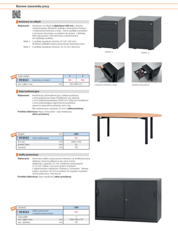 Biurowe stanowiska pracy Kontenery na rolkach Wykonanie: Kontenery na rolkach o głębokości 600 mm, z drewna melaminowego. Metalowe szuflady z drewnianym frontem i możliwością otwierania z boku. Górna szuflada z korytkiem z tworzywa sztucznego na przybory do pisania, z blokadą. Rolki wpuszczane i bez hamulców, przystosowane do miękkiego podłoża. Wielk. 3 – 3 szuflady (wysokości frontów 70, 120 i 320 mm). W dolnej szufladzie można zamontować zawieszany kosz. Wielk. 4 – 4 szuflady (wysokości frontów: 70, 2×120 i 200 mm). 99 8541_3 91Q liczba szuflad 99 8541 Kontenery na rolkach szer.×głęb.×wys. mm 3 4 XXX XXX 432×600×511 Stoły konferencyjne Wykonanie: Komfortowy stół konferencyjny. Stabilna podstawa z ramą poprzeczną. Nogi z kształtowej rury stalowej 2 mm, przekrój kwadratowy 50/50 mm. Połączone kształtowo z ramą usztywniającą. Ergonomiczna podstawa zapewnia optymalną swobodę ruchu nóg. Blat melaminowy o grubości 25 mm z okleiną bukową Powłoka lakiernicza: Nogi i rama podst - szary metaliczny, lakier proszkowy. 91Q długość 99 8542 mm 2000 mm mm mm 2000×1050 25 720 XXX Stoły konferencyjne dł.×szer. grubość blatu wysokość Szafka pomocnicza Wykonanie: Drewniana szafka z przesuwnymi drzwiami, ze środkową ścianą działową i dwoma półkami (z obu stron ścianki działowej), o grubości 25 mm, możliwość przestawiania co 32 mm. Szafka z mocnymi tylnymi ściankami z wykończeniem meblowym. Dostawa z uchwytami. Stalowy cokół o wysokości 30 mm ze śrubami do regulacji wysokości. Zamek patentowy i dwa klucze. Powłoka lakiernicza: Szary metaliczny, lakier proszkowy. 1200 91Q szerokość 99 8543 Szafka pomocnicza z drzwiami przesuwnymi liczba półek szer.×głęb.×wys. wys. użytkowa XXX mm mm 2 1200×450×779 705 możliwość otwierania z boku 99 8541_4 przykład zastosowania Biurowe stanowiska pracy Stoły Wykonanie: Komfortowy stół biurowy z płynną regulacją wysokości (zakres regulacji 680 − 820 mm). Stabilna podstawa z ramą poprzeczną. Nogi z kształtowej rury stalowej 2 mm, przekrój kwadratowy 50/50 mm. Połączone kształtowo z ramą usztywniającą. Ergonomiczna podstawa zapewnia optymalną swobodę ruchu nóg. 99 8532 – blat melaminowy o grubości 25 mm, z okleiną bukową. 99 8533 – blat melaminowy o grubości 25 mm, z okleiną szarą. Powłoka lakiernicza: Nogi i rama podstawy - szary metaliczny, lakier proszkowy. 918533_1600 okleina bukowa 91Q 91Q szerokość 99 8532 99 8533 okleina szara stabilna podstawa 1600 mm Stół biurowy, bukowy XXX Stół biurowy, szary jasny XXX szerokość × głębokość grubość blatu wysokość mm mm mm 1600×800 25 680−820 Narożnikowe stoły dostawne Pasuje do: Wykonanie: Stołów biurowych nr art. nr 99 8532 i 99 8533. Narożnikowy stół dostawny z blatem o grubości 25 mm. Stabilna podstawa, nogi nie przeszkadzają przy siedzeniu. _2L 1... = ... L = 2 ... = ... R = 1L 1R 2L 2R Narożnikowe stoły dostawne, bukowy XXX XXX XXX XXX Narożnikowe stoły dostawne, szare jasne XXX XXX XXX XXX 91Q 91Q typ 99 8534 99 8536 dług.×głęb. blatu grubość blatu wysokość mm mm mm _1R 1200×1200 25 680 - 820 Osłony przestrzeni dla nóg Pasuje do: Stołów biurowych nr 99 8532 i 99 8533. Wykonanie: 99 8538 – drewniana, z powłoką melaminową w kolorze szarym metalicznym. Optymalna maskownica. 99 8540 – stalowa, z okrągłymi otworami. Optymalna maskownica. W dostawie: Z częściami do mocowania. drewno 99 8538_1600 91Q 91Q odpowiednia do szerokości stołu 99 8538 99 8540 mm 1600 Osłony przestrzeni dla nóg, drewniane XXX Osłony przestrzeni dla nóg, metalowe XXX szerokość wysokość×głębokość (99 8538) wysokość×głębokość (99 8540) mm mm mm 1400 490×10 490×0,9 metal 99 8540_1600
