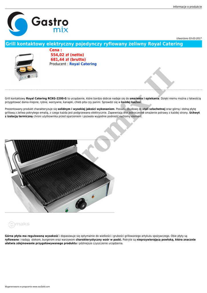Informacje o produkcie Utworzono 03-03-2017 Grill kontaktowy elektryczny pojedynczy ryflowany żeliwny Royal Catering Cena : 554,02 zł (netto) 681,44 zł (brutto) II Producent : Royal Catering ix Grill kontaktowy Royal Catering RCKG-2200-G to urządzenie, które bardzo dobrze nadaje się do smażenia i opiekania. Dzięki niemu można z łatwością przygotować dania mięsne, rybne, warzywne, kanapki, chleb pita czy panini. Sprawdzi się w każdej kuchni. G as tr o m Prezentowany produkt charakteryzuje się solidnym i wysokiej jakości wykonaniem. Posiada obudowę ze stali szlachetnej oraz górną i dolną płytę grillową z żeliwa pokrytego emalią, z czego każda jest podgrzewana elektrycznie. Zapewniają one jednoczesne smażenie potrawy z każdej strony. Uchwyt z izolacją termiczną chroni użytkownika przed oparzeniem i pozwala wygodnie podnieść ruchomy element. Górna płyta ma regulowaną wysokość i dopasowuje się optymalnie do wielkości i grubości grillowanego artykułu spożywczego. Obie płyty są ryflowane i nadają stekom, burgerom oraz warzywom charakterystyczny wzór w paski. Pokryte są nieprzywierającą powłoką, która znacznie ułatwia zdejmowanie przygotowywanego produktu i późniejsze czyszczenie urządzenia. Wygenerowano w programie www.oscGold.com II ix m Dzięki bezstopniowej regulacji temperatury można przyrządzać dania w sposób komfortowy. Dwie lampki kontrolne wskazujące moc i grzanie informują o gotowości grilla do pracy. tr o Sprzęty marki Royal Catering cechuje wytrzymałość i staranne wykonanie, dlatego grill kontaktowy RCKG-2200-G został objęty długim okresem gwarancji. Model RCKG-2200-G Nr katalogowy 1245 Stan artykułu Nowy Materiał płyt grillowych Ryflowane płyty żeliwne pokryte emalią Materiał obudowy Stal nierdzewna Napięcie as Wymiary płyty grzewczej (DxS) 23 x 34 cm 230 V Moc 2200 W Wymiary (DxSxW) Waga 33 x 42,8 x 50,5 cm 17,9 kg 43 x 52 x 26,5 cm Waga wysyłki 19,2 kg G Wymiary wysyłki (DxSxW)