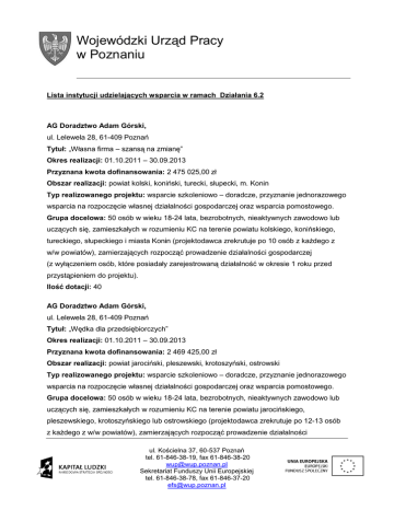 Wojewódzki Urząd Pracy w Poznaniu Lista instytucji udzielających wsparcia w ramach Działania 6.2 AG Doradztwo Adam Górski, ul. Lelewela 28, 61-409 Poznań Tytuł: „Własna firma – szansą na zmianę” Okres realizacji: 01.10.2011 – 30.09.2013 Przyznana kwota dofinansowania: 2 475 025,00 zł Obszar realizacji: powiat kolski, koniński, turecki, słupecki, m. Konin Typ realizowanego projektu: wsparcie szkoleniowo – doradcze, przyznanie jednorazowego wsparcia na rozpoczęcie własnej działalności gospodarczej oraz wsparcia pomostowego. Grupa docelowa: 50 osób w wieku 18-24 lata, bezrobotnych, nieaktywnych zawodowo lub uczących się, zamieszkałych w rozumieniu KC na terenie powiatu kolskiego, konińskiego, tureckiego, słupeckiego i miasta Konin (projektodawca zrekrutuje po 10 osób z każdego z w/w powiatów), zamierzających rozpocząć prowadzenie działalności gospodarczej (z wyłączeniem osób, które posiadały zarejestrowaną działalność w okresie 1 roku przed przystąpieniem do projektu). Ilość dotacji: 40 AG Doradztwo Adam Górski, ul. Lelewela 28, 61-409 Poznań Tytuł: „Wędka dla przedsiębiorczych” Okres realizacji: 01.10.2011 – 30.09.2013 Przyznana kwota dofinansowania: 2 469 425,00 zł Obszar realizacji: powiat jarociński, pleszewski, krotoszyński, ostrowski Typ realizowanego projektu: wsparcie szkoleniowo – doradcze, przyznanie jednorazowego wsparcia na rozpoczęcie własnej działalności gospodarczej oraz wsparcia pomostowego. Grupa docelowa: 50 osób w wieku 18-24 lata, bezrobotnych, nieaktywnych zawodowo lub uczących się, zamieszkałych w rozumieniu KC na terenie powiatu jarocińskiego, pleszewskiego, krotoszyńskiego lub ostrowskiego (projektodawca zrekrutuje po 12-13 osób z każdego z w/w powiatów), zamierzających rozpocząć prowadzenie działalności ul. Kościelna 37, 60-537 Poznań tel. 61-846-38-19, fax 61-846-38-20 [email protected] Sekretariat Funduszy Unii Europejskiej tel. 61-846-38-78, fax 61-846-37-20 [email protected] gospodarczej (z wyłączeniem osób, które posiadały zarejestrowaną działalność w okresie 1 roku przed przystąpieniem do projektu). Ilość dotacji: 40 Gnieźnieńska Agencja Rozwoju Gospodarczego sp z o.o. ul. Rynek 10/1, 62-200 Gniezno Tytuł: „Zielone światło dla Ciebie” Okres realizacji: 02.01.2012 – 31.12.2013 Przyznana kwota dofinansowania: 585 685,04 zł Obszar realizacji: powiat gnieźnieński, wrzesiński Typ realizowanego projektu: wsparcie szkoleniowo – doradcze, przyznanie jednorazowego wsparcia na rozpoczęcie własnej działalności gospodarczej oraz wsparcia pomostowego. Grupa docelowa: Grupę docelową stanowić będą osoby niepełnosprawne z obszaru powiatu gnieźnieńskiego i wrzesińskiego w przedziale wiekowym od 15 – 64 lat, zarówno pracujące jak i bezrobotne, chcące podjąć własną działalność gospodarczą, które nie prowadziły własnej dział. gosp. w ciągu ostatnich 12 mc przed przystąpieniem do projektu. Do projektu zostanie zakwalifikowane 10 osób niepełnosprawnych (5K i 5M), dotacje inwestycyjną otrzyma 6 osób (3K i 3M) Ilość dotacji: 6 ul. Kościelna 37, 60-537 Poznań tel. 61-846-38-19, fax 61-846-38-20 [email protected] Sekretariat Funduszy Unii Europejskiej tel. 61-846-38-78, fax 61-846-37-20 [email protected]