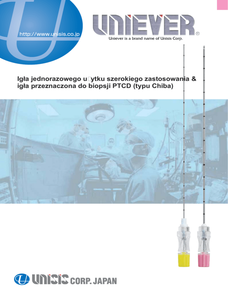 Igła jednorazowego użytku szerokiego zastosowania & igła przeznaczona do biopsji PTCD (typu Chiba) Igła j. uż. szerokiego zastosowania i do biopsji (typu Chiba) Bogata gama oferowanych rozmiarów do szerokiego zastosowania. Igła uniwersalna (typu Chiba) pierwotnie zaprojektowana dla potrzeb PTCD znajduje obecnie coraz szersze zastosowanie, m.in. przy zabiegach biopsji czy też podawaniu kontrastu. Przywiązujemy duża wagę aby nasze igły posiadały ostre ścięcie, były elastyczne przy zachowaniu maksymalnej cienkości ścianek. Cechy te są szczególnie charakterystyczne dla igieł typu Chiba. Uwaga: Igła typu Chiba została zaprojektowana przez prof. KUNIO OKUDA z Uniwersytetu Chiba w Japonii. Cechy Ścięcie ostrza Igła 22G w różnych typach i o różnej głębokości wkłucia z powłoką nylonową. Siła Ostrość, celność, różnorodność Igła typu Chiba jest prosta i bardzo ostra dzięki czemu pozwala na łatwe wprowadzenie względnie głęboko w ciało pacjenta. Szeroki zakres rozmiarów i długości stworzony został z myślą o różnych wymogach w zależności od miejsca wkłucia. Igły Unisis podlegają ścisłej i szczegółowej kontroli produkcji. Back-cut point (krótkie ścięcie) Końcówka ostrza posiada podwójne ścięcie wyprofilowane zarówno po prawej jak i lewej stronie co zapewnia znakomitą jakość wkłucia poprzez zdolność prostego wgłębiania dzięki czemu minimalizuje powstawanie uszkodzenia tkanek. Dodatkowo, zastosowanie cienkościennej kaniuli ułatwia elastyczność wkłucia. Cięcie Kąt ścięcia ostrza Krótkie ostrze o standardowym kącie ścięcia 300 minimalizuje uszkodzenia tkanki w miejscu wkłucia. Przywiązujemy ogromną wagę do wyeliminowania problemów t.j. miażdzenia tkanki pomiędzy ostrzem a prowadnicą. Cienkie ścianki Zastosowanie najnowocześniejszych cienkościennych materiałów zaowocowało zwiększeniem elastyczności i możliwości manipulacji niezbędnej dla igieł typu Chiba. Wraz z inowacyjnie zaprojektowanym uchwytem wpływa to na łatwość wykonania zabiegu i samą aspirację w miejscu wkłucia. Różnego rodzaju ścięcie ostrza Oferujemy dwa rodzaje ścięcia ostrza igły: - pod kątem 200 - zapewniają doskonałe, ostre wkłucie - pod katem 300 - (przy ostrzu krótkim) gwarantują odpowiedni opór Rozmiary Nazwy części i ich szkic mandryn osłonka Igła jednorazowego użytku szerokiego zastosowania & igła przeznaczona do biopsji PTCD (typu Chiba) nasadka mandrynu mocowanie skrzydełek Igła do PTCD do Biopsji typu Chiba igła Producent marker głębokości nasadka igły skrzydełka Gauge / G opcja 18G 18G 20G 20G 22G 22G Długość mm inch Back cut point 20' Back cut point 30' 150 200 150 200 150 200 6" 8" 6" 8" 6" 8" ** ** ** ** ** ** ** ** ** ** ** ** Pakowane indywidualnie 25 szt./karton Rodzaj sterylizacji E.O.G. (3 lata) ** - produkt na zamówienie