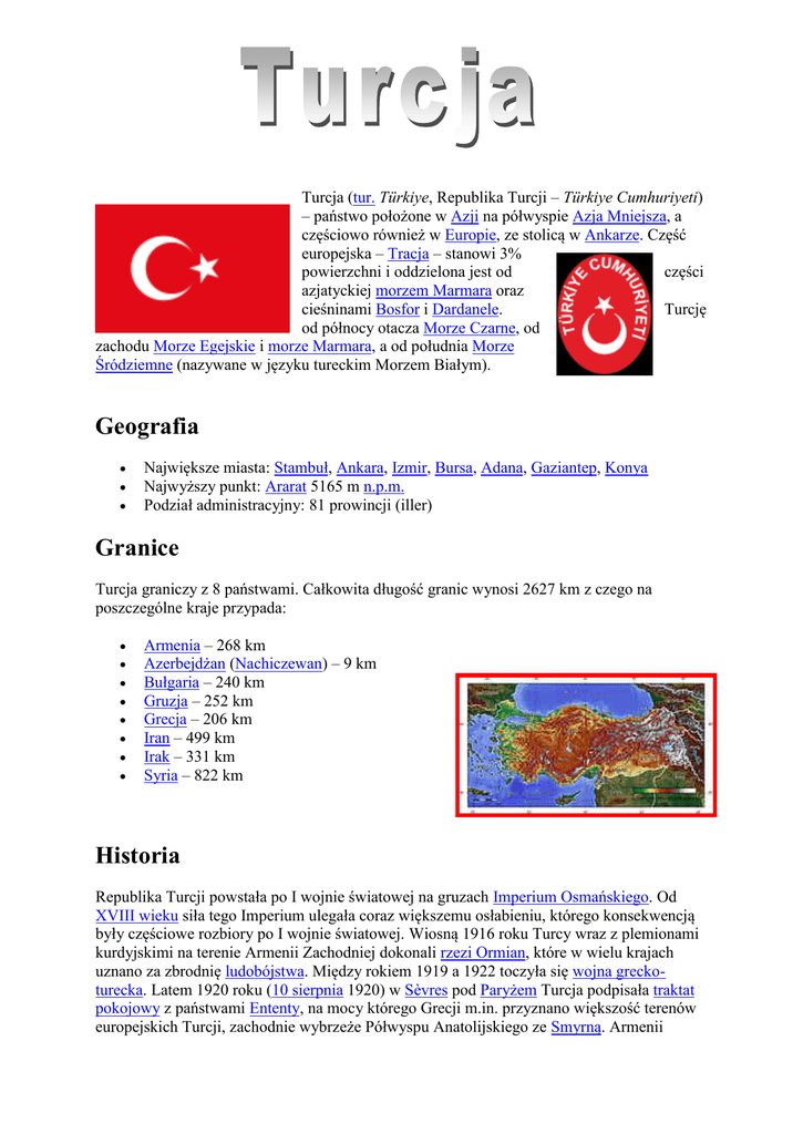 Turcja (tur. Türkiye, Republika Turcji – Türkiye Cumhuriyeti) – państwo położone w Azji na półwyspie Azja Mniejsza, a częściowo również w Europie, ze stolicą w Ankarze. Część europejska – Tracja – stanowi 3% powierzchni i oddzielona jest od części azjatyckiej morzem Marmara oraz cieśninami Bosfor i Dardanele. Turcję od północy otacza Morze Czarne, od zachodu Morze Egejskie i morze Marmara, a od południa Morze Śródziemne (nazywane w języku tureckim Morzem Białym). Geografia Największe miasta: Stambuł, Ankara, Izmir, Bursa, Adana, Gaziantep, Konya Najwyższy punkt: Ararat 5165 m n.p.m. Podział administracyjny: 81 prowincji (iller) Granice Turcja graniczy z 8 państwami. Całkowita długość granic wynosi 2627 km z czego na poszczególne kraje przypada: Armenia – 268 km Azerbejdżan (Nachiczewan) – 9 km Bułgaria – 240 km Gruzja – 252 km Grecja – 206 km Iran – 499 km Irak – 331 km Syria – 822 km Historia Republika Turcji powstała po I wojnie światowej na gruzach Imperium Osmańskiego. Od XVIII wieku siła tego Imperium ulegała coraz większemu osłabieniu, którego konsekwencją były częściowe rozbiory po I wojnie światowej. Wiosną 1916 roku Turcy wraz z plemionami kurdyjskimi na terenie Armenii Zachodniej dokonali rzezi Ormian, które w wielu krajach uznano za zbrodnię ludobójstwa. Między rokiem 1919 a 1922 toczyła się wojna greckoturecka. Latem 1920 roku (10 sierpnia 1920) w Sèvres pod Paryżem Turcja podpisała traktat pokojowy z państwami Ententy, na mocy którego Grecji m.in. przyznano większość terenów europejskich Turcji, zachodnie wybrzeże Półwyspu Anatolijskiego ze Smyrną. Armenii przyznano Kars, większą część Pontu z okręgiem Trapezunt (dzisiejszy Trabzon) i górę Ararat wraz z jeziorem Wan. Kemal Atatürk, przywódca ruchu narodowego (młodoturków), dążący do przywrócenia Turcji choć części terytoriów zabranych jej po I wojnie światowej, nie chciał pogodzić się z tym faktem i na podstawie Sojuszu o Wzajemnej Przyjaźni i Współpracy z RFSRR jesienią 1920 Turcja i Rosja Sowiecka dokonały agresji przeciwko Armenii. W 1923 miała miejsce wymiana ludności między Grecją i Turcją, w ramach której, kierując się kryteriami wyznaniowymi, a nie językowymi, przesiedlono do Turcji ok. 420 tys. osób wyznania muzułmańskiego, a do Grecji trochę mniej niż 1,5 mln. osób wyznania prawosławnego, uwzględniając przy tym liczbę wcześniejszych wychodźców z okresu wojny. Turcy imigrowali głównie z rejonów wybrzeża Morza Egejskiego, wybrzeża Morza Czarnego, oraz Kapadocji). W myśl umowy, liczne mniejszości Tureckie pozostały na terenie greckiej i bułgarskiej Tracji Zachodniej. Dalyan, Widok starożytnych grobowców 24 lipca 1923 roku traktat w Lozannie zrewidował postanowienia terytorialne traktatu z Sèvres i zminimalizował ograniczenia suwerenności Turcji do kwestii demilitaryzacji cieśnin Bosfor i Dardanele oraz pogranicza turecko-greckiego i turecko-bułgarskiego w Tracji. Traktat ten ustalił do dziś istniejące granice Turcji[3]. W 1922 zniesiono kalifat. Już wcześniej zniesiono sułtanat. W 1923 roku Turcja stała się republiką. Pierwszym prezydentem został Mustafa Kemal, nazwany później Atatürkiem. Za jego sprawą przeprowadzano liczne reformy mające na celu europeizację Turcji: zmiana prawa cywilnego, handlowego i karnego, wprowadzenie alfabetu łacińskiego zamiast arabskiego, wprowadzenia kalendarza gregoriańskiego, wprowadzenie nazwisk. W 1934 przyznano kobietom bierne i czynne prawo wyborcze. W 1935 kobiety stanowiły 4,6% parlamentarzystów. Podczas II wojny światowej Turcja pomimo zachęt włączenia się do działań zbrojnych wysuwanych przez obie strony konfliktu pozostawała neutralna. Jednym z ważniejszych powodów nieprzystępowania do wojny były niekorzystne doświadczenia konsekwencji I wojny światowej, a w szczególności obawa przed Związkiem Radzieckim. Turcja przystąpiła do obozu aliantów i wypowiedziała wojnę Rzeszy Niemieckiej dopiero w 1945. Od 1952 roku Turcja jest członkiem NATO. Od 1974 okupuje część Cypru. O laickość państwa od samego jego początku dba armia. Dlatego też w Turcji dochodziło często do zamachów stanu (w 1960, 1971, 1980 i 1997 roku). Ten czwarty miał zresztą wyjątkowo łagodny przebieg i ograniczył się do zasugerowania partiom rządzącym oddania władzy. Ostatnia interwencja generalicji w sprawy polityki miała miejsce w pierwszej połowie 2007 roku, kiedy to wybuchł kryzys polityczny związany z niemożnością wyboru prezydenta przez Zgromadzenie Narodowe. Turcja od kilkudziesięciu[potrzebne źródło] lat stara się o członkostwo w Unii Europejskiej. Proces ten napotyka jednak szereg poważnych barier. Problemem jest duża liczba mieszkańców Republiki Turcji, napięte stosunki dyplomatyczne między Turcją a Cyprem i (w mniejszym stopniu) Grecją oraz obawy o utracenie jednolitości kulturoworeligijnej państw Unii. Rolnictwo Turcja jest jednym z 6 całkowicie samowystarczalnych pod względem żywnościowym krajów świata. Rolnictwo wytwarza ok. 10% produktu krajowego brutto Turcji. Zatrudnienie w tym sektorze znajduje około 1/3 siły roboczej. W Turcji istnieje ponad 5 milionów gospodarstw rolnych. Jedynie 6% z nich ma powierzchnię większą od 20 ha. Turcja jest jednym z pięciu największych producentów: bawełny, soczewicy, cebuli, buraków cukrowych, tytoniu, pomidorów, arbuzów, jabłek, winogron, orzeszków pistacjowych, orzechów włoskich, oliwek oraz owczego mleka. Jest zarazem największym na świecie wytwórcą orzechów laskowych, moreli i fig. Obecnie sektor rolniczy wspierany jest przez rząd przy pomocy tych samych instrumentów, jakimi posługuje się Unia Europejska. Skala wsparcia jest również porównywalna. Przemysł Turcja posiada znaczne zasoby surowców mineralnych, zwłaszcza rud metali. Wydobycie rud żelaza (Divriği we wschodniej Anatolii), ch
