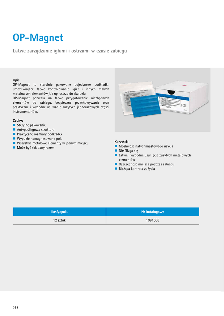 OP-Magnet Łatwe zarządzanie igłami i ostrzami w czasie zabiegu Opis OP-Magnet to sterylnie pakowane pojedyncze podkładki, umożliwiające łatwe kontrolowanie igieł i innych małych metalowych elementów jak np. ostrza do skalpela. OP-Magnet pozwala na łatwe przygotowanie niezbędnych elementów do zabiegu, bezpieczne przechowywanie oraz praktyczne i wygodne usuwanie zużytych jednorazowych części instrumentariów. Cechy: Sterylne pakowanie Antypoślizgowa struktura Praktyczne rozmiary podkładek Wypukłe namagnesowane pola Wszystkie metalowe elementy w jednym miejscu Może być składany razem 398 Korzyści: Możliwość natychmiastowego użycia Nie ślizga się Łatwe i wygodne usunięcie zużytych metalowych elementów Oszczędność miejsca podczas zabiegu Bieżąca kontrola zużycia Ilość/opak. Nr katalogowy 12 sztuk 1091506