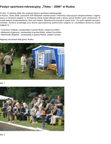 Festyn sportowo-rekreacyjny „Tłoka – 2006” w Rudce W dniu 13 sierpnia 2006 roku podczas festynu sportowo-rekreacyjnego w Rudce „Tłoka 2006” pracownik OIP Białystok udzielał porad i informacji dotyczących bezpieczeństwa i higieny pracy w rolnictwie (zdjęcie 1). W festynie udział wzięło kilkaset osób z terenu gminy Rudka i gmin ościennych. W czasie festynu przeprowadzono Quiz pod hasłem „Bezpiecznie pracuję w czasie żniw”. Do quizu zgłosiło się pięciu rolników. Konkurs przebiegał przy licznie zgromadzonej publiczności (zdjęcie 2). Laureatami konkursu zostali (zdjęcie 3): • Turkowicz Tadeusz, zamieszkały w gminie Boćki, zdobył 6 punktów , • Mieleszko Eugeniusz, zamieszkały w gminie Boćki, zdobył 5 punktów, • Mańkowski Zbigniew , zamieszkały w gminie Rudka, zdobył 3 punkty. Nagrody ufundował Wójt gminy Rudka. Zdj. 1 Zdj. 2 Zdj. 3