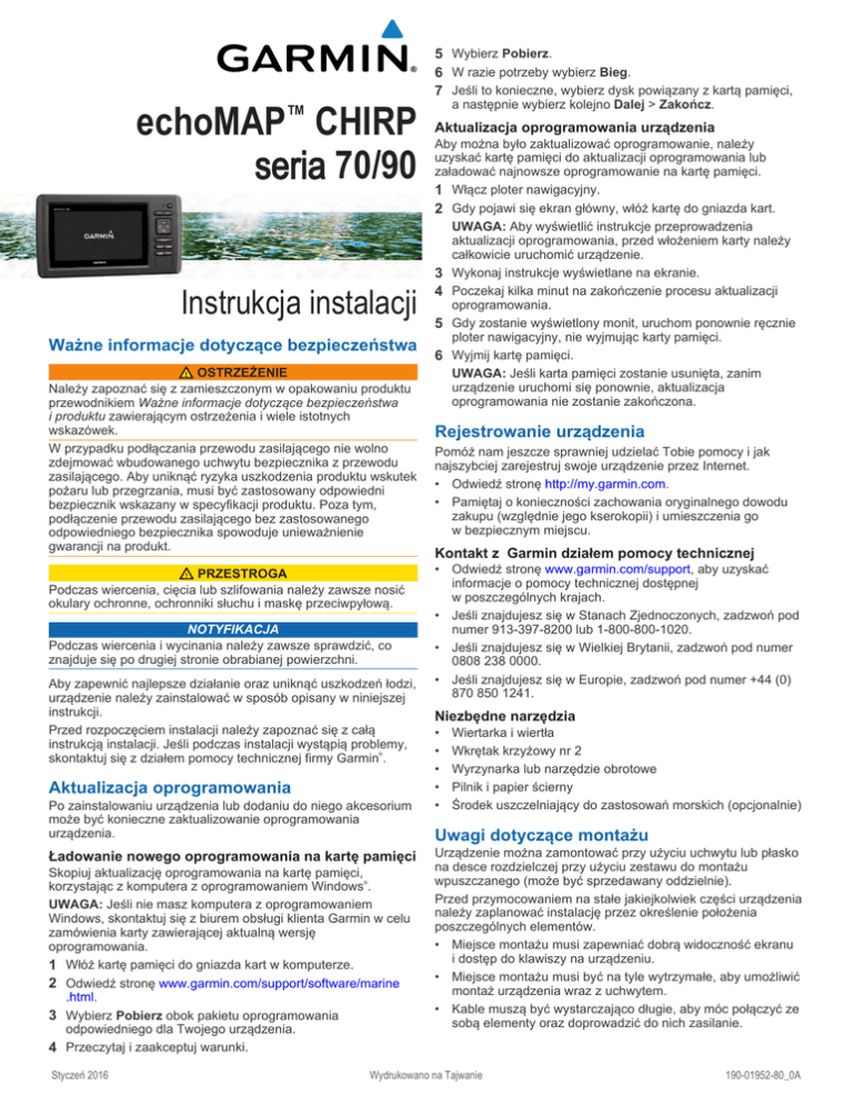 5 Wybierz Pobierz. 6 W razie potrzeby wybierz Bieg. 7 Jeśli to konieczne, wybierz dysk powiązany z kartą pamięci, echoMAP CHIRP seria 70/90 ™ Instrukcja instalacji Ważne informacje dotyczące bezpieczeństwa OSTRZEŻENIE Należy zapoznać się z zamieszczonym w opakowaniu produktu przewodnikiem Ważne informacje dotyczące bezpieczeństwa i produktu zawierającym ostrzeżenia i wiele istotnych wskazówek. W przypadku podłączania przewodu zasilającego nie wolno zdejmować wbudowanego uchwytu bezpiecznika z przewodu zasilającego. Aby uniknąć ryzyka uszkodzenia produktu wskutek pożaru lub przegrzania, musi być zastosowany odpowiedni bezpiecznik wskazany w specyfikacji produktu. Poza tym, podłączenie przewodu zasilającego bez zastosowanego odpowiedniego bezpiecznika spowoduje unieważnienie gwarancji na produkt. PRZESTROGA Podczas wiercenia, cięcia lub szlifowania należy zawsze nosić okulary ochronne, ochronniki słuchu i maskę przeciwpyłową. NOTYFIKACJA Podczas wiercenia i wycinania należy zawsze sprawdzić, co znajduje się po drugiej stronie obrabianej powierzchni. Aby zapewnić najlepsze działanie oraz uniknąć uszkodzeń łodzi, urządzenie należy zainstalować w sposób opisany w niniejszej instrukcji. Przed rozpoczęciem instalacji należy zapoznać się z całą instrukcją instalacji. Jeśli podczas instalacji wystąpią problemy, skontaktuj się z działem pomocy technicznej firmy Garmin . ® Aktualizacja oprogramowania Po zainstalowaniu urządzenia lub dodaniu do niego akcesorium może być konieczne zaktualizowanie oprogramowania urządzenia. Ładowanie nowego oprogramowania na kartę pamięci Skopiuj aktualizację oprogramowania na kartę pamięci, korzystając z komputera z oprogramowaniem Windows . UWAGA: Jeśli nie masz komputera z oprogramowaniem Windows, skontaktuj się z biurem obsługi klienta Garmin w celu zamówienia karty zawierającej aktualną wersję oprogramowania. 1 Włóż kartę pamięci do gniazda kart w komputerze. 2 Odwiedź stronę www.garmin.com/support/software/marine .html. 3 Wybierz Pobierz obok pakietu oprogramowania odpowiedniego dla Twojego urządzenia. 4 Przeczytaj i zaakceptuj warunki. ® Styczeń 2016 a następnie wybierz kolejno Dalej > Zakończ. Aktualizacja oprogramowania urządzenia Aby można było zaktualizować oprogramowanie, należy uzyskać kartę pamięci do aktualizacji oprogramowania lub załadować najnowsze oprogramowanie na kartę pamięci. 1 Włącz ploter nawigacyjny. 2 Gdy pojawi się ekran główny, włóż kartę do gniazda kart. UWAGA: Aby wyświetlić instrukcje przeprowadzenia aktualizacji oprogramowania, przed włożeniem karty należy całkowicie uruchomić urządzenie. 3 Wykonaj instrukcje wyświetlane na ekranie. 4 Poczekaj kilka minut na zakończenie procesu aktualizacji oprogramowania. 5 Gdy zostanie wyświetlony monit, uruchom ponownie ręcznie ploter nawigacyjny, nie wyjmując karty pamięci. 6 Wyjmij kartę pamięci. UWAGA: Jeśli karta pamięci zostanie usunięta, zanim urządzenie uruchomi się ponownie, aktualizacja oprogramowania nie zostanie zakończona. Rejestrowanie urządzenia Pomóż nam jeszcze sprawniej udzielać Tobie pomocy i jak najszybciej zarejestruj swoje urządzenie przez Internet. • Odwiedź stronę http://my.garmin.com. • Pamiętaj o konieczności zachowania oryginalnego dowodu zakupu (względnie jego kserokopii) i umieszczenia go w bezpiecznym miejscu. Kontakt z Garmin działem pomocy technicznej • Odwiedź stronę www.garmin.com/support, aby uzyskać informacje o pomocy technicznej dostępnej w poszczególnych krajach. • Jeśli znajdujesz się w Stanach Zjednoczonych, zadzwoń pod numer 913-397-8200 lub 1-800-800-1020. • Jeśli znajdujesz się w Wielkiej Brytanii, zadzwoń pod numer 0808 238 0000. • Jeśli znajdujesz się w Europie, zadzwoń pod numer +44 (0) 870 850 1241. Niezbędne narzędzia • • • • • Wiertarka i wiertła Wkrętak krzyżowy nr 2 Wyrzynarka lub narzędzie obrotowe Pilnik i papier ścierny Środek uszczelniający do zastosowań morskich (opcjonalnie) Uwagi dotyczące montażu Urządzenie można zamontować przy użyciu uchwytu lub płasko na desce rozdzielczej przy użyciu zestawu do montażu wpuszczanego (może być sprzedawany oddzielnie). Przed przymocowaniem na stałe jakiejkolwiek części urządzenia należy zaplanować instalację przez określenie położenia poszczególnych elementów. • Miejsce montażu musi zapewniać dobrą widoczność ekranu i dostęp do klawiszy na urządzeniu. • Miejsce montażu musi być na tyle wytrzymałe, aby umożliwić montaż urządzenia wraz z uchwytem. • Kable muszą być wystarczająco długie, aby móc połączyć ze sobą elementy oraz doprowadzić do nich zasilanie. Wydrukowano na Tajwanie 190-01952-80_0A • Kable można poprowadzić od spodu uchwytu pałąkowego lub z tyłu urządzenia. • Aby uniknąć zakłóceń kompasu magnetycznego, urządzenia nie należy instalować w odległości mniejszej niż bezpieczny dystans dla kompasu podany w danych technicznych produktu. Montaż urządzenia na uchwycie pałąkowym NOTYFIKACJA W przypadku montażu wspornika na włóknie szklanym przy użyciu śrub zalecane jest użycie wiertła z pogłębiaczem stożkowym do nawiercenia otworów przejściowych tylko w górnej warstwie żelkotu. Pozwoli to uniknąć popękania warstwy żelkotu po dokręceniu śrub. Śruby ze stali nierdzewnej mogą się zakleszczyć, gdy zostaną wkręcone w włókno szklane i zbyt mocno dokręcone. Firma Garmin zaleca zastosowanie smaru przeciw zacieraniu się przed dokręcaniem śrub. 1 Wybierz elementy montażowe odpowiednie dla powierzchni montażowej oraz dla wspornika do montażu na uchwycie pałąkowym. Używając wspornika do montażu na uchwycie pałąkowym 2 jako szablonu, oznacz otwory prowadzące przez otwory śrub. montażowymi istnieje niewielki odstęp, a wycięcie zbyt dużego otworu może spowodować problemy ze stabilnością urządzenia po 