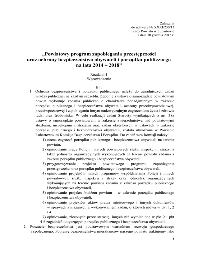 Załącznik do uchwały Nr XXXI/230/13 Rady Powiatu w Lubartowie z dnia 30 grudnia 2013 r. „Powiatowy program zapobiegania przestępczości oraz ochrony bezpieczeństwa obywateli i porządku publicznego na lata 2014 – 2018” Rozdział 1 Wprowadzenie § 1. 1. Ochrona bezpieczeństwa i porządku publicznego należy do zasadniczych zadań władzy publicznej na każdym szczeblu. Zgodnie z ustawą o samorządzie powiatowym powiat wykonuje zadania publiczne o charakterze ponadgminnym w zakresie porządku publicznego i bezpieczeństwa obywateli, ochrony przeciwpowodziowej, przeciwpożarowej i zapobiegania innym nadzwyczajnym zagrożeniom życia i zdrowia ludzi oraz środowiska. W celu realizacji zadań Starosty wynikających z art. 38a ustawy o samorządzie powiatowym w zakresie zwierzchnictwa nad powiatowymi służbami, inspekcjami i strażami oraz zadań określonych w ustawach w zakresie porządku publicznego i bezpieczeństwa obywateli, została utworzona w Powiecie Lubartowskim Komisja Bezpieczeństwa i Porządku. Do zadań w/w komisji należy: 1) ocena zagrożeń porządku publicznego i bezpieczeństwa obywateli na terenie powiatu, 2) opiniowanie pracy Policji i innych powiatowych służb, inspekcji i straży, a także jednostek organizacyjnych wykonujących na terenie powiatu zadania z zakresu porządku publicznego i bezpieczeństwa obywateli, 3) przygotowywanie projektu powiatowego programu zapobiegania przestępczości oraz porządku publicznego i bezpieczeństwa obywateli, 4) opiniowanie projektów innych programów współdziałania Policji i innych powiatowych służb, inspekcji i straży oraz jednostek organizacyjnych wykonujących na terenie powiatu zadania z zakresu porządku publicznego i bezpieczeństwa obywateli, 5) opiniowanie projektu budżetu powiatu - w zakresie porządku publicznego i bezpieczeństwa obywateli, 6) opiniowanie projektów aktów prawa miejscowego i innych dokumentów w sprawach związanych z wykonywaniem zadań, o których mowa w pkt 1, 2 i 4, 7) opiniowanie, zleconych przez starostę, innych niż wymienione w pkt 2 i pkt 4-6 zagadnień dotyczących porządku publicznego i bezpieczeństwa obywateli. 2. Poczucie bezpieczeństwa jest podstawowym warunkiem rozwoju gospodarczego i społecznego. Poprawę bezpieczeństwa mieszkańców naszego powiatu traktujemy jako 1 jeden z nieodzownych czynników rozwoju powiatu, miasta czy gminy. Obowiązujące ustawodawstwo stwarza warunki ku temu, by samorząd mógł się angażować w działalność na rzecz jego poprawy. Na podstawie analizy problemów w zakresie porządku publicznego i bezpieczeństwa obywateli został opracowany „Powiatowy program zapobiegania przestępczości oraz ochrony bezpieczeństwa obywateli i porządku publicznego na lata 2014 – 2018” dla Powiatu Lubartowskiego Jest to kompleksowe opracowanie zawierające sprecyzowane cele i sposoby ich realizacji. Wdrożenie programu zapewni wzrost poczucia bezpieczeństwa mieszkańców powiatu. Samodzielnie żaden podmiot czy instytucja związane ze sferą bezpieczeństwa nie są w stanie powstrzymać szerzącego się chuligaństwa, wandalizmu czy patologii. Tylko zaangażowanie wszystkich podmiotów oraz zorganizowane działanie podporządkowane określonemu programowi może przynieść poprawę tego stanu rzeczy. 3. Program Powiatu Lubartowskiego ma ograniczać skalę zjawisk i zachowań, które budzą powszechny sprzeciw i wpływają na wzrost poczucia zagrożenia. Jego zadaniem jest koordynacja i usprawnienie współdziałania pomiędzy różnymi podmiotami na rzecz poprawy bezpieczeństwa i porządku publicznego. Podstawą realizacji programu są regularne i specjalistyczne działania prowadzone przez jednostki i służby działające na rzecz powiatu. Aby przyniosły one pożądany skutek należy odpowiednio ukierunkować i określić zakres działań, kompetencji i odpowiedzialności wszystkich podmiotów zaangażowanych w realizację programu. Rozdział 2 Cele programu § 2. 1. Celem nadrzędnym opracowanego programu jest poprawa stanu i poczucia bezpieczeństwa mieszkańców Powiatu Lubartowskiego oraz stworzenie powiatowego systemu planowania, koordynacji i monitorowania działań w zakresie bezpieczeństwa i porządku publicznego. Cele ten wyłania się diagnozy sytuacji na terenie Powiatu Lubartowskiego sporządzonej na podstawie informacji przekazanych przez powiatowe inspekcje, służby i straże w zakresie porządku publicznego i bezpieczeństwa. Na cel nadrzędny składają się określone poniżej cele szczegółowe programu, których realizacja przyczyni się do osiągnięcia celu nadrzędnego: 1) ograniczenie ilości przestępstw i wykroczeń, zapewnienie bezpieczeństwa w miejscach publicznych i w miejscu zamieszkania; 2) zapewnienie bezpieczeństwa w ruchu drogowym; 3) ograniczenie patologii społecznych i przeciwdziałanie przemocy w rodzinie; 4) zapewnienie bezpieczeństwa dzieci i młodzieży; 5) zapewnienie bezpieczeństwa sanitarno-epidemiologicznego; 6) zapewnienie bezpieczeństwa przeciwpożarowego; 7) zapewnienie bezpieczeństwa weterynaryjnego; 8) przygotowanie mieszkańców powiatu do sprawnego reagowania w sytuacjach kryzysowych; 9) zapewnienie bezpieczeństwa w sieci. 2 2. Szczególny nacisk kładzie się na aspekt bezpieczeństwa publicznego, który dotyczy zwalczania przestępczości. Podejmowane są również inicjatywy mające na celu usuwanie przyczyn zagrożeń. Wymaga to podejmowania, obok działań represyjnych, także działań prewencyjnych i wychowawczych. 3. Program ma z założenia charakter dynamiczny i w toku realizacji powyższych celów będą przyjmowane inne propozycje bądź rozwiązania, o które program będzie można rozszerzyć. Rozdział 3 Obszary działania § 3. 1. Ograniczenie ilości przestępstw i wykroczeń, zapewnienie bezpieczeństwa w miejscach publicznych i w miejscu zamieszkania. 2. Sposoby realizacji celu: 1) stały monitoring miejsc zagrożonych; 2) analiza zagrożeń bezpieczeń