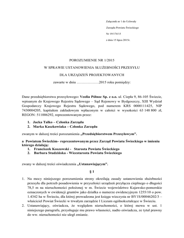 Załącznik nr 1 do Uchwały Zarządu Powiatu Świeckiego Nr 19/174/15 z dnia 15 lipca 2015r. POROZUMIENIE NR 1/2015 W SPRAWIE USTANOWIENIA SŁUŻEBNOŚCI PRZESYŁU DLA URZĄDZEŃ PROJEKTOWANYCH zawarte w dniu ………………2015 roku pomiędzy: Dane przedsiębiorstwa przesyłowego: Veolia Północ Sp. z o.o. ul. Ciepła 9, 86-105 Świecie, wpisanym do Krajowego Rejestru Sądowego – Sąd Rejonowy w Bydgoszczy, XIII Wydział Gospodarczy Krajowego Rejestru Sądowego, pod numerem KRS 0000111425, NIP 7430004205, kapitałem zakładowym wpłaconym w całości w wysokości 63 148 800 zł, REGON: 511006292, reprezentowanym przez: 1. Jacka Talko – Członka Zarządu 2. Marka Kaszkowiaka – Członka Zarządu zwanym w dalszej treści porozumienia „Przedsiębiorstwem Przesyłowym”. a Powiatem Świeckim– reprezentowanym przez Zarząd Powiatu Świeckiego w imieniu którego działają: 1. Franciszek Koszowski - Starosta Powiatu Świeckiego 2. Barbara Studzińska - Wicestarosta Powiatu Świeckiego zwany w dalszej treści oświadczenia „Ustanawiającym”. §1 1. Na mocy niniejszego porozumienia strony określają zasady ustanowienia służebności przesyłu dla potrzeb posadowienia w przyszłości urządzeń przyłącza cieplnego o długości 78,5 m na nieruchomości położonej w m. Świecie województwo Kujawsko-pomorskie oznaczonych w ewidencji gruntów jako działka o numerze ewidencyjnym 1255/10 o pow. 1.4342 ha w Świeciu, dla której prowadzona jest księga wieczysta nr BY1S/00046202/3 – właściciel Powiat Świecki w trwałym zarządzie I Liceum ogólnokształcące w Świeciu. 2. Ustanawiający, oświadcza, że względem nieruchomości, o której mowa w ust. 1 niniejszego paragrafu, przysługuje mu prawo własności, nadto oświadcza, ze tytuł prawny do ww. nieruchomości nie uległ zmianie. §2 1. Ustanawiający zobowiązuje się do ustanowienia na nieruchomości opisanej w § 1 ust. 1 niniejszego porozumienia (nieruchomości obciążone), za jednorazowym wynagrodzeniem w wysokości 600 zł (słownie złotych: sześćset złotych) netto (płatne przed dokonaniem wpisu w księdze wieczystej) na rzecz Przedsiębiorstwa Przesyłowego nieograniczoną w czasie służebność przesyłu polegającą na: 1) prawie do korzystania z nieruchomości obciążonych w zakresie niezbędnym do posadowienia na nich w przyszłości urządzeń przyłącza cieplnego o długości 78,5 m, zgodnie z załącznikiem graficznym 2) znoszeniu istnienia posadowionych na nieruchomościach obciążonych urządzeń, o których mowa w pkt. 1, po ich posadowieniu, prawie do korzystania z nieruchomości obciążonych w zakresie niezbędnym do dokonywania konserwacji, remontów, modernizacji, 3) usuwania awarii oraz przebudowy urządzeń, o których mowa w pkt 1 i pkt 2, wraz prawem wejścia i wjazdu na teren odpowiednim sprzętem przez pracowników Przedsiębiorstwa Przesyłowego oraz przez wszystkie podmioty i osoby, którymi Przedsiębiorstwo Przesyłowe posługuje się w związku z prowadzoną działalnością. 2. Treść ust. 1 niniejszego paragrafu stanowić będzie treść zapisu o ustanowieniu służebności przesyłu dokonanego w formie aktu notarialnego. 3. Ustanowienie służebności przesyłu w formie aktu notarialnego zostanie dokonane w terminie nie dłuższym niż 5 miesięcy od dnia oddania nowoprojektowanych urządzeń do użytku. 4. Koszty związane z ustanowieniem służebności, w tym koszty zawarcia aktu notarialnego oraz wprowadzenia zmian i wpisu do księgi wieczystej ponosi Przedsiębiorstwo Przesyłowe. 5. Ustanawiający oświadcza, że nie będzie występował przeciwko Przedsiębiorstwu Przesyłowemu z roszczeniami z tytułu posadowienia i istnienia na jego nieruchomości urządzeń opisanych, o których mowa w ust. 1 niniejszego paragrafu. Treść niniejszego ustępu zostanie wprowadzona do aktu notarialnego ustanowienia służebności. 6. W przypadku robót określonych w ust. 1 pkt 3 niniejszego paragrafu, które będą skutkowały poniesieniem szkód, wysokość odszkodowania należnego Ustanawiającemu będzie ustalona na podstawie odrębnego protokołu sporządzonego przez Przedsiębiorstwo Przesyłowe i Ustanawiającego. W przypadku braku porozumienia, wysokość odszkodowania ustala się na podstawie operatu szacunkowego sporządzonego przez uprawnionego rzeczoznawcę majątkowego. Wypłata Ustanawiającemu przez Przedsiębiorstwo Przesyłowe ewentualnego odszkodowania nastąpi przelewem na rachunek bankowy wskazany przez Ustanawiającego, w terminie wcześniej z nią ustalonym w protokole, o którym mowa powyżej §3 Powyższe porozumienie stanowi oświadczenie woli o udostępnienie nieruchomości Ustanawiającego na cele budowlane w zakresie objętym niniejszym porozumieniem oraz uzgodnienie trasy przyłącza cieplnego o długości 78,5 m zgodnie z załącznikiem graficznym do niniejszego porozumienia. Prace budowlane na ww. działce należy prowadzić przy uwzględnieniu poniższych warunków: - prace należy prowadzić w wykopie otwartym, - odtworzyć nawierzchnię betonową i tereny ziemne po wykonanych robotach, - grunt po wykopach należy zagęścić do wskaźnika zagęszczenia zbliżonego do 1,0, - po zakończonych robotach, teren doprowadzić pod względem technicznym i estetycznym do stanu przed robotami. Rozpoczęcie i zakończenie robót należy zgłosić w Starostwie Powiatowym w Świeciu. §4 Wszelkie zmiany niniejszego porozumienia wymagają formy pisemnej pod rygorem nieważności. §5 W sprawach nieuregulowanych niniejszym oświadczeniem mają zastosowanie przepisy Kodeksu Cywilnego. §6 Niniejsze porozumienie sporządzono w sześciu jednobrzmiących egzemplarzach: 2 dla Przedsiębiorstwa Przesyłowego, 4 dla Ustanawiającego. Przedsiębiorstwo Przesyłowe Ustanawiający ……………………………… …………….…………… ……………………………… …………….……………
