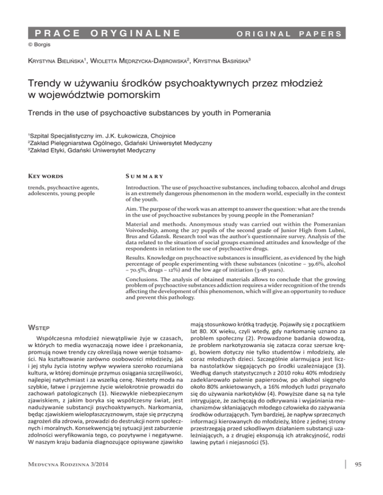 PRACE ORYGINALNE ORIGINAL PA P E R S © Borgis Krystyna Bielińska1, Wioletta Mędrzycka-Dąbrowska2, Krystyna Basińska3 Trendy w używaniu środków psychoaktywnych przez młodzież w województwie pomorskim Trends in the use of psychoactive substances by youth in Pomerania Szpital Specjalistyczny im. J.K. Łukowicza, Chojnice Zakład Pielęgniarstwa Ogólnego, Gdański Uniwersytet Medyczny 3 Zakład Etyki, Gdański Uniwersytet Medyczny 1 2 Key words Summary trends, psychoactive agents, adolescents, young people Introduction. The use of psychoactive substances, including tobacco, alcohol and drugs is an extremely dangerous phenomenon in the modern world, especially in the context of the youth. Aim. The purpose of the work was an attempt to answer the question: what are the trends in the use of psychoactive substances by young people in the Pomeranian? Material and methods. Anonymous study was carried out within the Pomeranian Voivodeship, among the 217 pupils of the second grade of Junior High from Lubni, Brus and Gdansk. Research tool was the author’s questionnaire survey. Analysis of the data related to the situation of social groups examined attitudes and knowledge of the respondents in relation to the use of psychoactive drugs. Results. Knowledge on psychoactive substances is insufficient, as evidenced by the high percentage of people experimenting with these substances (nicotine – 39.6%, alcohol – 70.5%, drugs – 12%) and the low age of initiation (3-18 years). Conclusions. The analysis of obtained materials allows to conclude that the growing problem of psychoactive substances addiction requires a wider recognition of the trends affecting the development of this phenomenon, which will give an opportunity to reduce and prevent this pathology. Wstęp Współczesna młodzież niewątpliwie żyje w czasach, w których to media wyznaczają nowe idee i przekonania, promują nowe trendy czy określają nowe wersje tożsamości. Na kształtowanie zarówno osobowości młodzieży, jak i jej stylu życia istotny wpływ wywiera szeroko rozumiana kultura, w której dominuje przymus osiągania szczęśliwości, najlepiej natychmiast i za wszelką cenę. Niestety moda na szybkie, łatwe i przyjemne życie wielokrotnie prowadzi do zachowań patologicznych (1). Niezwykle niebezpiecznym zjawiskiem, z jakim boryka się współczesny świat, jest nadużywanie substancji psychoaktywnych. Narkomania, będąc zjawiskiem wielopłaszczyznowym, staje się przyczyną zagrożeń dla zdrowia, prowadzi do destrukcji norm społecznych i moralnych. Konsekwencją tej sytuacji jest zaburzenie zdolności weryfikowania tego, co pozytywne i negatywne. W naszym kraju badania diagnozujące opisywane zjawisko Medycyna Rodzinna 3/2014 mają stosunkowo krótką tradycję. Pojawiły się z początkiem lat 80. XX wieku, czyli wtedy, gdy narkomanię uznano za problem społeczny (2). Prowadzone badania dowodzą, że problem narkotyzowania się zatacza coraz szersze kręgi, bowiem dotyczy nie tylko studentów i młodzieży, ale coraz młodszych dzieci. Szczególnie alarmująca jest liczba nastolatków sięgających po środki uzależniające (3). Według danych statystycznych z 2010 roku 40% młodzieży zadeklarowało palenie papierosów, po alkohol sięgnęło około 80% ankietowanych, a 16% młodych ludzi przyznało się do używania narkotyków (4). Powyższe dane są na tyle intrygujące, że zachęcają do odkrywania i wyjaśniania mechanizmów skłaniających młodego człowieka do zażywania środków odurzających. Tym bardziej, że napływ sprzecznych informacji kierowanych do młodzieży, które z jednej strony przestrzegają przed szkodliwym działaniem substancji uzależniających, a z drugiej eksponują ich atrakcyjność, rodzi lawinę pytań i niejasności (5). 95 Krystyna Bielińska, Wioletta Mędrzycka-Dąbrowska, Krystyna Basińska Cel pracy Celem pracy była próba odpowiedzi na pytanie: Jakie trendy występują w używaniu środków psychoaktywnych przez młodzież w województwie pomorskim? Do osiągnięcia przedstawionego celu pracy wyodrębniono następujące problemy badawcze: 1. Jaka jest wiedza gimnazjalistów na temat środków psychoaktywnych? 2. Jakie środki psychoaktywne są najczęściej używane przez młodzież? 3. Jakie czynniki według respondenta predysponują do stosowania środków psychoaktywnych? 4. Jakie formy spędzania czasu wolnego preferują gimnazjaliści? 5. Jaką postawę prezentują ankietowani wobec zajęć ukazujących wpływ środków psychoaktywnych na zdrowie? Materiał i metody Badania zostały przeprowadzone w roku szkolnym 2011/2012 wśród gimnazjalistów z terenu województwa pomorskiego. Na przeprowadzenie badań uzyskano zgody dyrektorów szkół. Przystąpienie do wypełnienia ankiety było dobrowolne. Respondentów poinformowano o anonimowości badań oraz zasadach wypełnienia kwestionariusza, w przypadku wątpliwości udzielono stosownych wyjaśnień. Ze względu na osobisty charakter niektórych pytań kwestią nadrzędną było zdobycie zaufania ankietowanych oraz zachęcenie ich do udzielania szczerych odpowiedzi. Kilkakrotnie zapewniono badanych, że żadna z wypowiedzi nie zostanie wykorzystana przeciwko nim. W celu przeprowadzenia badań zastosowano metodę sondażu diagnostycznego. Narzędziem był autorski kwestionariusz ankiety, zawierający wstęp objaśniający respondentowi, jaki jest cel badania oraz zapewnienie o jego anonimowości i poufności. Prosząc o udzielenie szczerych odpowiedzi, podkreślono ważność poruszanego problemu. Kwestionariusz składał się z dwóch części, łącznie zawierał 26 pytań. Treścią kwestionariusza były pytania otwarte oraz zamknięte z wyznaczonymi z góry możliwymi wariantami odpowiedzi. W większości pytań respondent mógł wybrać tylko jedną odpowiedź, jedno pytanie dawało szansę wyboru maksymalnie trzech odpowiedzi. Część ogólna kwestionariusza zawierała pytania metryczkowe, charak
