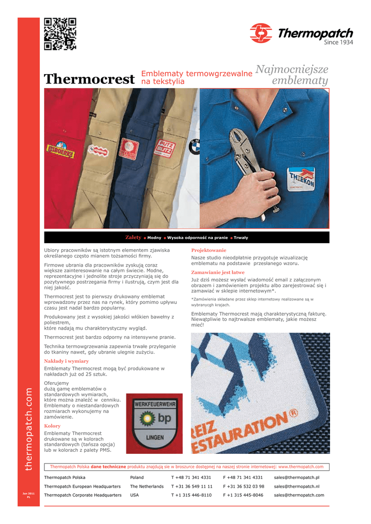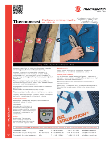 Thermocrest Emblematy termowgrzewalne na tekstylia Zalety Modny Wysoka odporność na pranie Ubiory pracowników są istotnym elementem zjawiska określanego często mianem tożsamości firmy. Najmocniejsze emblematy Trwały Projektowanie Firmowe ubrania dla pracowników zyskują coraz większe zainteresowanie na całym świecie. Modne, reprezentacyjne i jednolite stroje przyczyniają się do pozytywnego postrzegania firmy i ilustrują, czym jest dla niej jakość. Thermocrest jest to pierwszy drukowany emblemat wprowadzony przez nas na rynek, który pomimo upływu czasu jest nadal bardzo popularny. Produkowany jest z wysokiej jakości włókien bawełny z poliestrem, które nadają mu charakterystyczny wygląd. Nasze studio nieodpłatnie przygotuje wizualizację emblematu na podstawie przesłanego wzoru. Zamawianie jest łatwe Już dziś możesz wysłać wiadomość email z załączonym obrazem i zamówieniem projektu albo zarejestrować się i zamawiać w sklepie internetowym*. *Zamówienia składane przez sklep internetowy realizowane są w wybranycgh krajach. Emblematy Thermocrest mają charakterystyczną fakturę. Niewątpliwie to najtrwalsze emblematy, jakie możesz mieć! Thermocrest jest bardzo odporny na intensywne pranie. Technika termowgrzewania zapewnia trwałe przyleganie do tkaniny nawet, gdy ubranie ulegnie zużyciu. Nakłady i wymiary thermopatch.com Emblematy Thermocrest mogą być produkowane w nakładach już od 25 sztuk. Jun 2011 PL Oferujemy dużą gamę emblematów o standardowych wymiarach, które można znaleźć w cenniku. Emblematy o niestandardowych rozmiarach wykonujemy na zamówienie. Kolory Emblematy Thermocrest drukowane są w kolorach standardowych (tańsza opcja) lub w kolorach z palety PMS. Thermopatch Polska dane techniczne produktu znajdują sie w broszurce dostępnej na naszej stronie internetowej: www.thermopatch.com Thermopatch Polska Poland T +48 71 341 4331 F +48 71 341 4331 [email protected] Thermopatch European Headquarters The Netherlands T +31 36 549 11 11 F +31 36 532 03 98 [email protected] Thermopatch Corporate Headquarters USA T +1 315 446-8110 F +1 315 445-8046 [email protected]