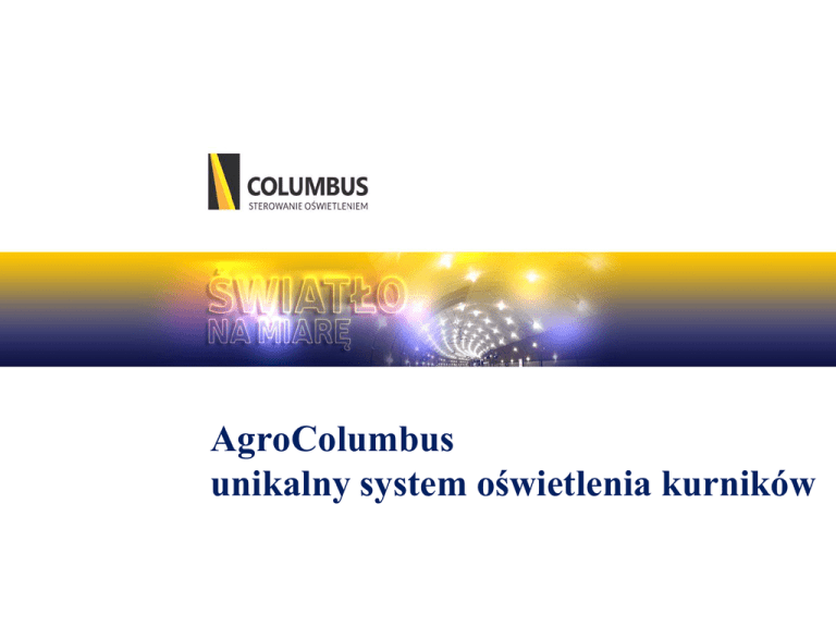 AgroColumbus unikalny system oświetlenia kurników COLUMBUS ul. J.H. Dąbrowskiego 227, 60-574 Poznań Kim jesteśmy? Firmą specjalizującą się w sterowaniu oświetleniem. Naszą ambicją jest optymalizacja oświetlenia w sposób przynoszący najwięcej korzyści i oszczędności. Dzięki wieloletniemu doświadczeniu potrafimy maksymalnie zredukować koszty oświetlenia oraz doradzić najkorzystniejsze rozwiązania. Stworzyliśmy system Columbus, który od 12 lat pozwala na elastyczne dostosowanie się do wymogów oświetleniowych każdego projektu. Specjalnie na potrzeby ferm drobiu, rozwijamy dedykowany system AgroColumbus, oraz wykorzystujemy specjalnie opracowane oprawy świetlne, przeznaczone przede wszystkim do wykorzystania działalności hodowlanej. COLUMBUS ul. J.H. Dąbrowskiego 227, 60-574 Poznań Co jest system AgroColumbus? To system sterowania i monitoringu współdziałający ze specjalnie zaprojektowanymi dwubarwnymi oprawami LED, dedykowanymi do użytkowania na fermach drobiu. Specjalnie opracowany dla hodowców kur, jest unikalną technologią, opartą na badaniach naukowych w zakresie wykorzystania światła w hodowli drobiu. Jest to jedyny w Polsce system, bazujący na sterowaniu dwu kolorowymi oprawami LED, ale umożliwiający również pracę ze światem białym. Podstawowym celem systemu AgroColumbus jest zmniejszenia kosztów energii oraz w zależności od projektu zwiększenie przyrostu wagi drobiu lub ilości znoszonych jaj. COLUMBUS ul. J.H. Dąbrowskiego 227, 60-574 Poznań AgroColumbus - Co nas wyróżnia Fachowe doradztwo. Oświetlenie, sterowanie, oprawy to tematy, którymi zajmujemy się od wielu lat. Dysponujemy wykwalikowany i kompetentnym zespołem specjalistów. Opracowując nasze technologie opieramy się na wieloletnim doświadczeniu oraz dodatkowo na wiedzy naszych zagranicznych partnerów. Indywidualne podejście do każdego projektu. Jesteśmy w stanie dopasować nasz system do Państwa wymagań, oczekiwań i doświadczeń. W zależności od Państwa potrzeb potrafimy dostarczyć rozwiązania maksymalizujące stosunek jakości do ceny lub rozwiązania najwyższej jakości. Wysoka jakość produktów, przygotowanych specjalnie dla hodowców drobiu. Ma za zadanie spełnić wymogi najbardziej wymagających klientów. Serwis i długotrwała gwarancja produktów. Innowacyjność. W naszej pracy wykorzystujemy najnowsze osiągnięcia nauki i techniki. COLUMBUS ul. J.H. Dąbrowskiego 227, 60-574 Poznań Dlaczego oświetlenie w kurnikach jest takie istotne? o Właściwe oświetlenie w kurnikach jest jednym z najbardziej niedocenianych a jednocześnie kluczowych elementów powodzenia hodowli. Ma on ogromny wpływ zarówno na udany chów jak i wysoką produkcję jaj. Zbyt mało światła we wczesnym okresie i zbyt dużo, gdy ptaki są już dorosłe, może skutkować spadkiem wydajności hodowli i w konsekwencji utratą zysków. o Obecnie w wielu kurnikach rolę głównego światła pełni światło elektryczne. Dzięki zastosowaniu nowoczesnych systemów oświetleniowych, można stworzyć warunki w których produktywność kurnika jest wyższa niż w przypadku warunków naturalnych. Operując oświetleniem możemy wpływać na różne elementy hodowli np. na poziom śmiertelności w stadzie, czy też wykorzystanie paszy. o Nowoczesne technologie zarządzania oświetleniem w przemyśle drobiarskim, nie tylko pozwalają zwiększyć przychody, ale dodatkowo pozwalają zmniejszyć koszty energii elektrycznego. Porównując do świateł żarowych oszczędności mogą osiągać nawet 90% kosztów ponoszonych przed modernizacją. COLUMBUS ul. J.H. Dąbrowskiego 227, 60-574 Poznań AgroColumbus Podstawowe informacje o systemie o LED-owy system oświetlenia AgroColumbus składa się z dwóch odmian: o Światło Niebieskie i Zielone używane w hodowli brojlerów. o Światło Białe i Czerwone używane w hodowli niosek. Niemniej na życzenie klienta, możemy również skonfigurować system oparty jedynie o światło białe. o Oświetlenie AgroColumbus jest w pełni sterowalne, czy to przez komputer, oddzielny sterownik czy też w formie manualnej. AgroColumbus umożliwia ustawienie i zmiany w czasie następujących parametrów: o Długość dnia o Natężenie oświetlenia o Kolor o Dodatkowo system AgroColumbus niedługo wzbogaci się o możliwość monitorowania i raportowania np.: odnośnie zużycia energii w poszczególnych kurnikach czy też o zepsutych oprawach. COLUMBUS ul. J.H. Dąbrowskiego 227, 60-574 Poznań AgroColumbus – Podstawowe informacje o oprawach c.1 o Oferowane przez nas oprawy świetle są najwyższej jakości. Jako jedyni na rynku dysponujemy oprawami dwu kolorowymi, co powoduje że są one tańsze niż 2 oddzielne oprawy w dwóch różnych kolorach, a jednocześnie nie wpływa to w żaden sposób na ich możliwości i trwałość. o Nominalna trwałość naszych opraw to ok 50 000 godzin, a więc 4 x więcej niż dla CFL i 30 x więcej niż dla opraw żarowych. Na nasze Lampy dajemy 5-letnią gwarancję. o Oprawy świetlne, które instalujemy na fermach drobiu są w 100% wodoszczelne i pyłoszczelne (zgodnie z normą IP67), nie wymagają w związku z tym usuwania podczas czyszczenia kurnika o Lampa LED-owa AgroColumbus jest zaprojektowana tak aby równomiernie oświetlić powierzchnię 16m2 z wysokości 3-ch metrów o Oprawy nie zawierają niebezpiecznej i trudnej do utylizacji rtęci. o Budowa lampy jest zabezpieczona patentem. COLUMBUS ul. J.H. Dąbrowskiego 227, 60-574 Poznań AgroColumbus – Podstawowe informacje o oprawach c.2 o o Oprócz oświetlenia ledowego posiadamy w swojej ofercie oprawy świetlówkowe. o Oprawy świetlówkowe T5 sterowane o płynne sterowanie od 0-10V o możliwość ustawiania poziomu natężenia światła i szybkości zmiany oświetlenia, o możliwość programowania cykli dzień/noc o 3 lata gwarancji o Oprawy świetlówkowe T8 nie sterowane ze statecznikiem elektronicznym- Philips o 1 rok gwarancji. Oprawy 